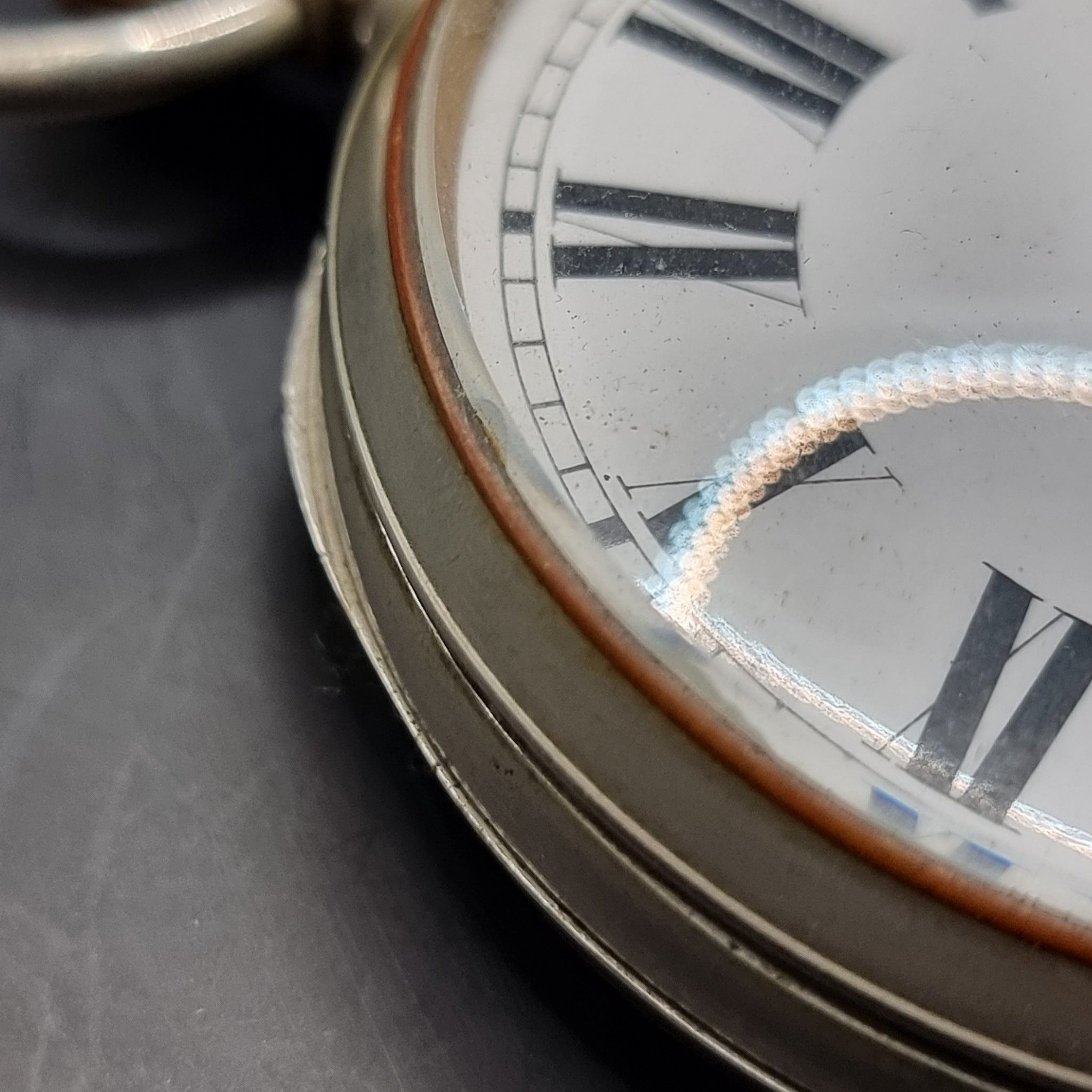 Antique Argentan Goliath Fob Pocket Watch Swiss Movement. This goliath pocket watch is in good working order. Features roman numerals on a white enamel face. The enamel face has a hair line to the XII  and a large chip out the edge by VII. The glass has a couple of chips to the edge. The plating is worn away in places. And the watch has age related wear with minor scratches and marks.