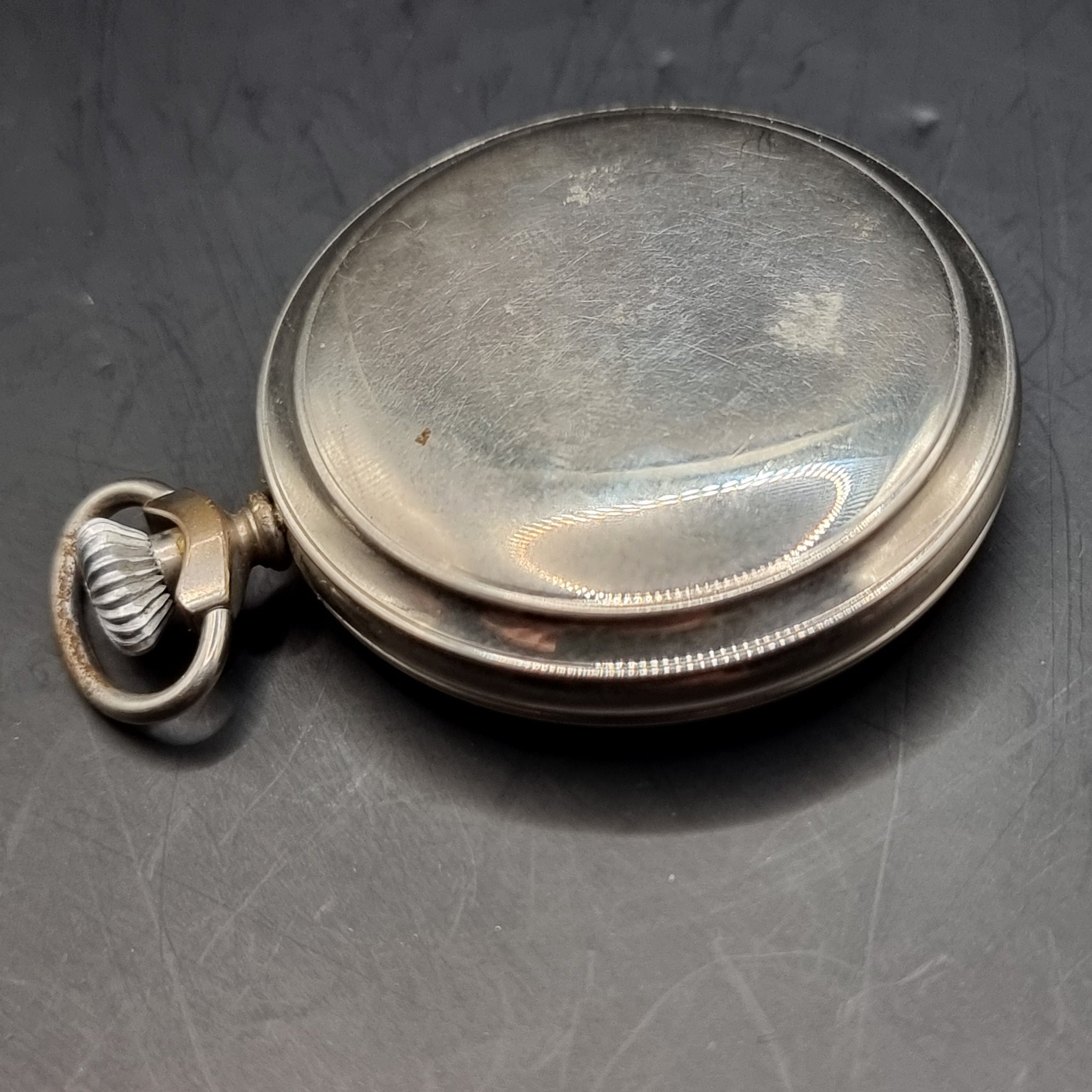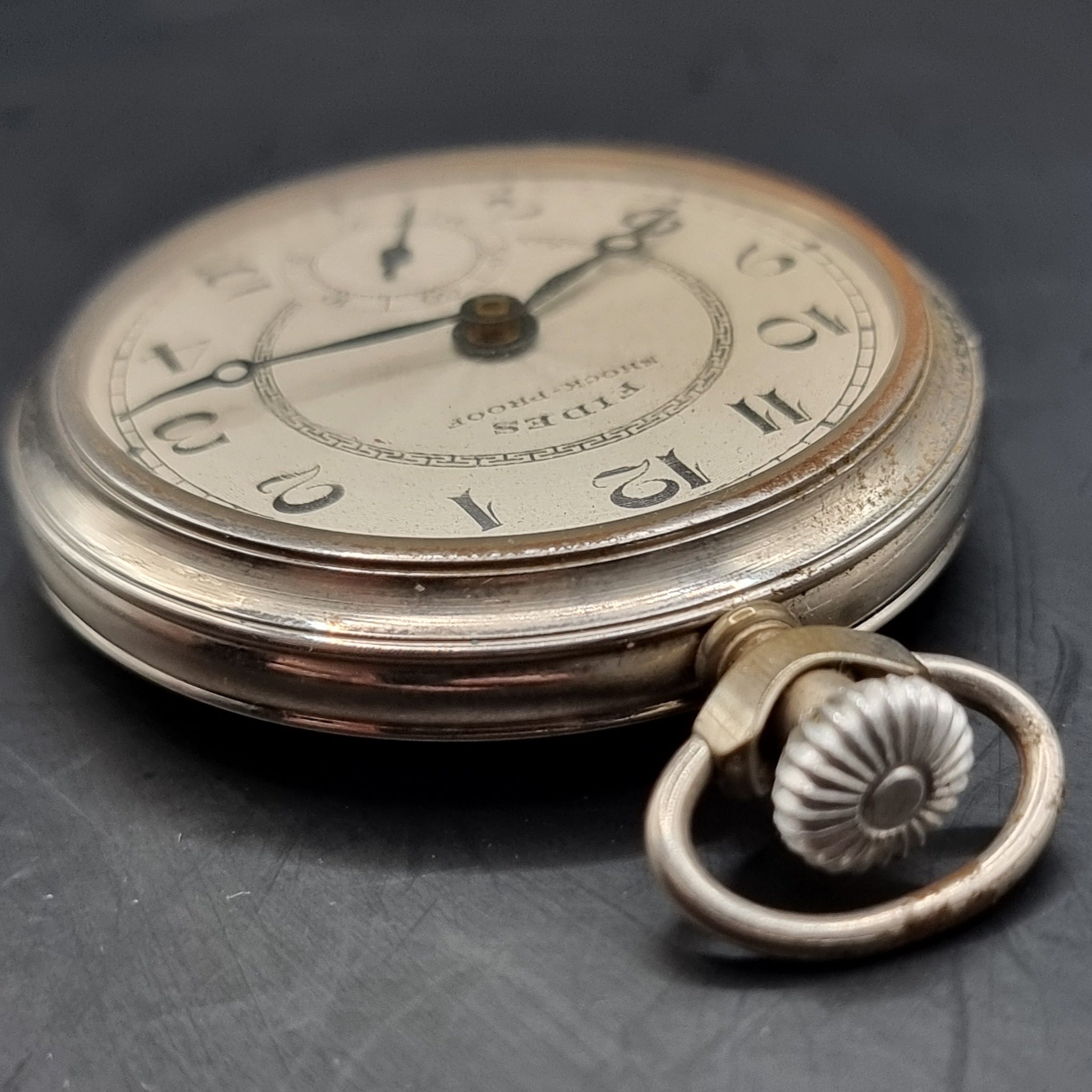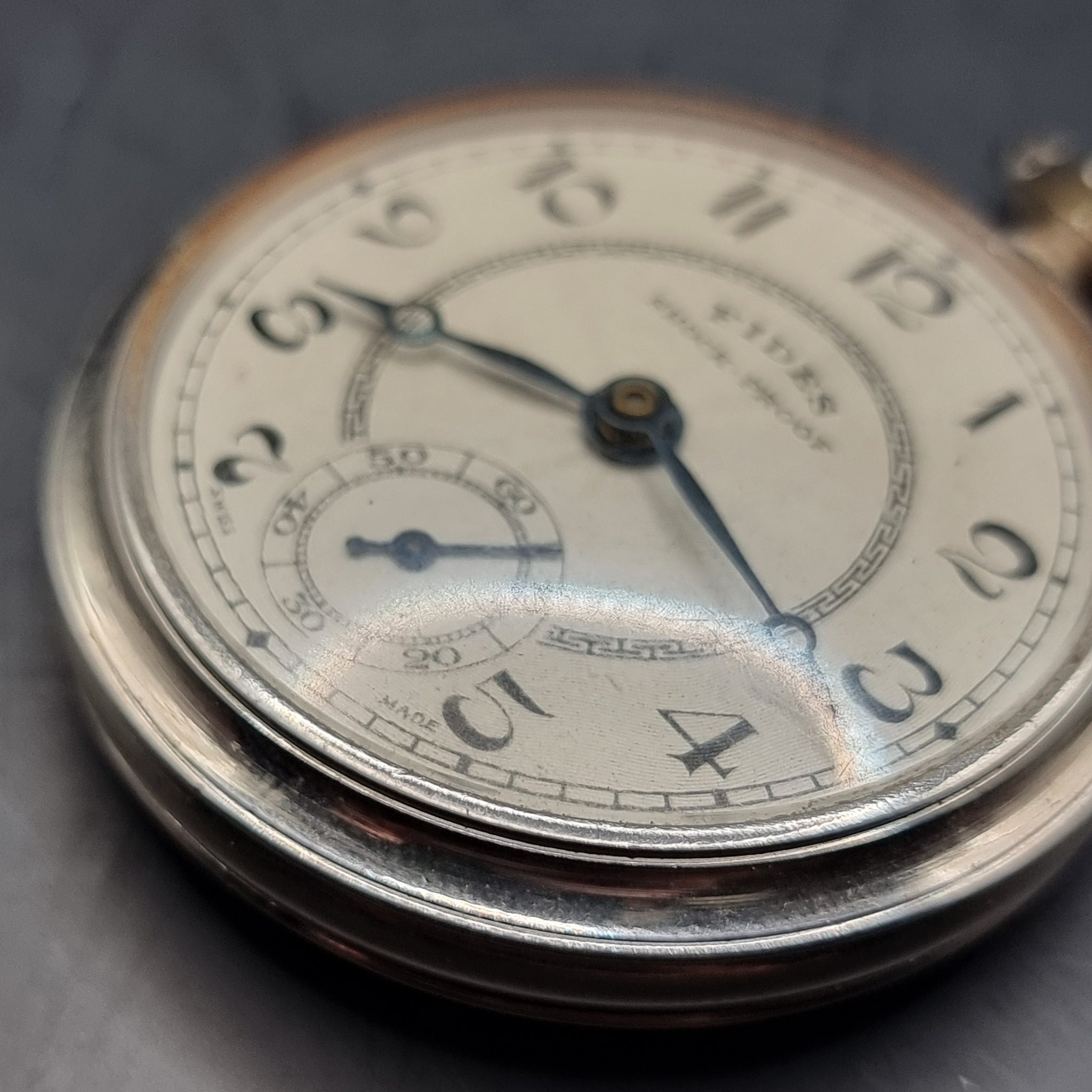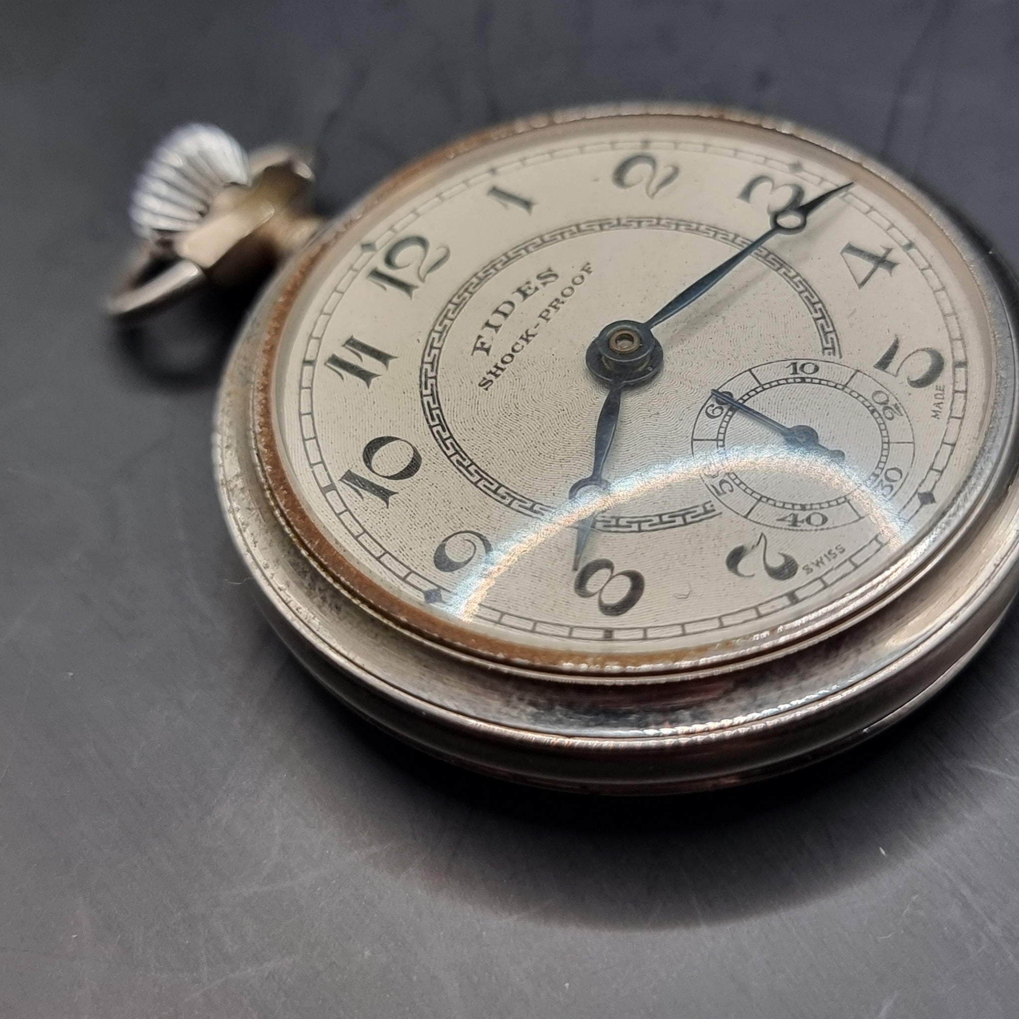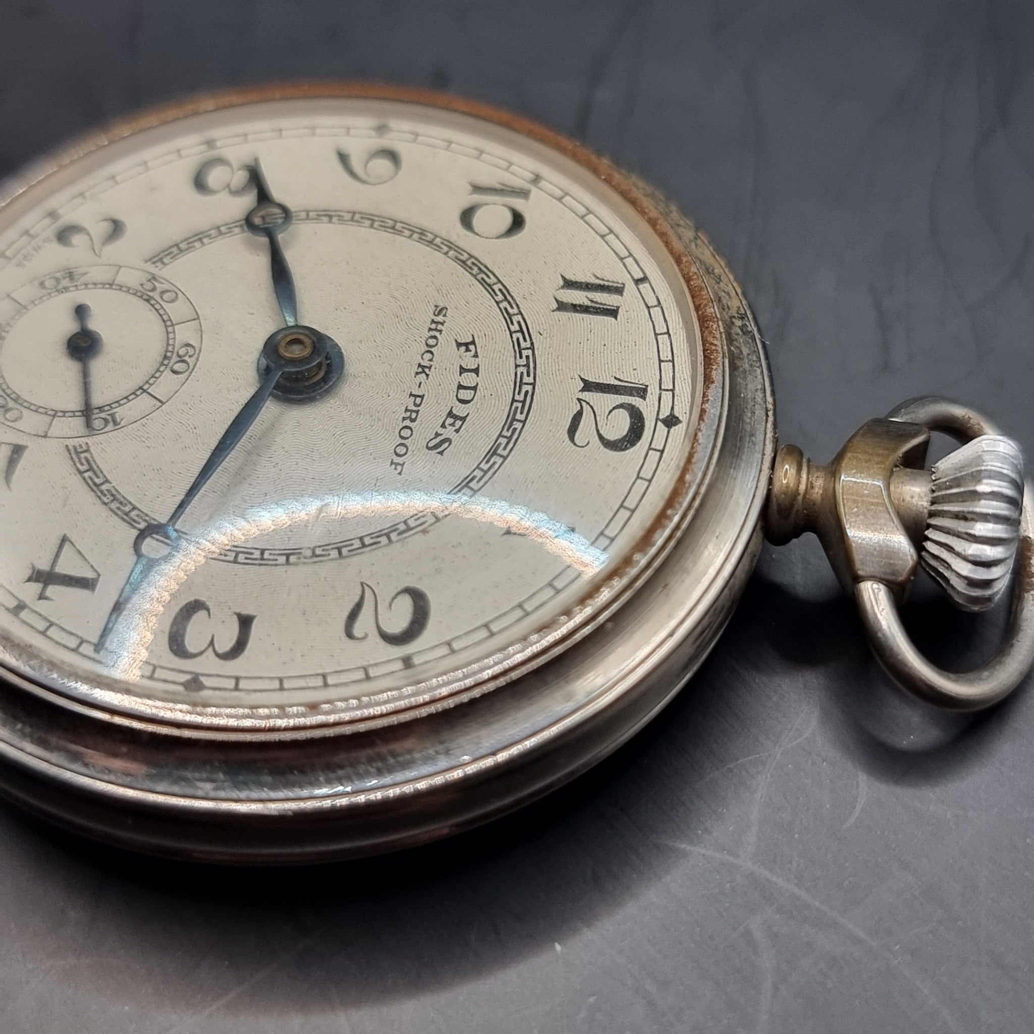Antique Art Deco Chrome Plated Fob Pocket Watch by Fides, built with a shock proof movement. This watch is in good working order. Features the Greek pattern to the centre of the watch face for infinity. Swiss made movement. The chrome casing is worn and rust marks have come through in places. Some age related wear with minor scratches and marks. But otherwise good condition.