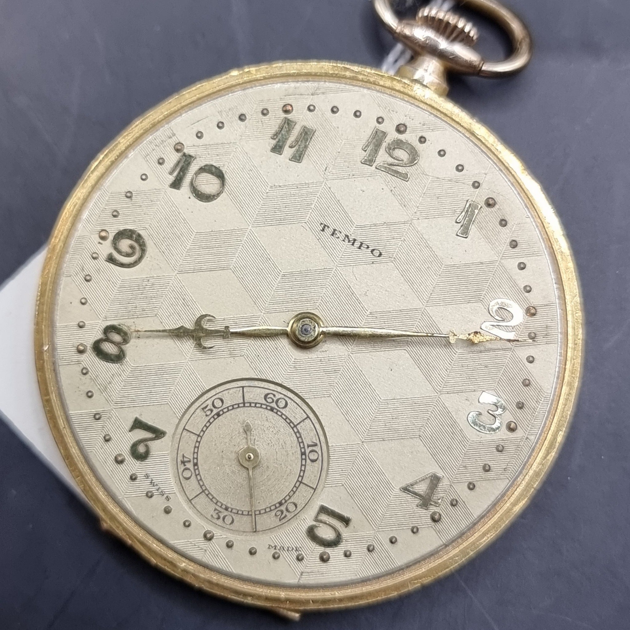 Antique Art Deco Gold Plated Tempo Fob Pocket Watch 15 Jewels. This rolled Gold Pocket watch is in great working order. Featuring Gold Art deco pattern to the watch face. Back plate is inscribed A S. On the inside has its 10 years Gold warranty stamped to it (no longer in date). This is a very stylish Pocket watch. Gold Coloured hands and numbers. The movement is a 15 jewel movement. With the winder to the top of the watch. All working smoothly. There are a few scratches to this watch. The glass has a chip to the edge. Rolled Gold plating looks to be in fantastic condition still.