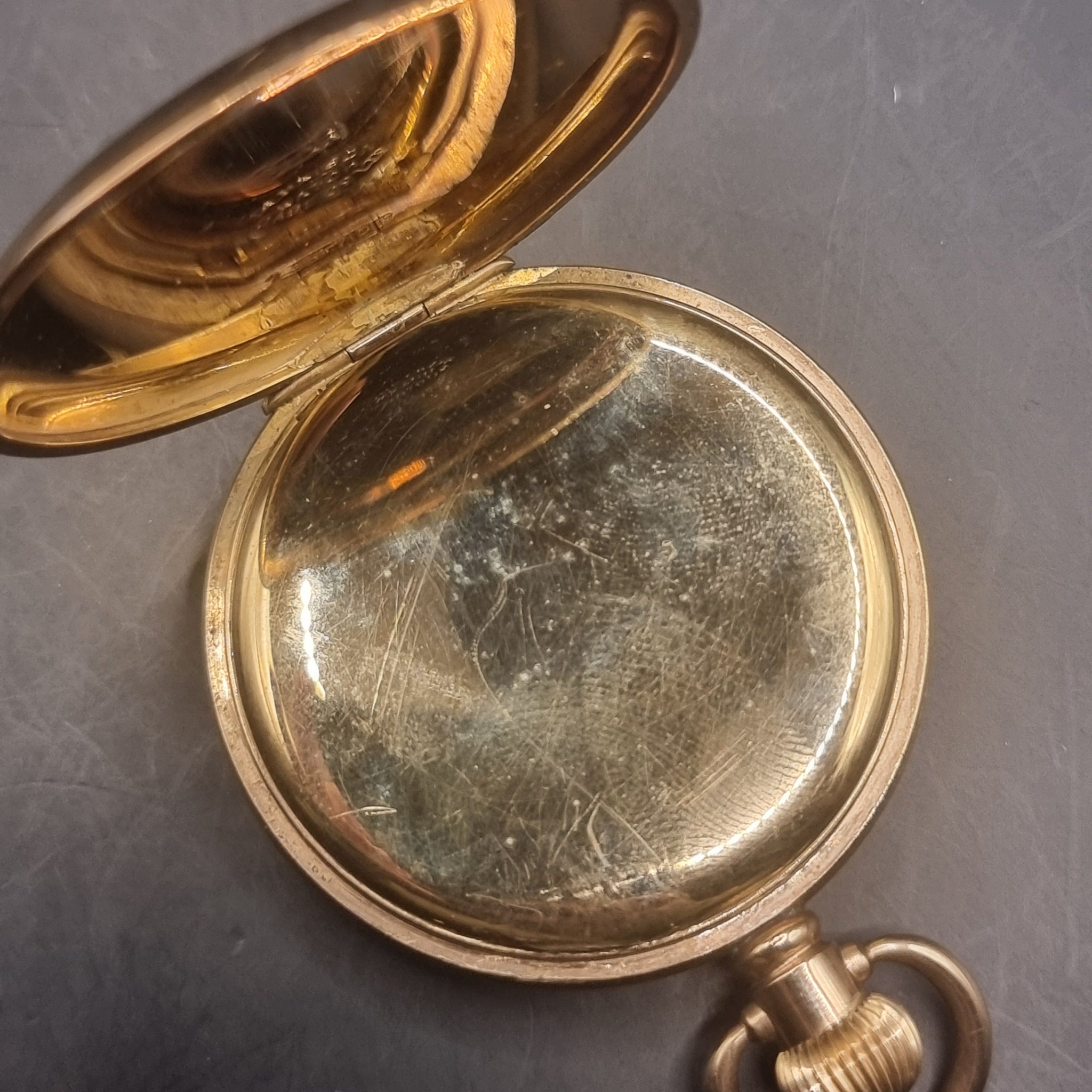 Antique Full Hunter Gold Plated Fob Pocket Watch Preston Ltd. This pocket retailed for Preston Ltd has a Swiss made Preston lever movement. Which is housed in a Dennison Star gold plated full Hunter case. The watch is in good working order. And the case has minor surface marks. Some scratch marks where tools have been used to open each section. Looks to be water marks on the inside of the front casing and on the glass. Inscribed to the front with initials and the date of 1924. Some plating coming away from the loop.