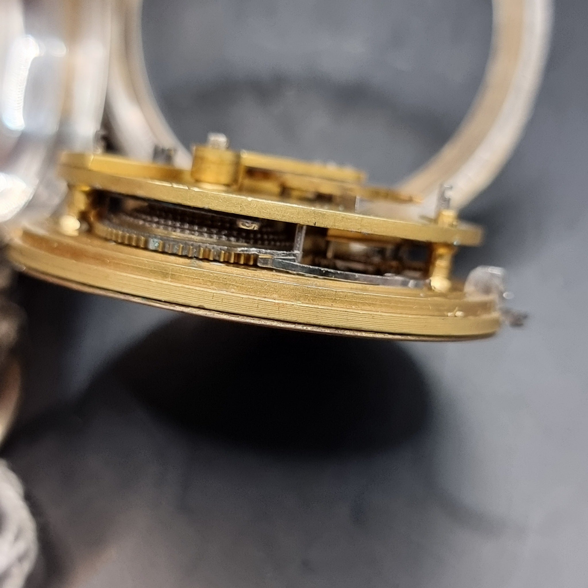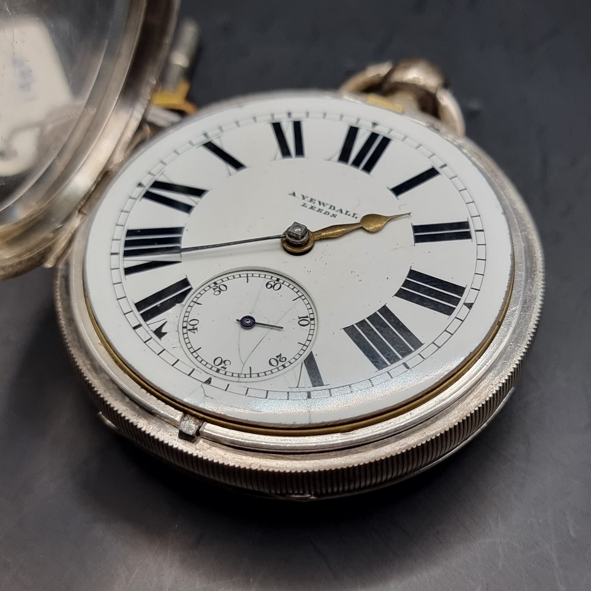 Antique Fussee Silver Fob Pocket Watch by A. Yewdall, Leeds 1900. This fussee mechanism is still in good working order made by A Yewdall of Leeds. The silver case made by J Adkins & Sons, Chester in 1900. The glass on the case is scratched over the years, with scratches and minor dents to the silver case. The enamel face has damage around the second circle with hairline cracks to it. The main face has hairline cracks to the second hand area. Weighs 197g.