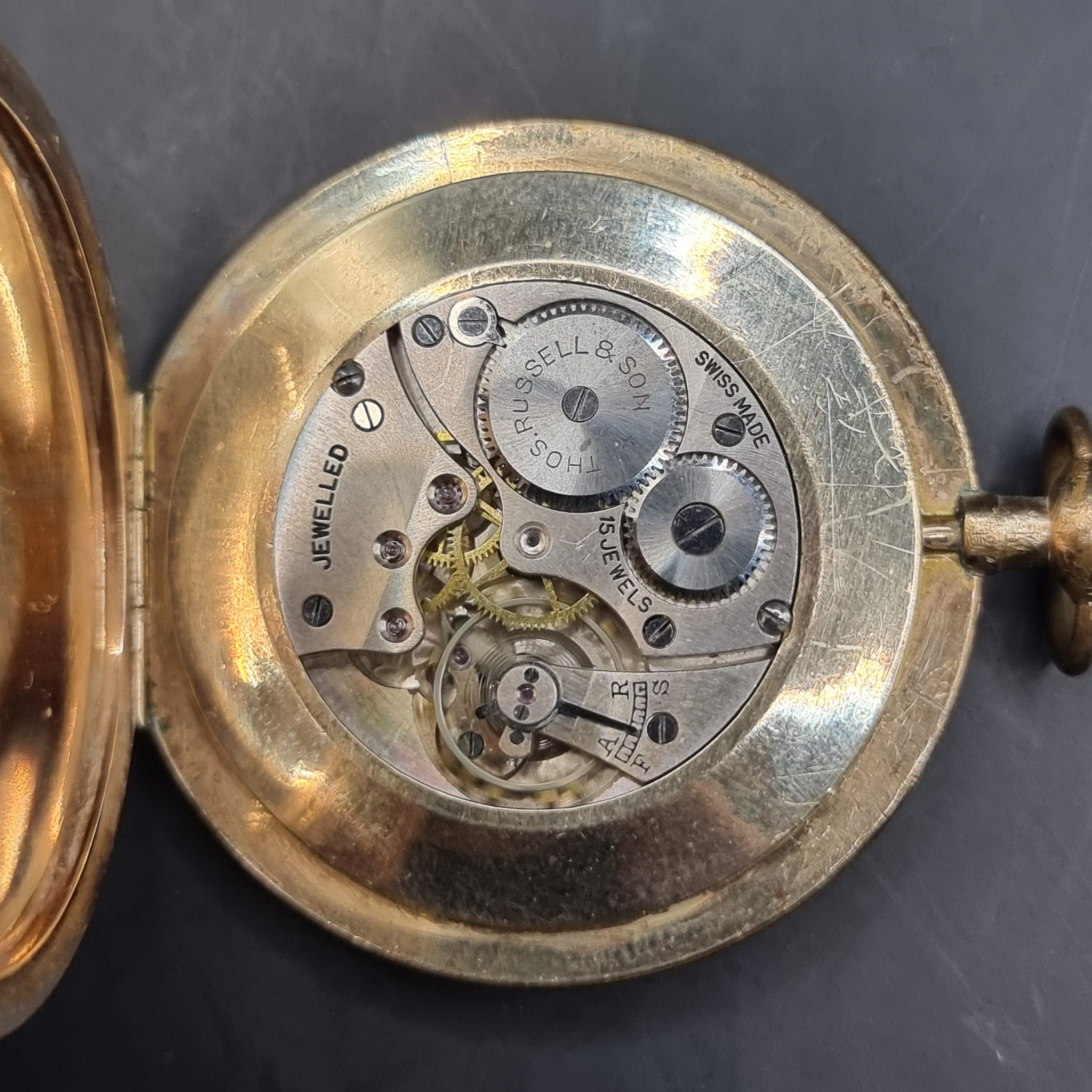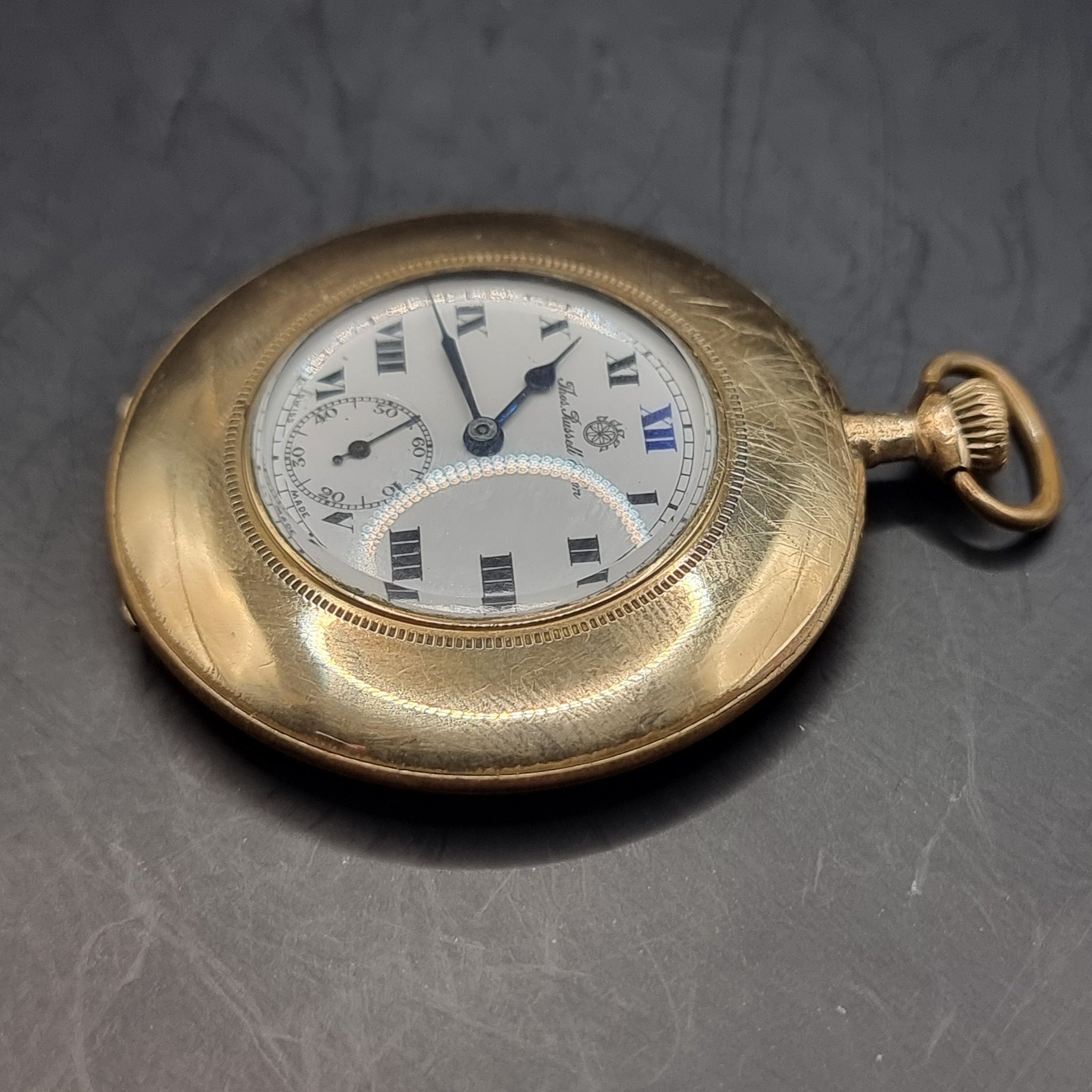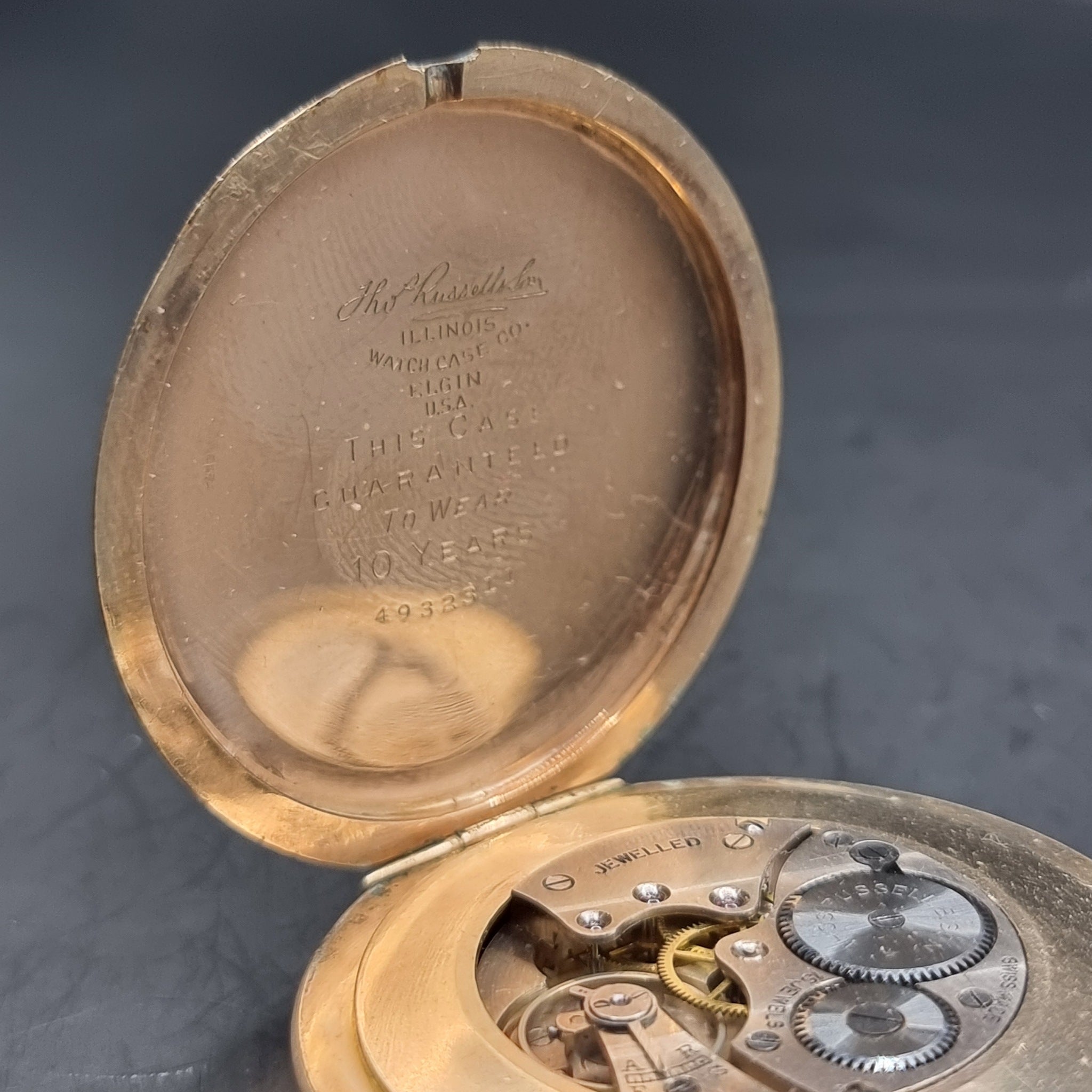 Antique Gold Plated Fob Pocket Watch by Thomas Russell and son, Elgin IIlinois Watch Comany and co gold plated case. Signed Thomas Russell and son to the inside 15 Jewels Swiss Movement. Good working order. Heavily gold plated with the casing being scratched by someone opening with tools. Plating coming off around the edge and loop.