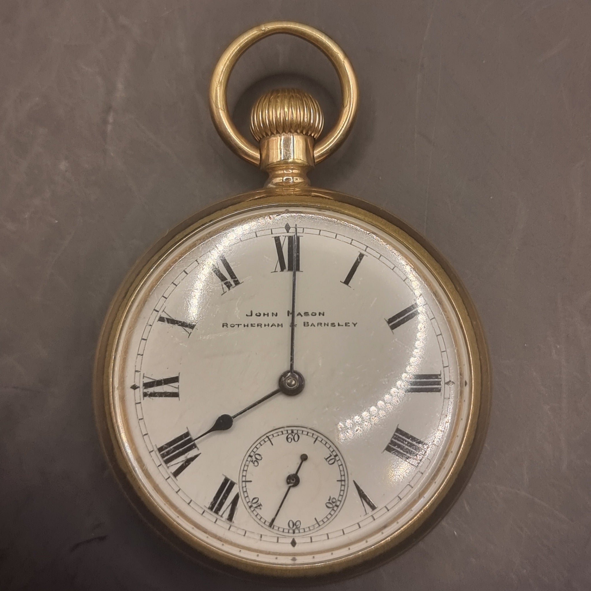 Antique Gold Plated Waltham Fob Pocket Watch by John Mason. This pocket watch is in good working order. Retailers John Mason of Rotherham and Barnsley. The movement is made by the American Waltham watch Company. Enamel face is spotless. The glass has some scratches to the surface and the gold plated case has plating thats been worn away some scratches and minor dents. Still a great looking watch.
