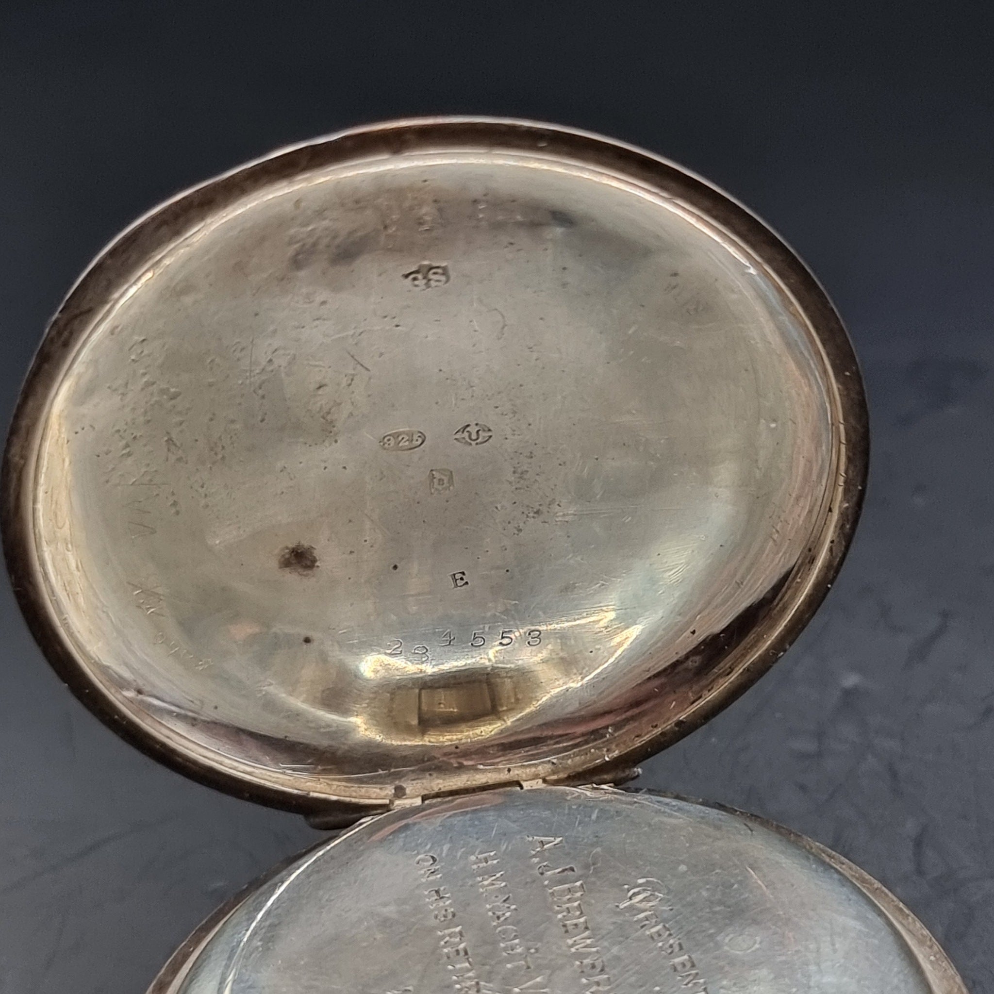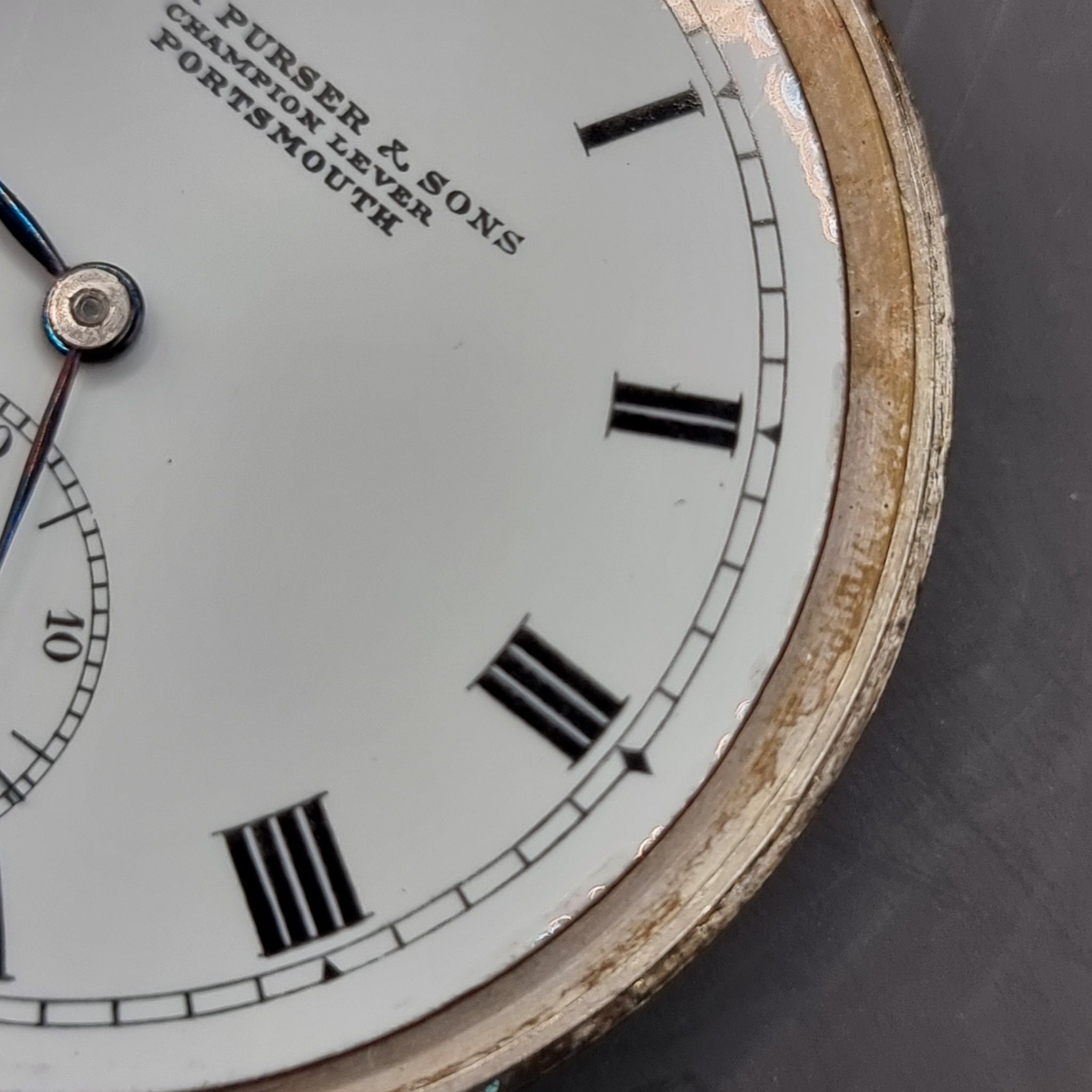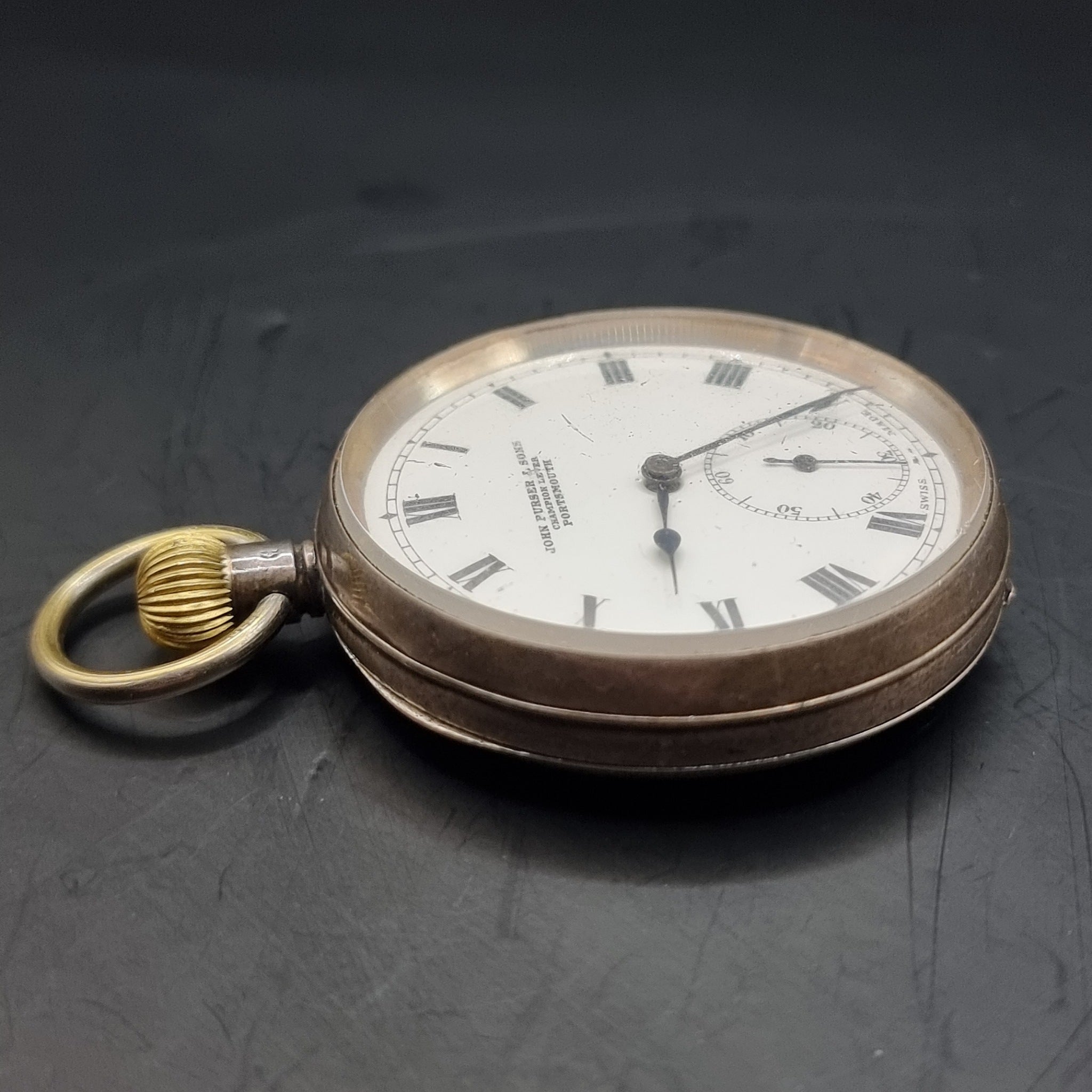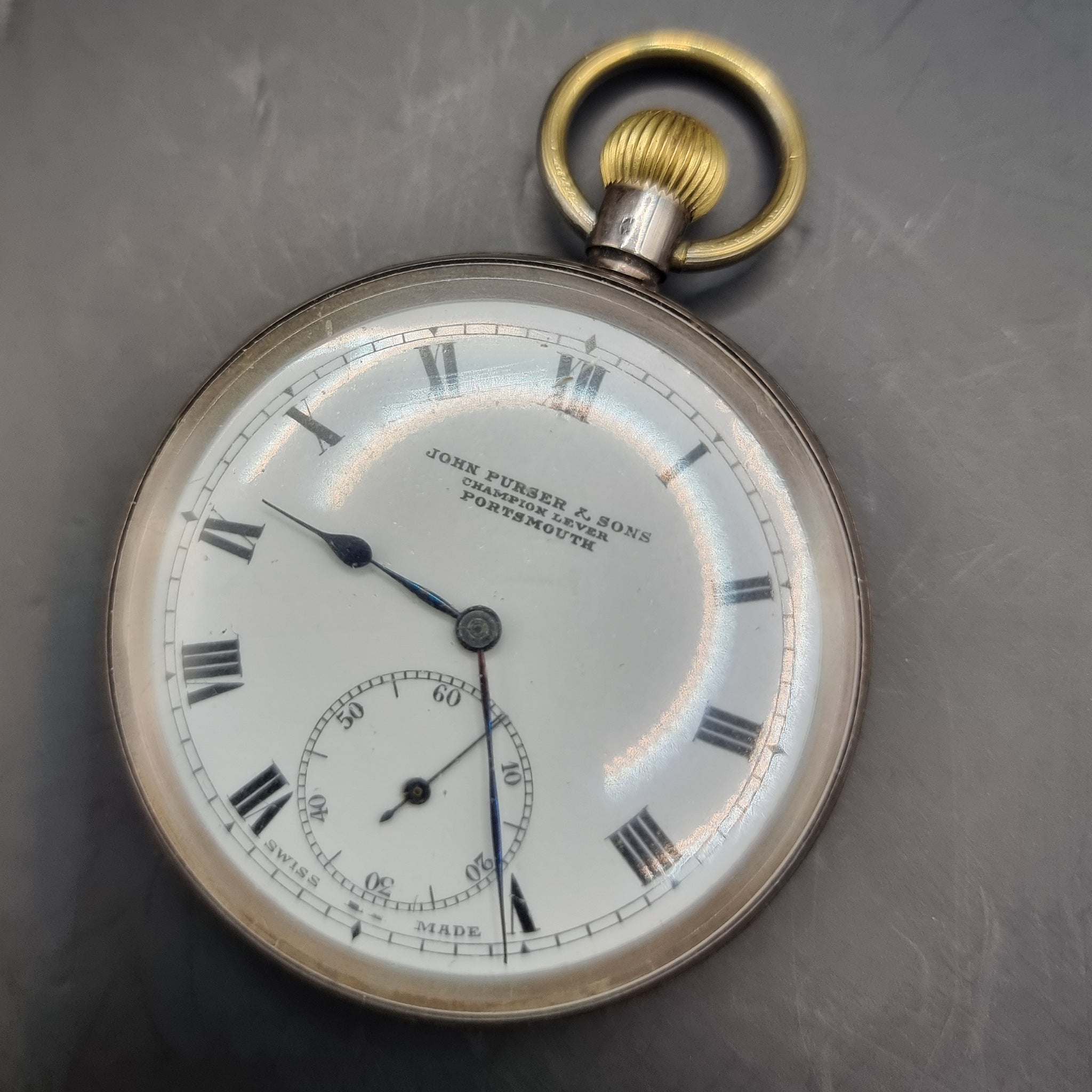 Antique Silver Fob Pocket Watch by John Purser and Sons Champion Lever 1919. Silver pocket watch casing was imported by Stockwell & Co (George Stockwell) London. Dating back to 1919. The movement is by John Purser and Sons of Portsmouth. This is the Champion Lever model. This watch was presented to A.J. Brewerton (rigger) on H.M. Yacht Victoria and Albert on his retirement on pension 12-09-1930. The watch glass is scratch, along with some areas of the casing some minor dents and rubbing to the silver. In good working order. Weighs 94g.