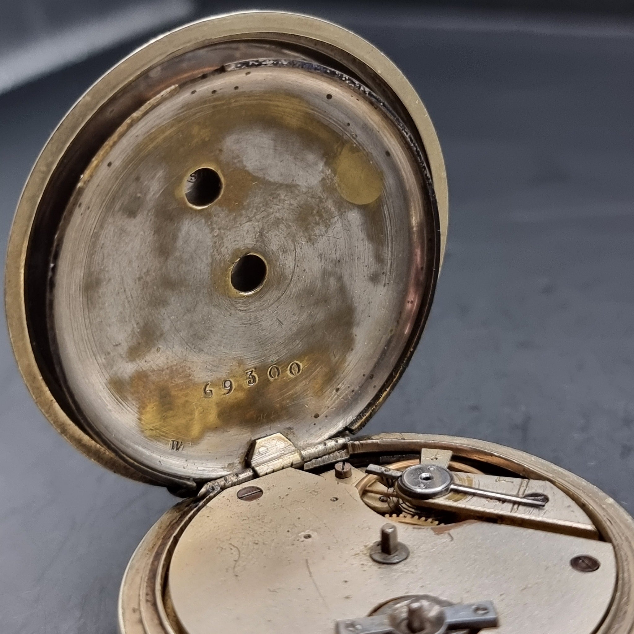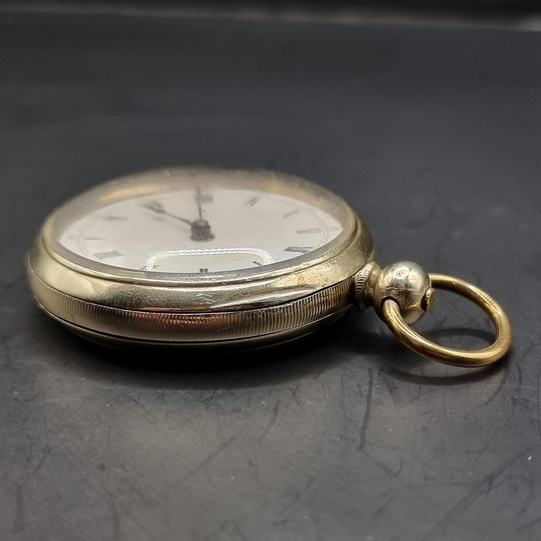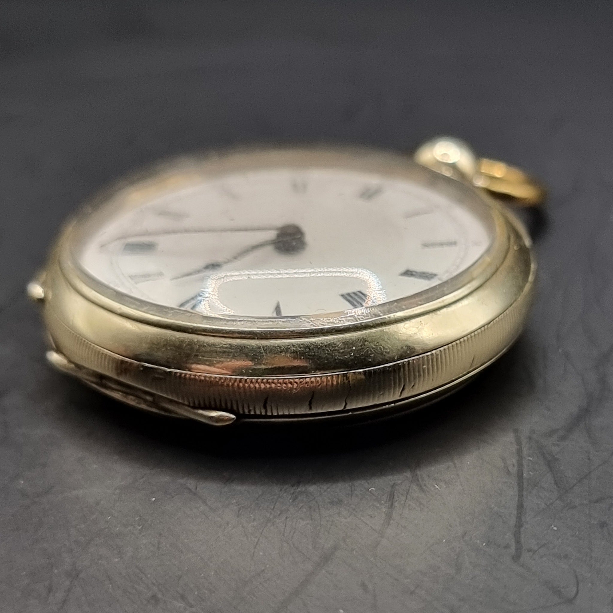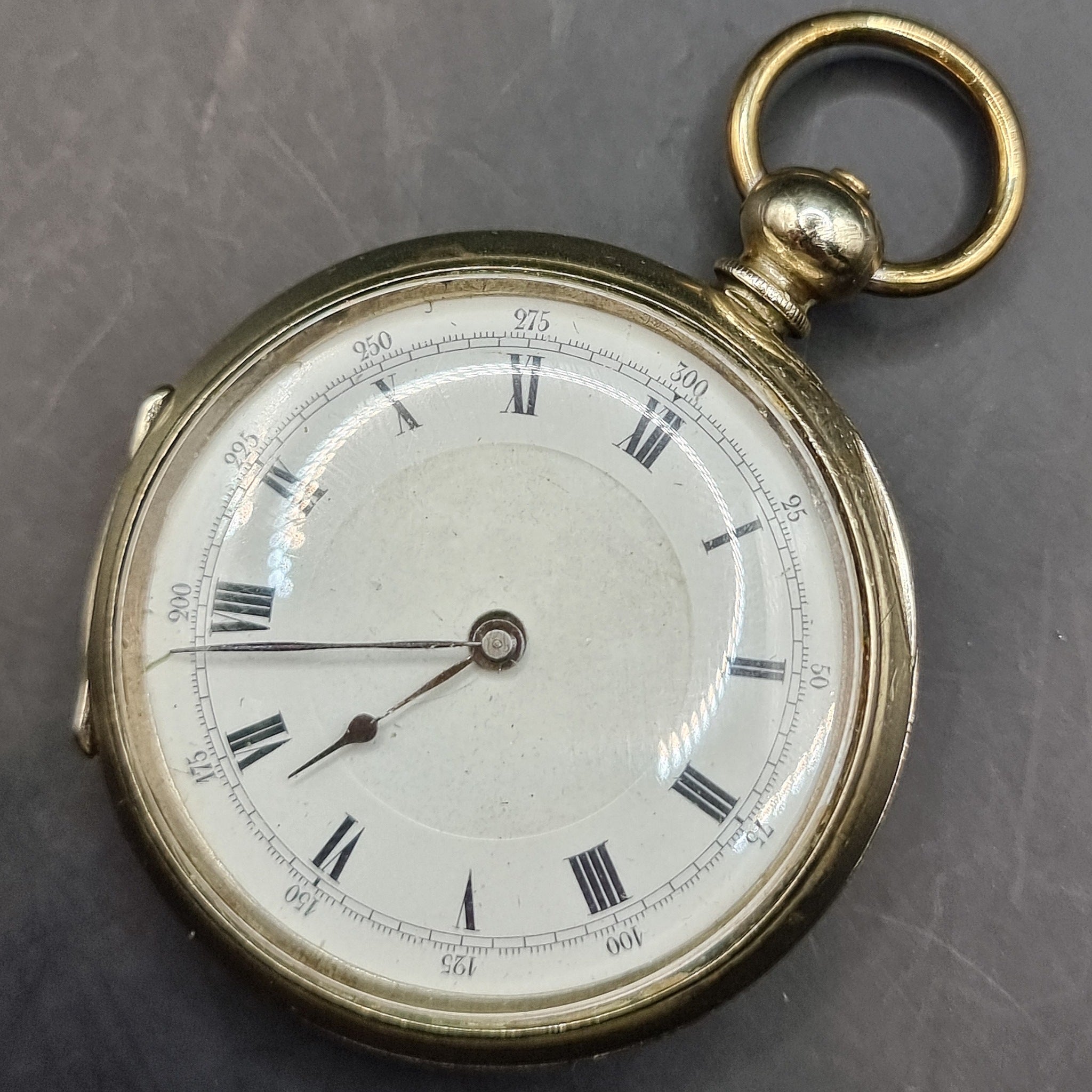 Antique Silver/ Gold Plated Fob Pocket Watch with Centre Second Chronograph Face. This is a very intriguing pocket watch, although it is in good working order, the watch does not feature a second hand, but does feature the numbers 25 to 300 every 25 around the outside of the watch face above the roman numerals. The case is heavily gold plated with a fine silver back. The plating has come off on the loop and button. I believe this is an apprentice piece of work or someone that traveled the world. It is in used worn condition with minor scratches and dents. The enamel face has a chunk missing from it, with some chipping and wear to the edge. Unknown maker but is abit of a frankenstein watch. Comes with working key. Weighs 97g.
