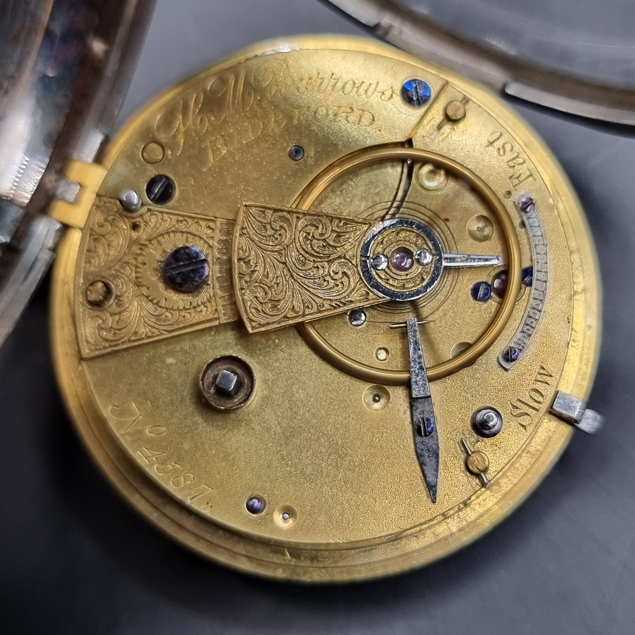 Antique Victorian Silver Fob Pocket Watch by H M Burrows 1862, Bideford. Silver pocket watch case made in London dating 1862 by William Boulton, I believe. With a fussee movement made by H.M. Burrows of Bideford. In good working order. Comes with the key. Has minor scratches and rubbing tonthe silver around the casing. The enamel face has a scratch next to the xii and a hairline crack down the other side of the xii to the centre. Otherwise in good working order. Weighs 88g.