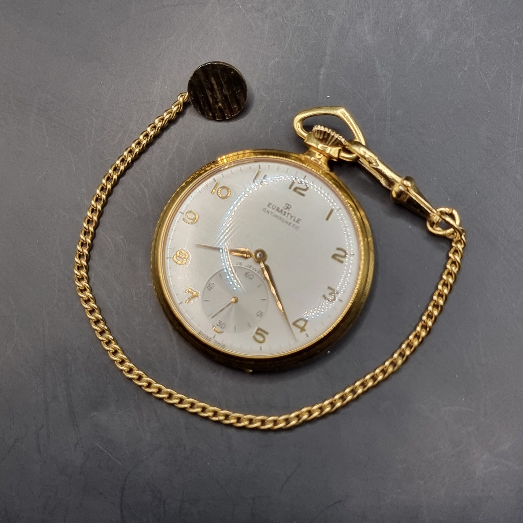 Art Deco Gold Plated Fob Pocket Watch and Chain by Eurastyle. This is an antimagnetic movement Swiss made. The watch is in good working order. Gold plating in good condition the case does show signs of wear with some minor scratches to it. Lovey looking watch and Chain.