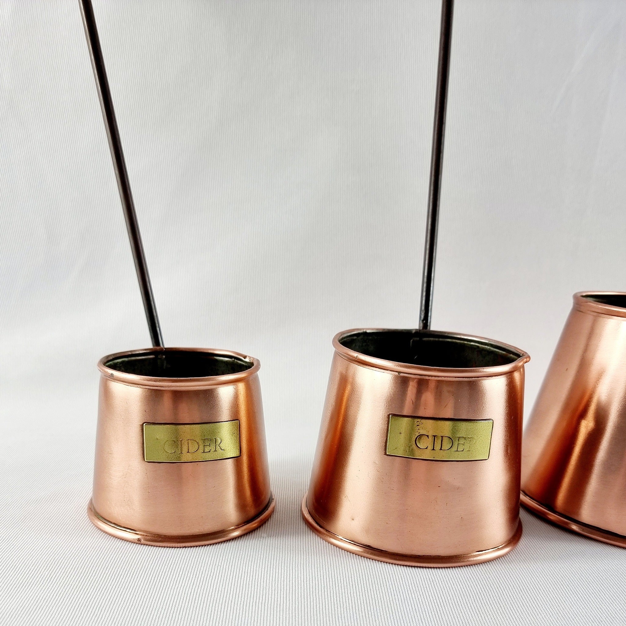 Antique Set of Three cider measures. These cider measures are made from copper with brass labels attached, with an iton handle. Made by bates Bros, Birmingham, England. They have age related wear with few dents and knocks. Also rubbing of the lettering has gone abit. They have been polished and sprayed with a lacquer to stop the lose of its shine.