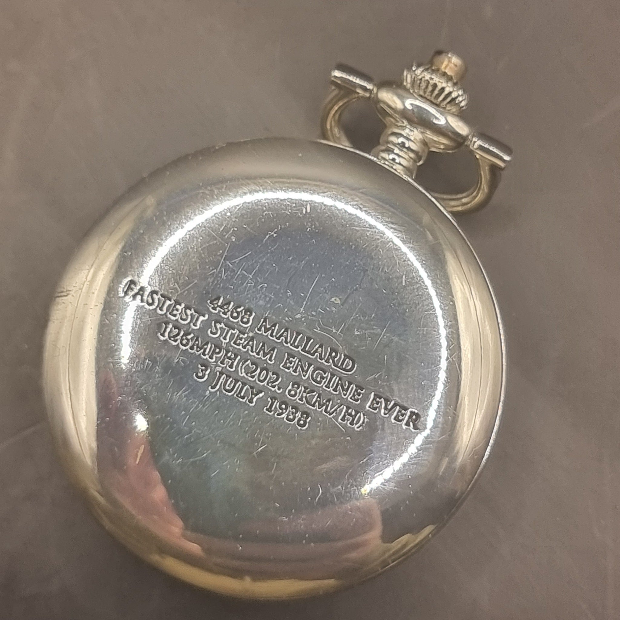 Vintage 4468 Mallard Steam Train Fob Pocket Watch. This pocket watch is to commerate the 4468 Mallard for being the fastest steam engine ever. Going 126mph or 22.8kmh on 3rd july 1938. The pocket watch is in good working order. Some minor marks and some scratching to the chrome plating. Otherwise in good condition.