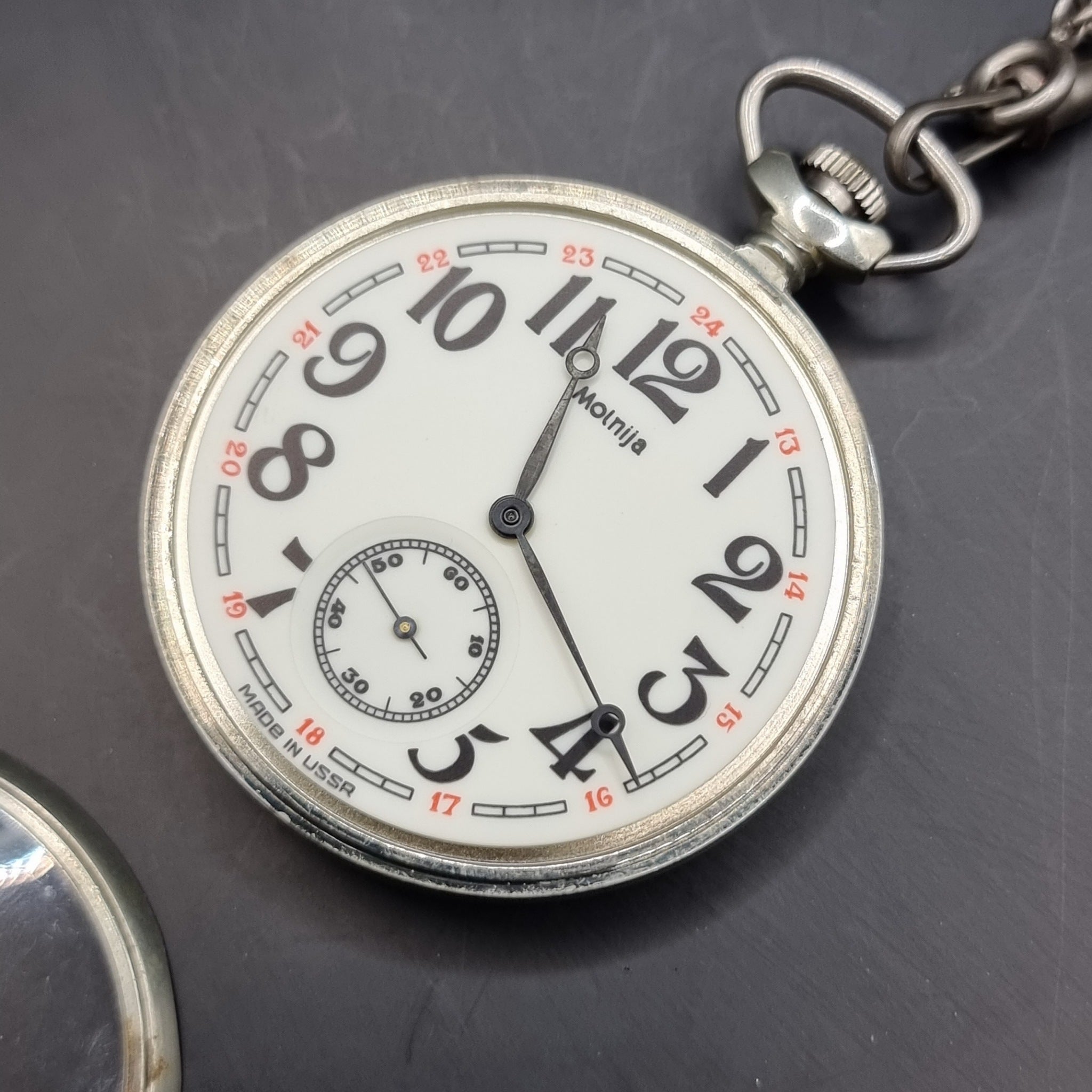 Vintage Antique Stye Fob Pocket Watch Molnija Train Watch. This pocket watch comes with the Albert chain attached. It is in great working order, winds nice and easily. Features a Locomotive to the back plate. Has markings tnthe case. And age related wear. But otherwise in good order.