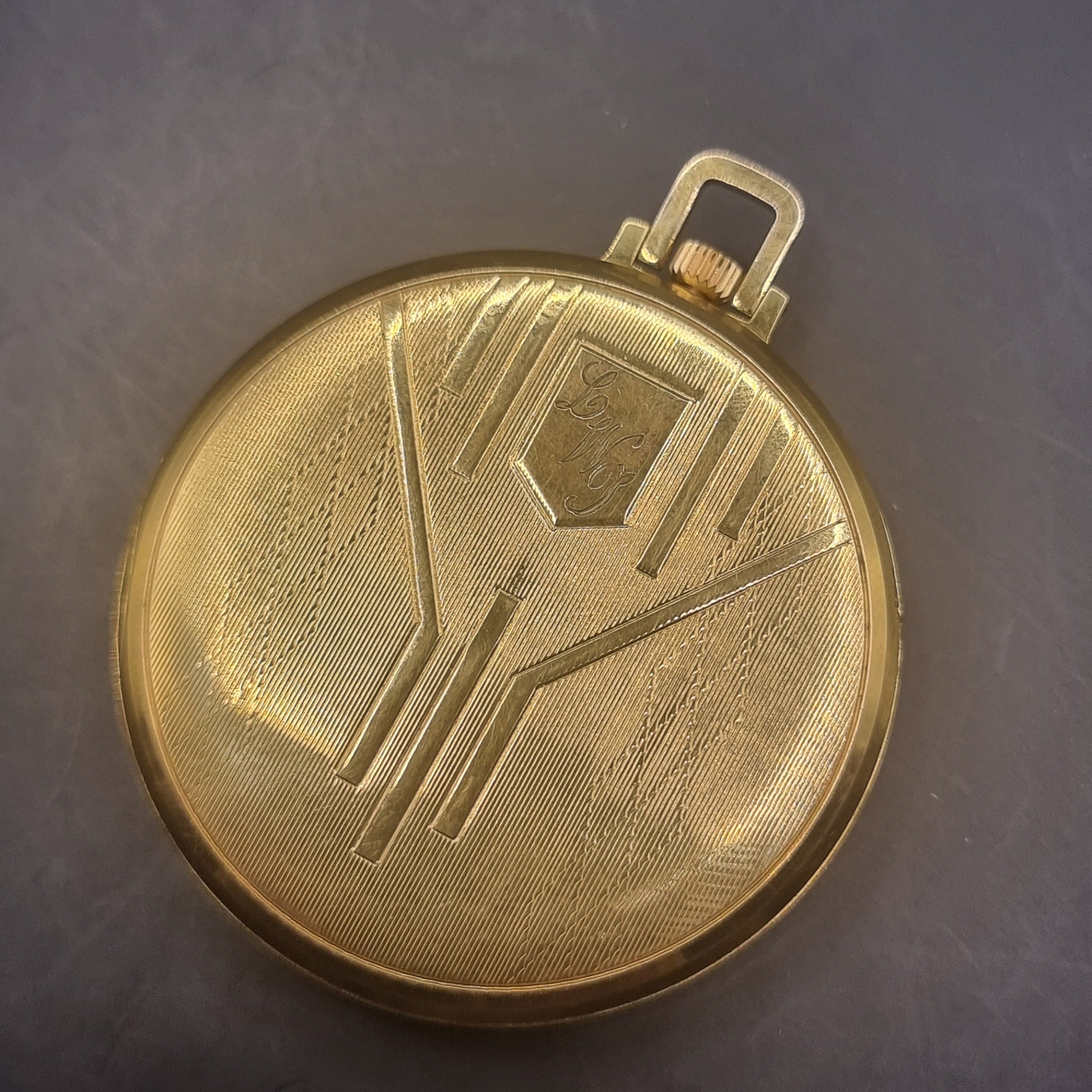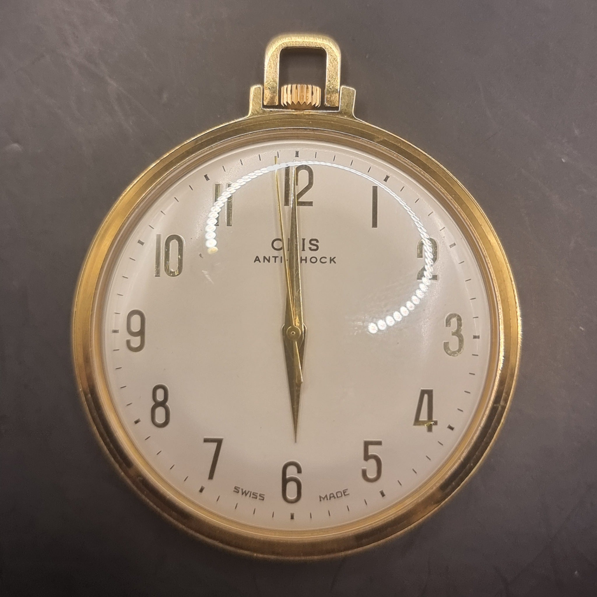 Vintage Art Deco Gold Plated Oris Fob Pocket Watch. Made by Oris watch company the pocket watch is in good working order. Swiss made anti-shock movement. The case shows little use with some minor scratches mainly from tools to open the back. Centre Second hand. Initialled to the back in the shield.