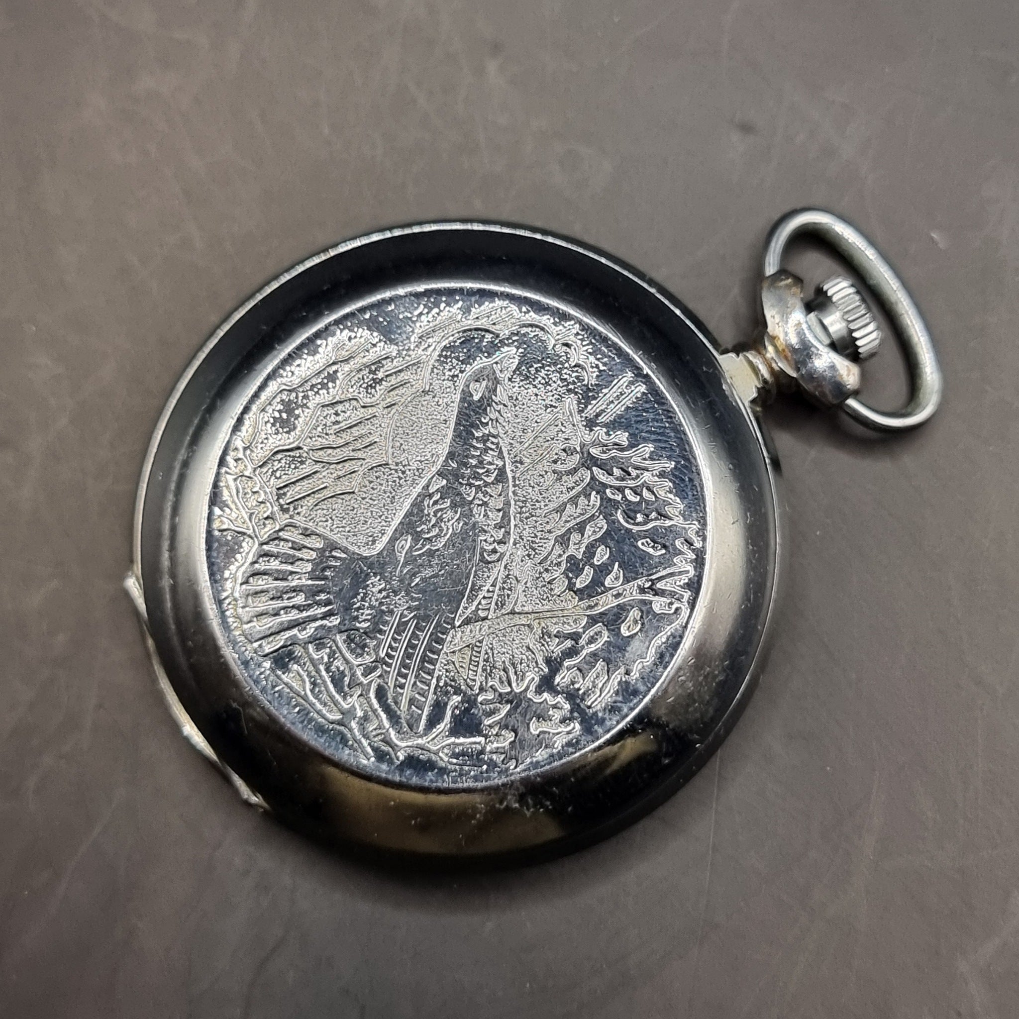 Vintage Full Hunter Sekonda 18 Jewels USSR Fob Pocket Watch. The watch is in good working order. Designed with a partridge in woodland to the front with pine cones and foliage to the back. Very decorative pocket watch. Has minor age related wear. Minor marks and slight scratching over the metal casing.