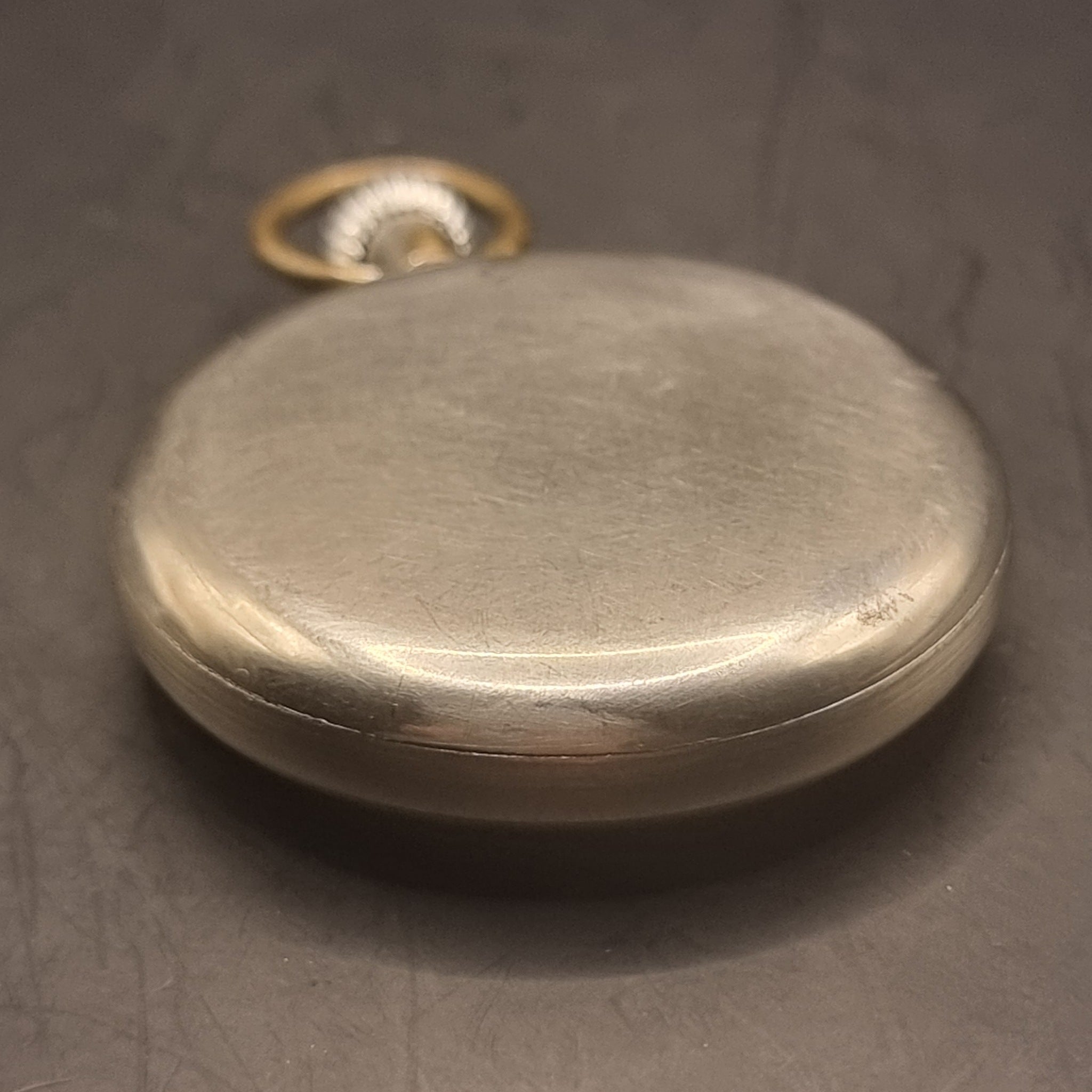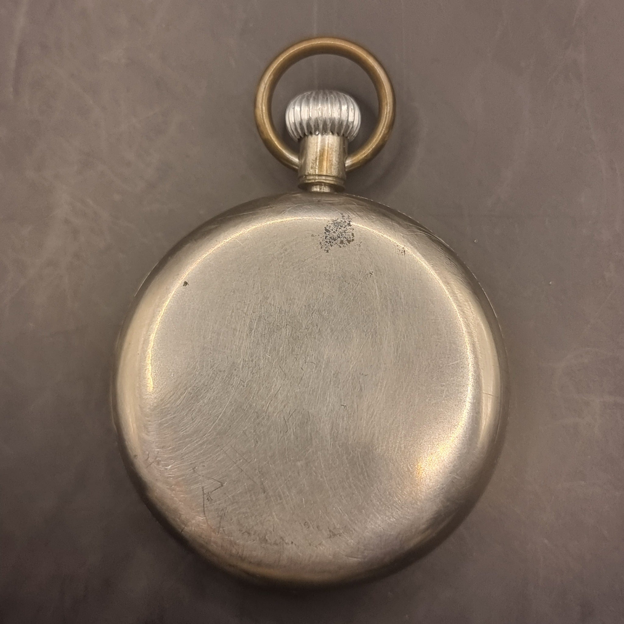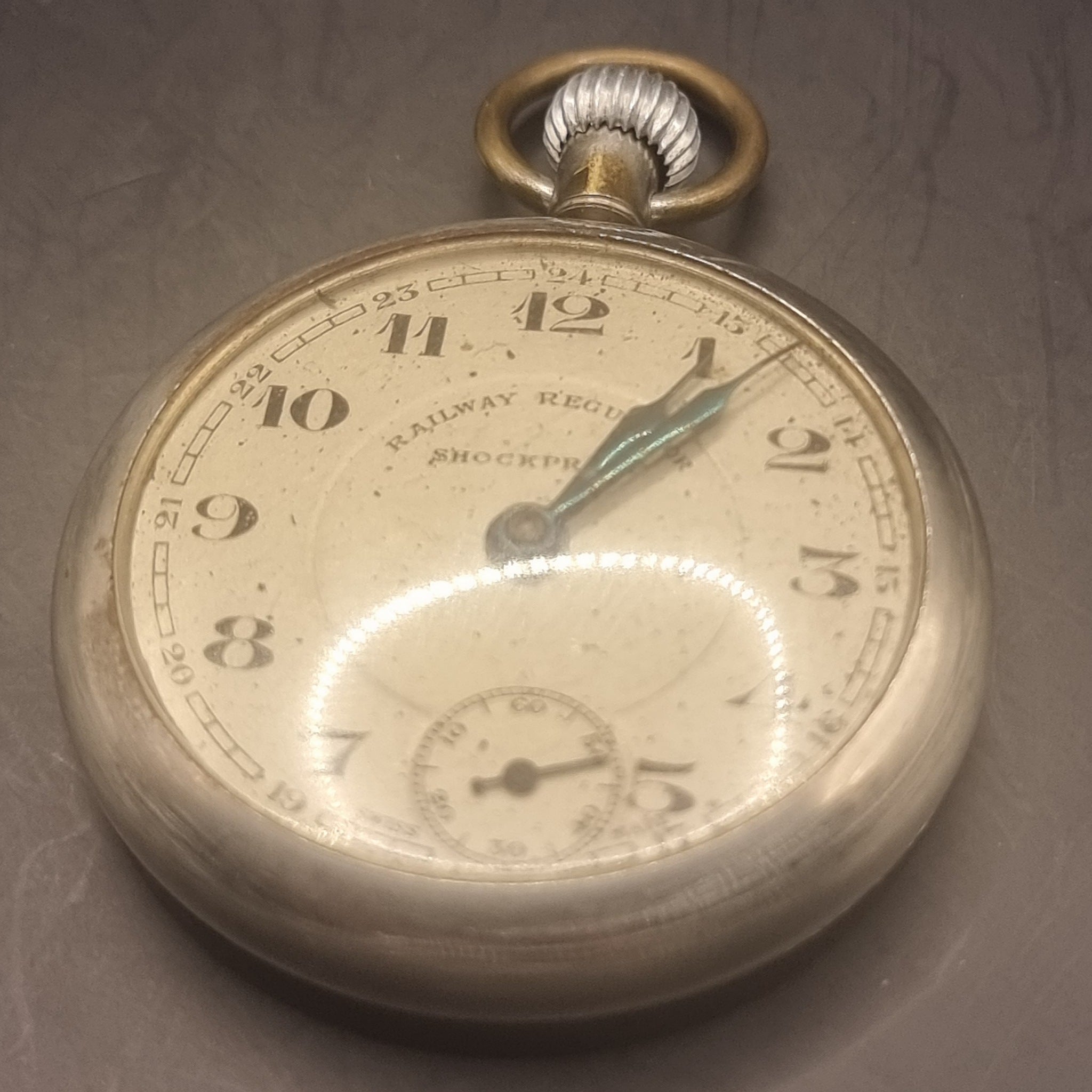 Vintage Railway Regulator Shockproof Fob Pocket Watch. This pocket watch is in good working order. The second hand moves backwards and the dial features a 24 hour number system. The watch is can not open to get the pictures of the movement. It has age related wear with scuffs, scratches and minor dents. With plating coming away in places. Still a good working pocket watch.