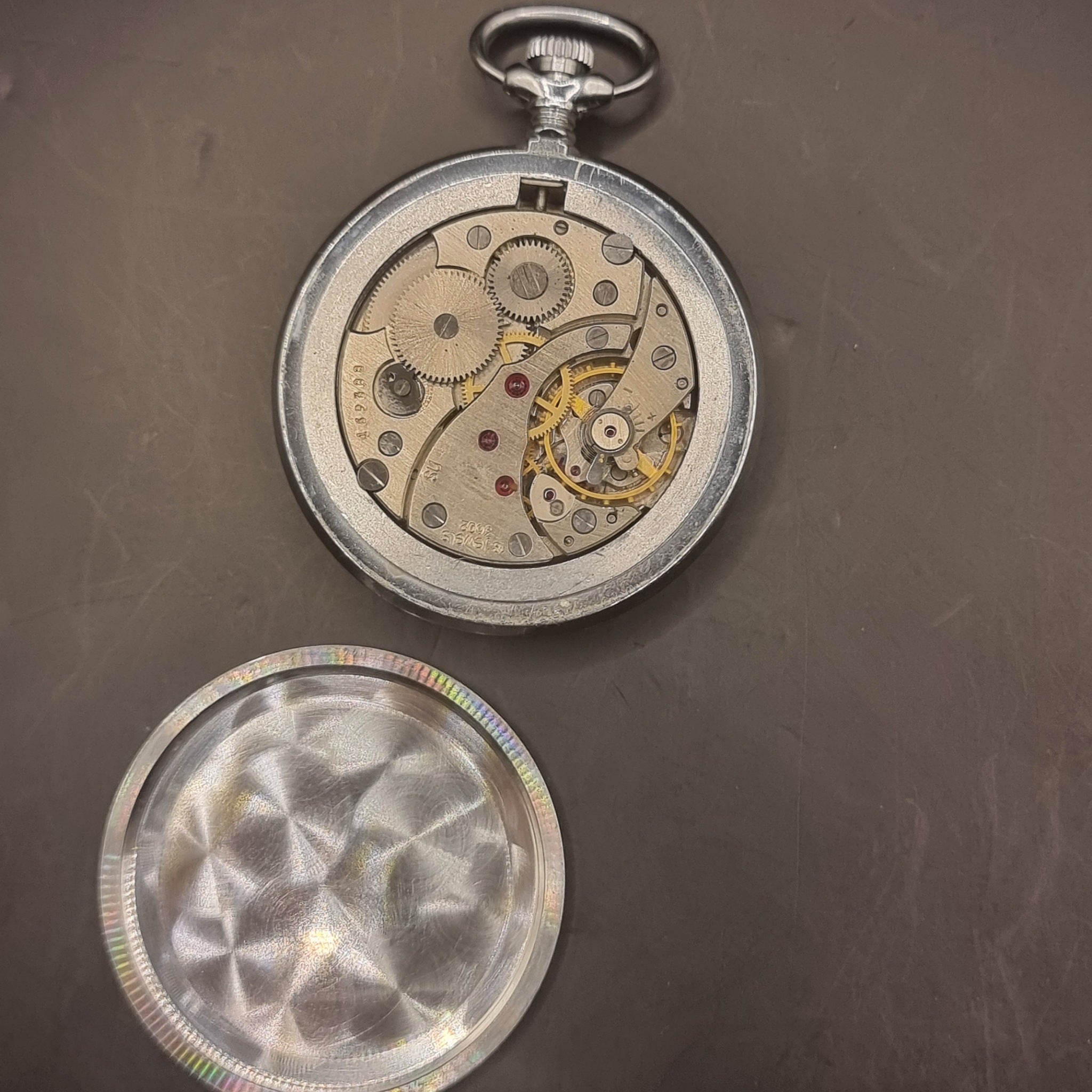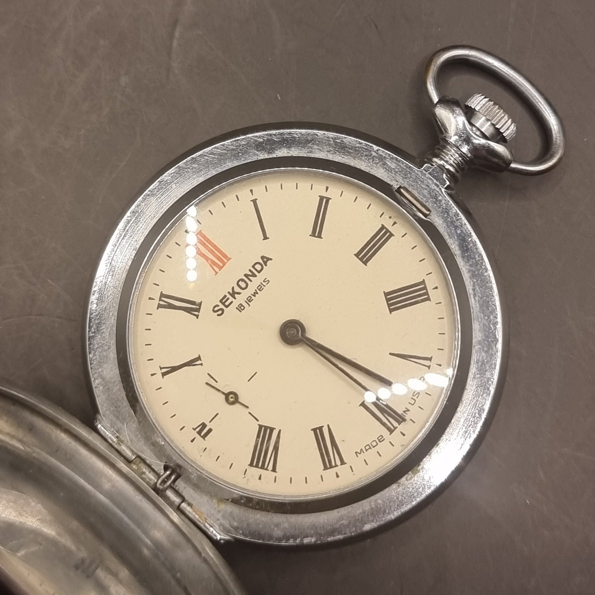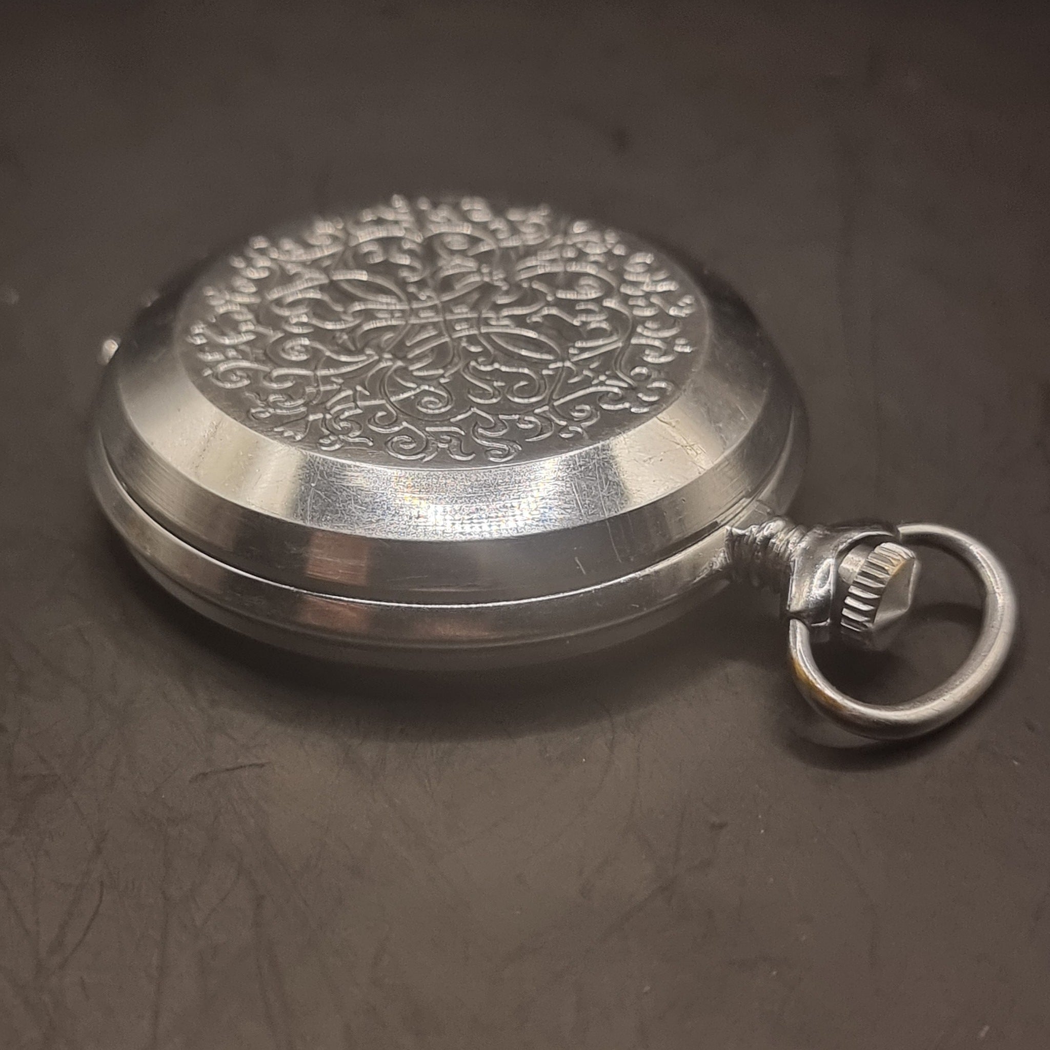 Vintage Sekonda 18 Jewels USSR Full Hunter Fob Pocket Watch. Made in Russia by sekonda, featuring an 18 jewel Movement in good working order. The full Hunter has demask patterning to the front and back. In a chrome finish. Some light surface marks and scuffs and scratches but otherwise in good condition.