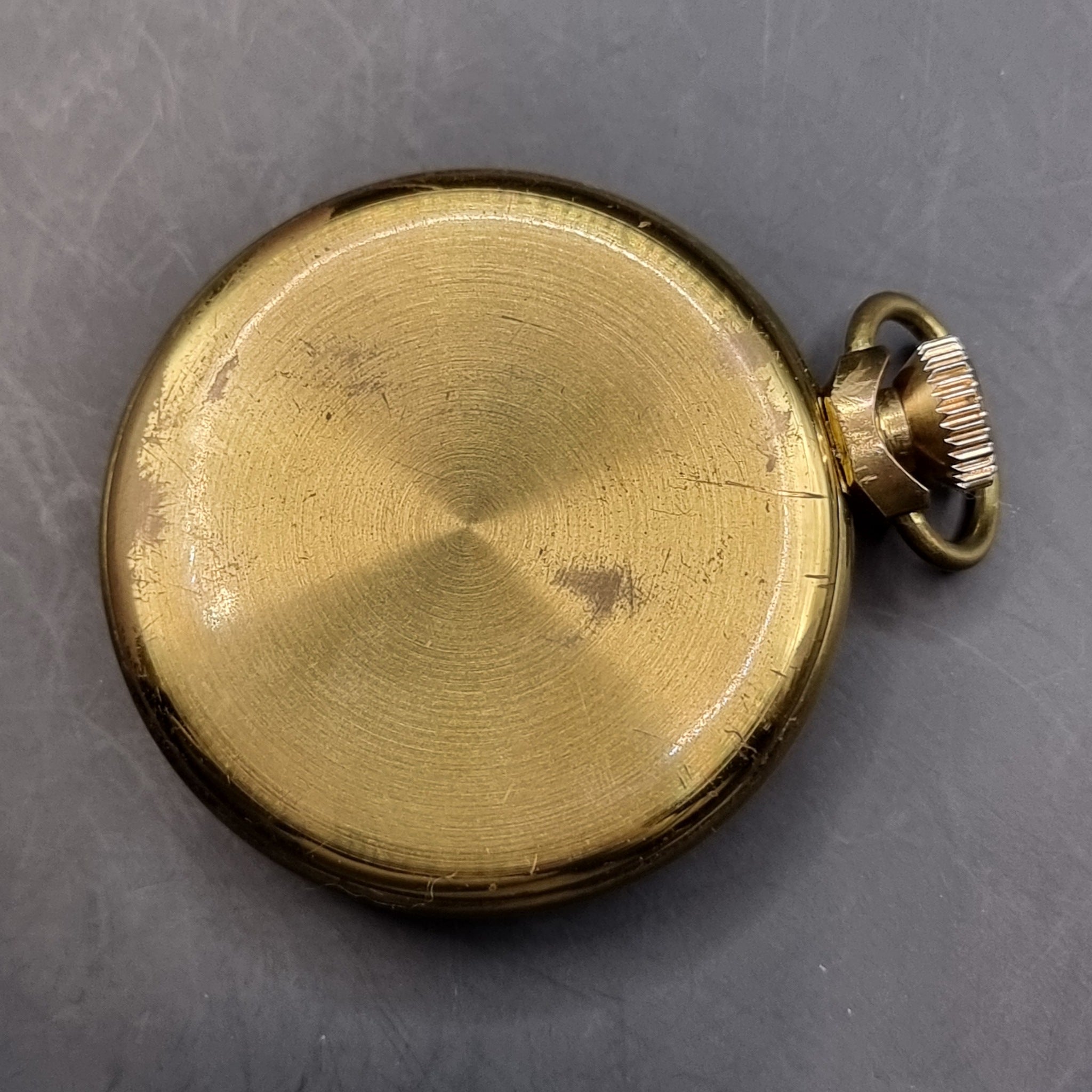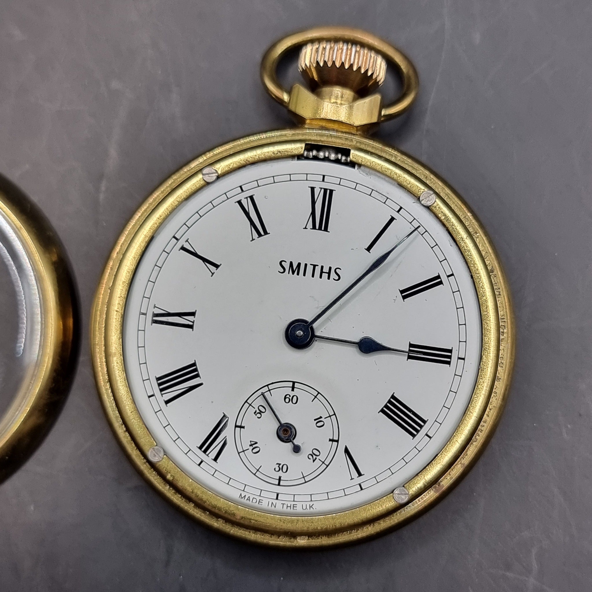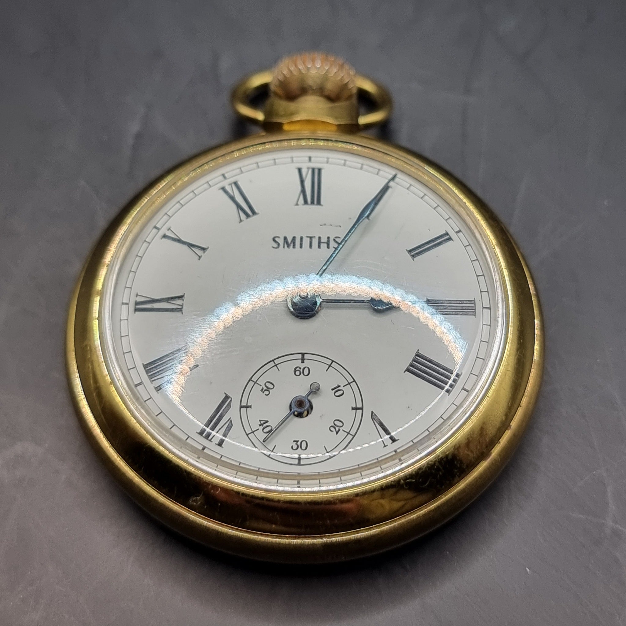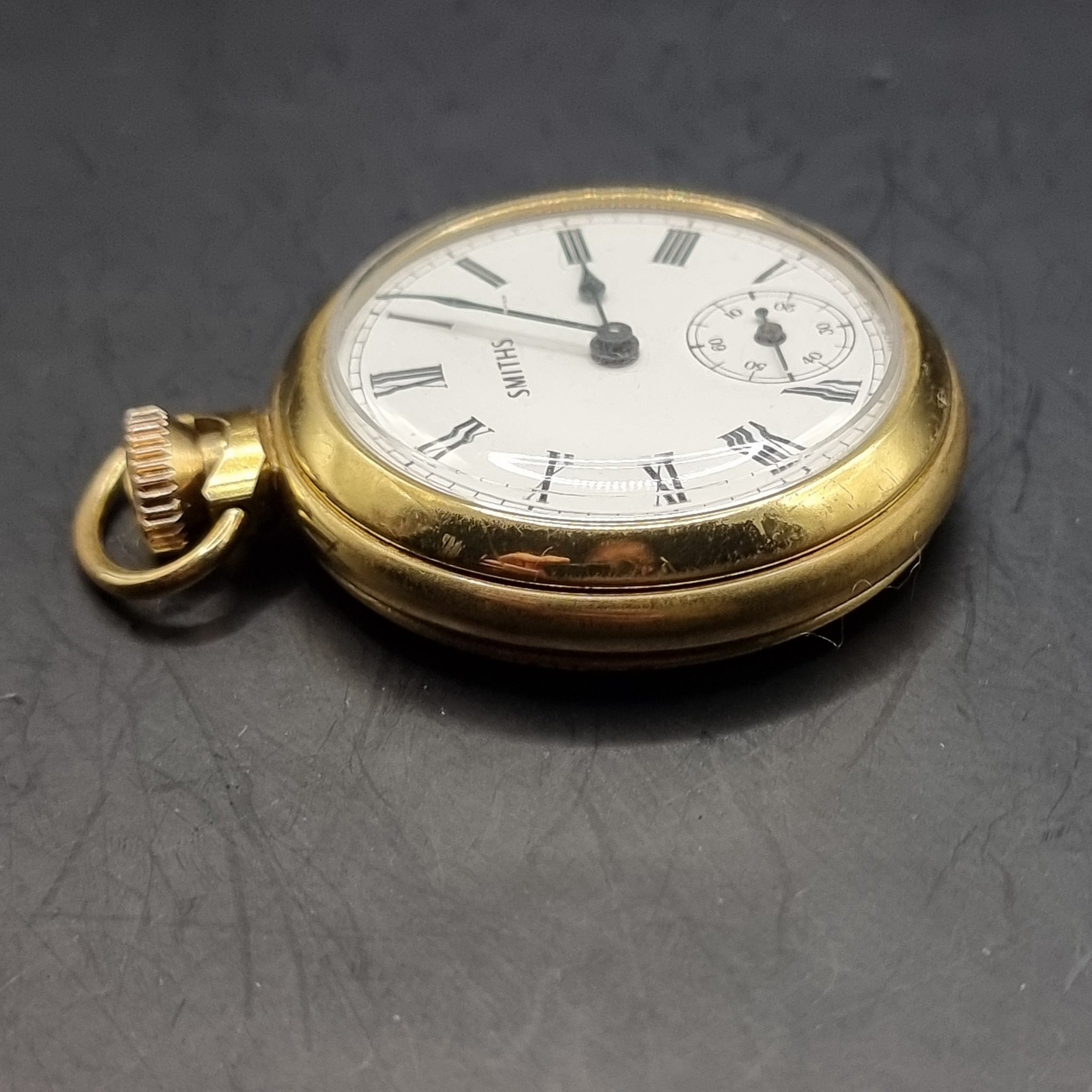 Vintage Smiths Gold Plated Fob Pocket Watch by Smiths Industies Ltd. Made in great Britain. This Smiths pocket watch features a tin plate face. In good working order. Showing signs of minor wear. Minor surface marks, scratches and gold plating worn off in places.