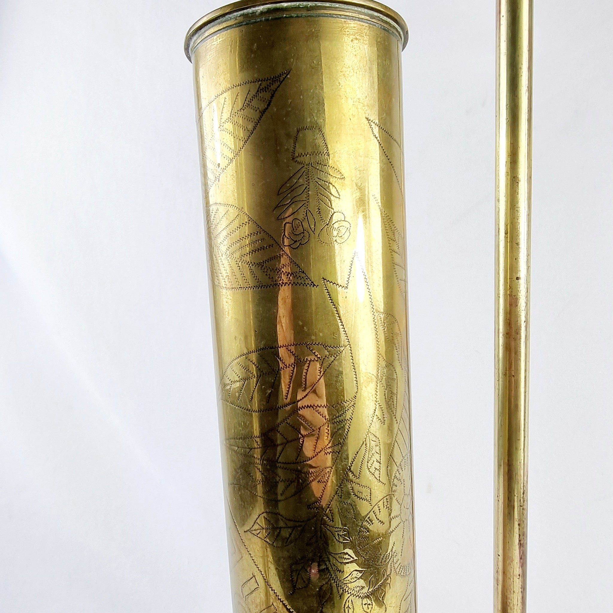 WW1 antique trench art artillery shell gong. A world war one etched trench art shell that has been re-purposed into a gong. This lovely piece of trench art has the celebration of the victory f the allies in Ypres 1914. Depicting flowers and artillery with the words Yser 1914. Gloire aux allies. Housed on a brass mounted stand. On an oval base.