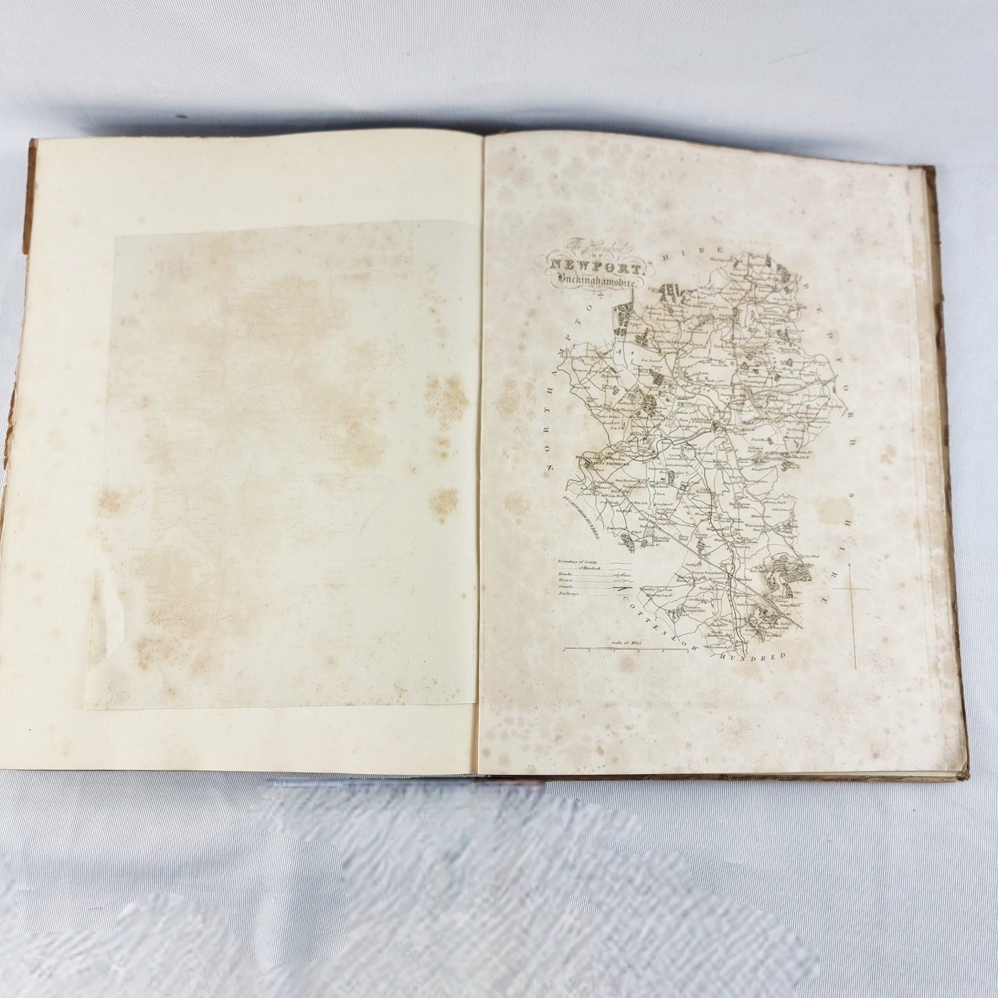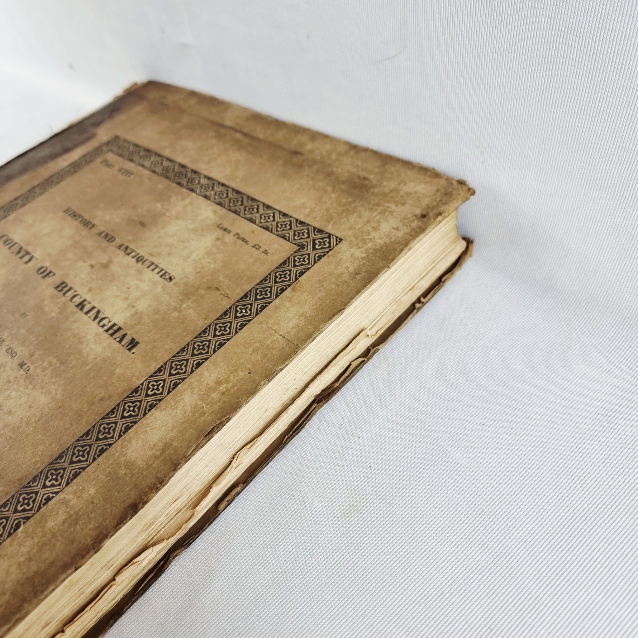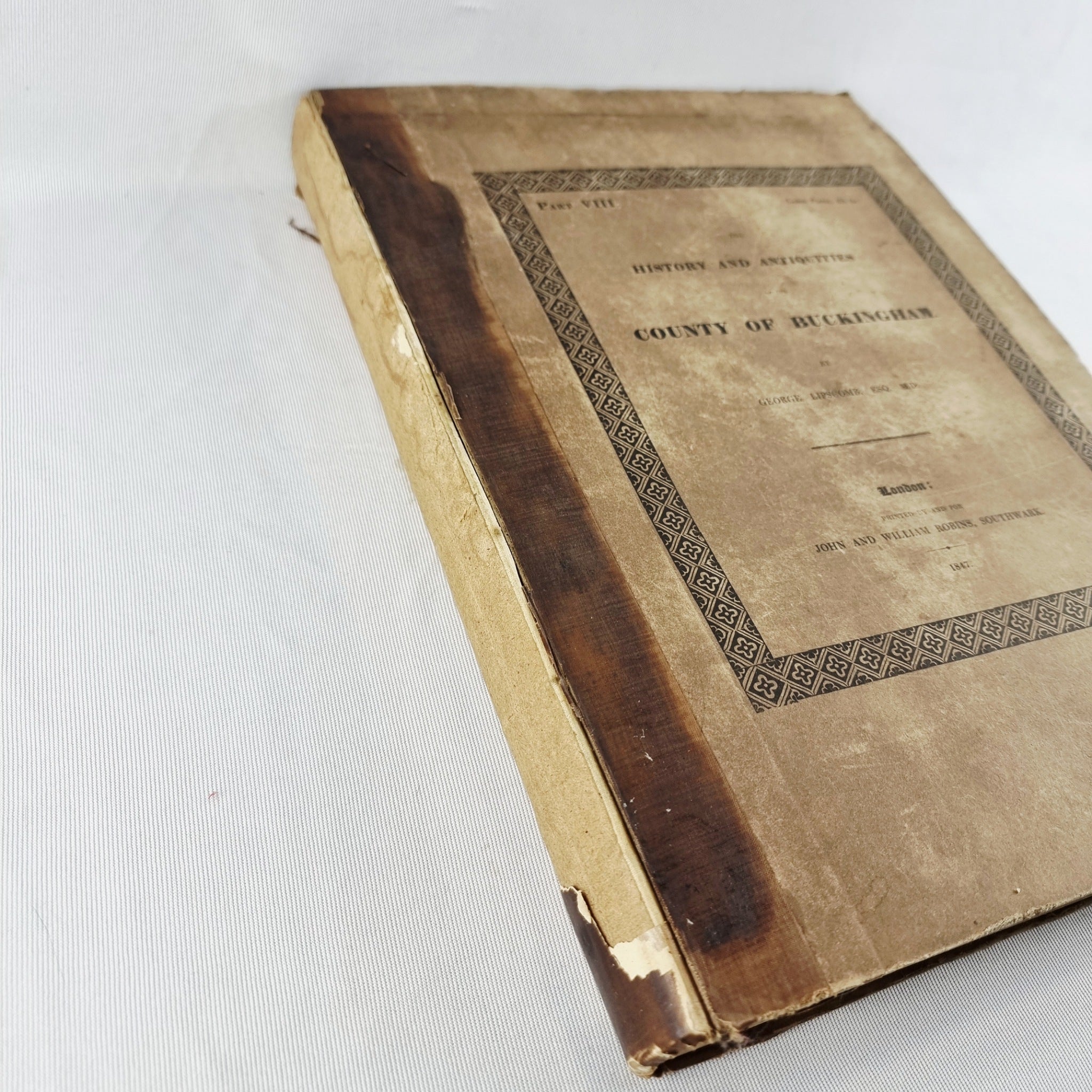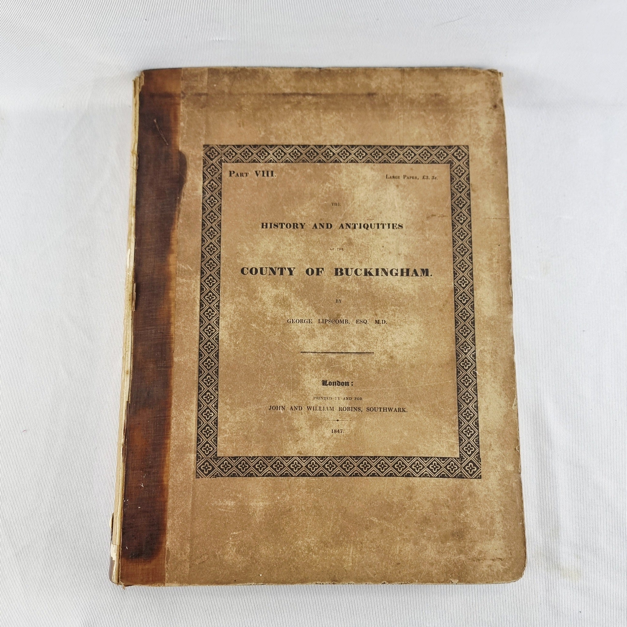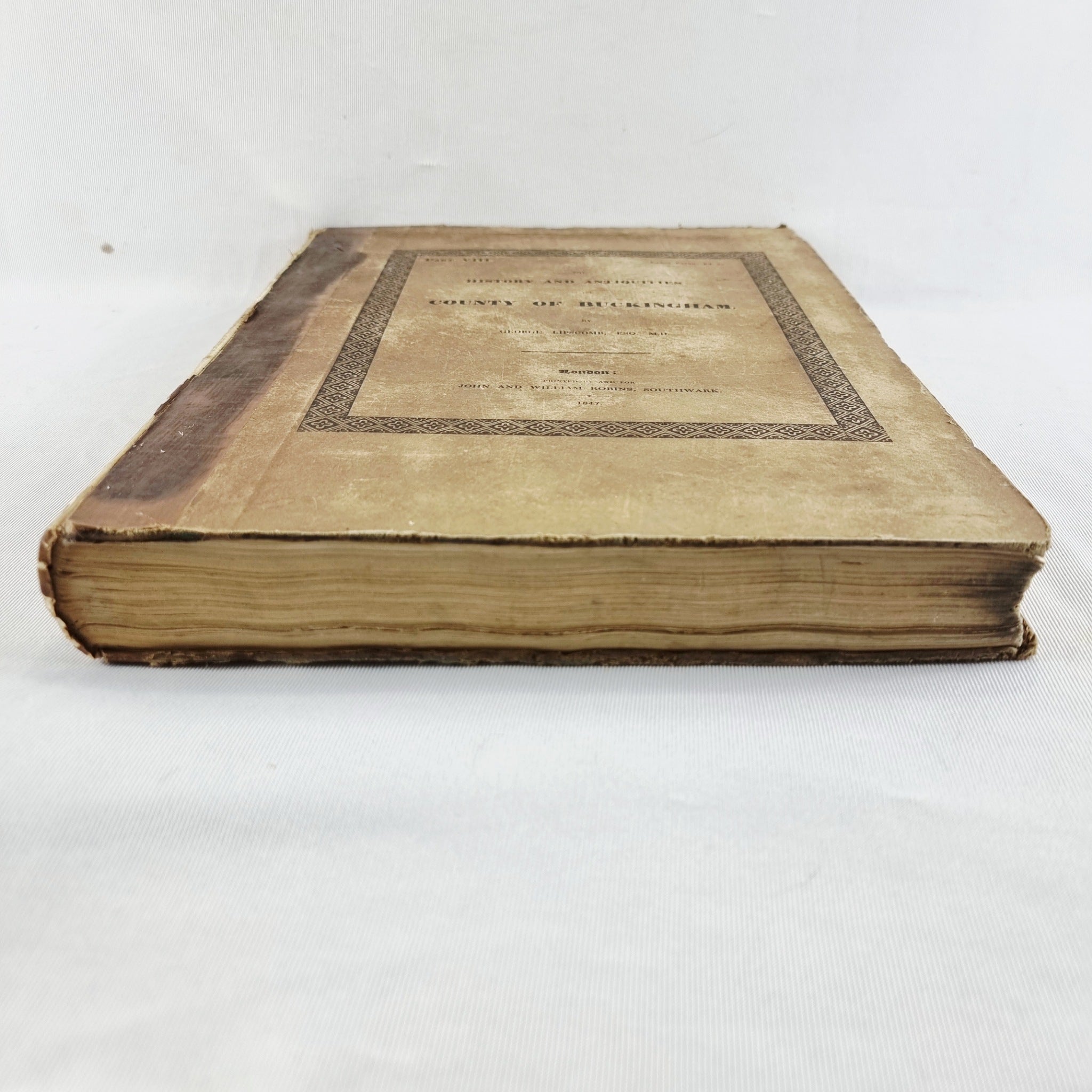 1847 The History and Antiquities of the County of Buckinghamshire Part VIII Antique Book by George Lipscomb, London. Printed by John and William Robins, Southwark. This book has the hundred of Newport, Buckinghamshire Map to the back. The book is in heavily used condition. With foxing through the pages. Hard back cover is worn book spine missing. Wear to the paper.