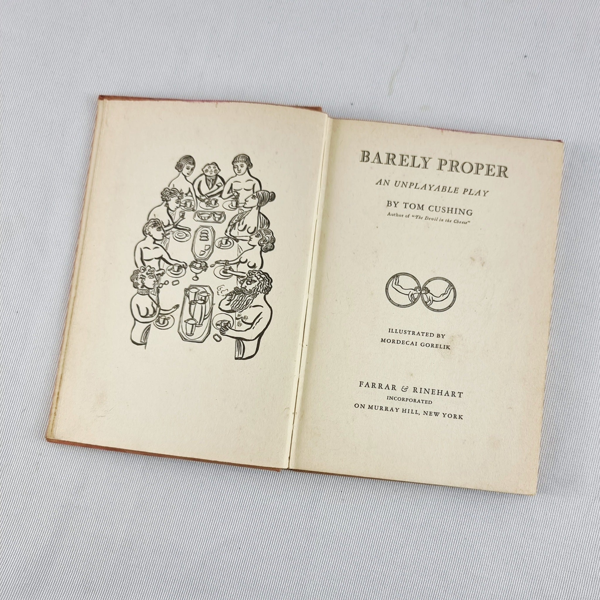 Vintage 1931 Barely Proper An unplayable play by Tom Cushing Hardback Book. Illustrations by Mordecai Gorelik, printed for Farrer and Rinehart incorporated on Murray Hill, New York. Printed by J.J. Little and Ives Company. The book has some marks to some pages and marks to the hard cover. Watermark to the to right corner of the hard cover. But otherwise in good condition.