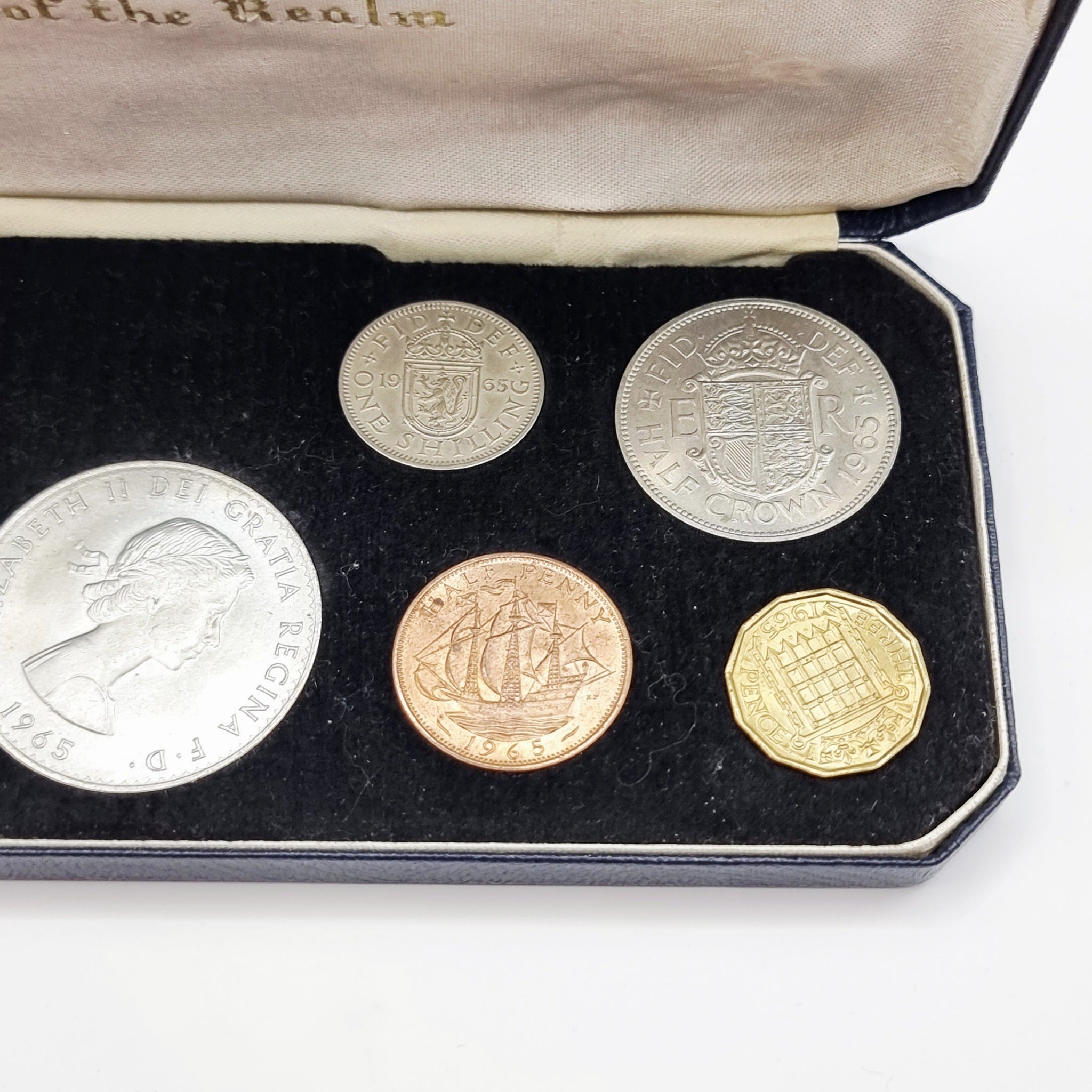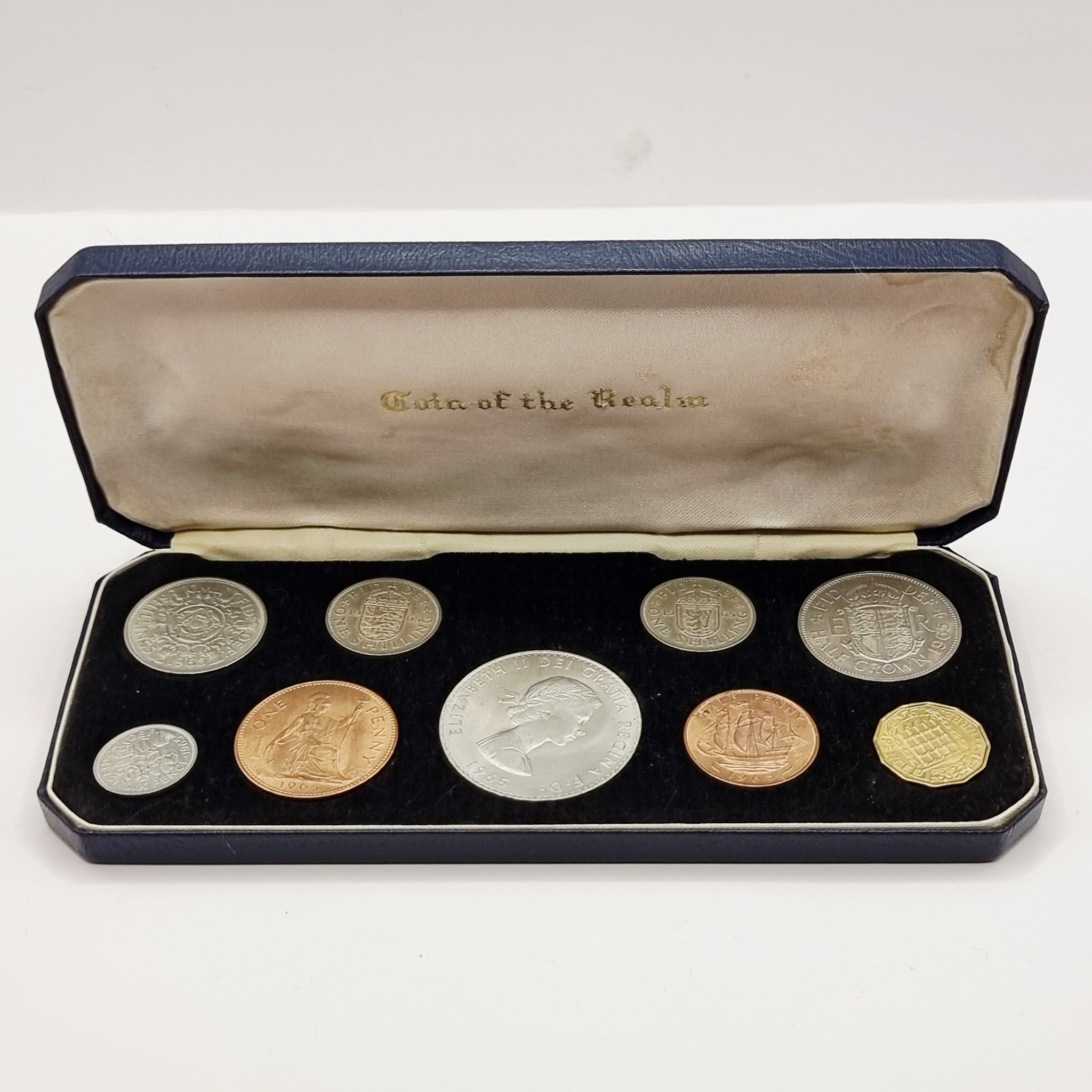 1965 Uncirculated Proof Set Coins of the Realm 9 Coins in total. This great set is housed in a fitted hardcase depicting Coins from the United Kingdom. All in good condition may have slight wear from coming loose in the case. Case is in great condition with minor age related wear.