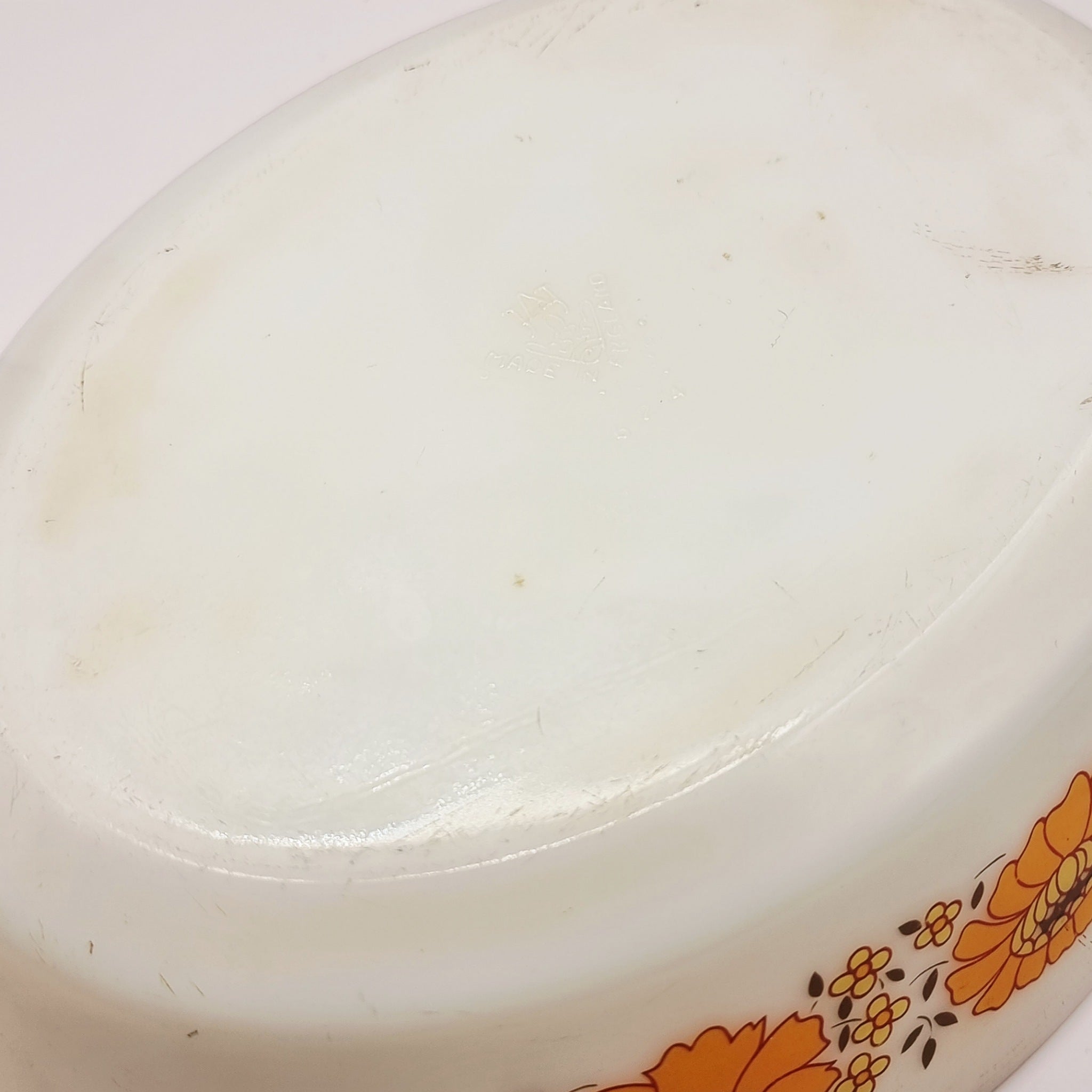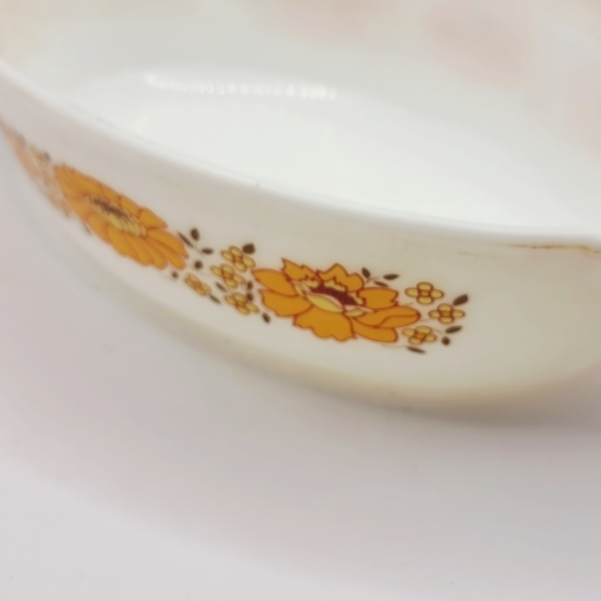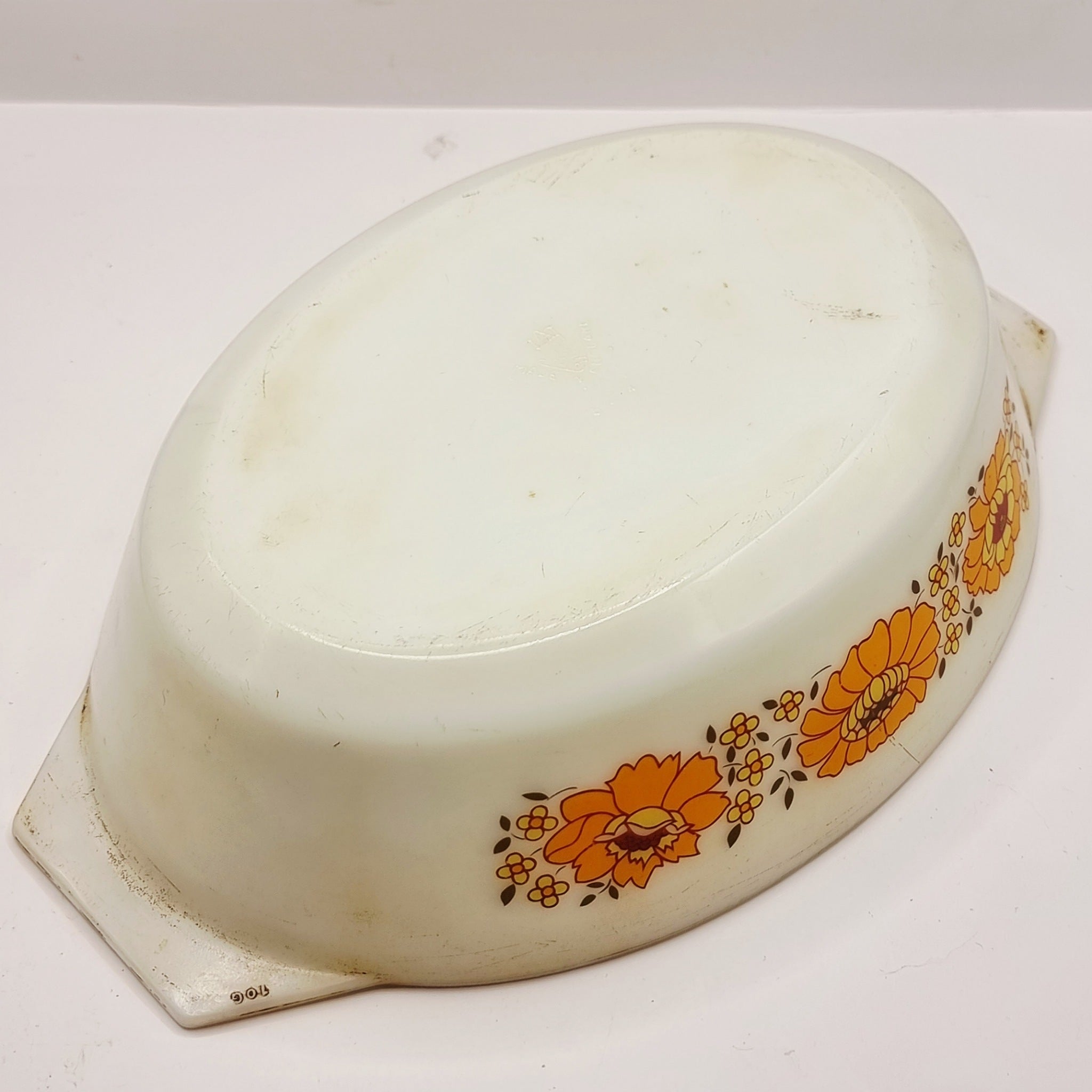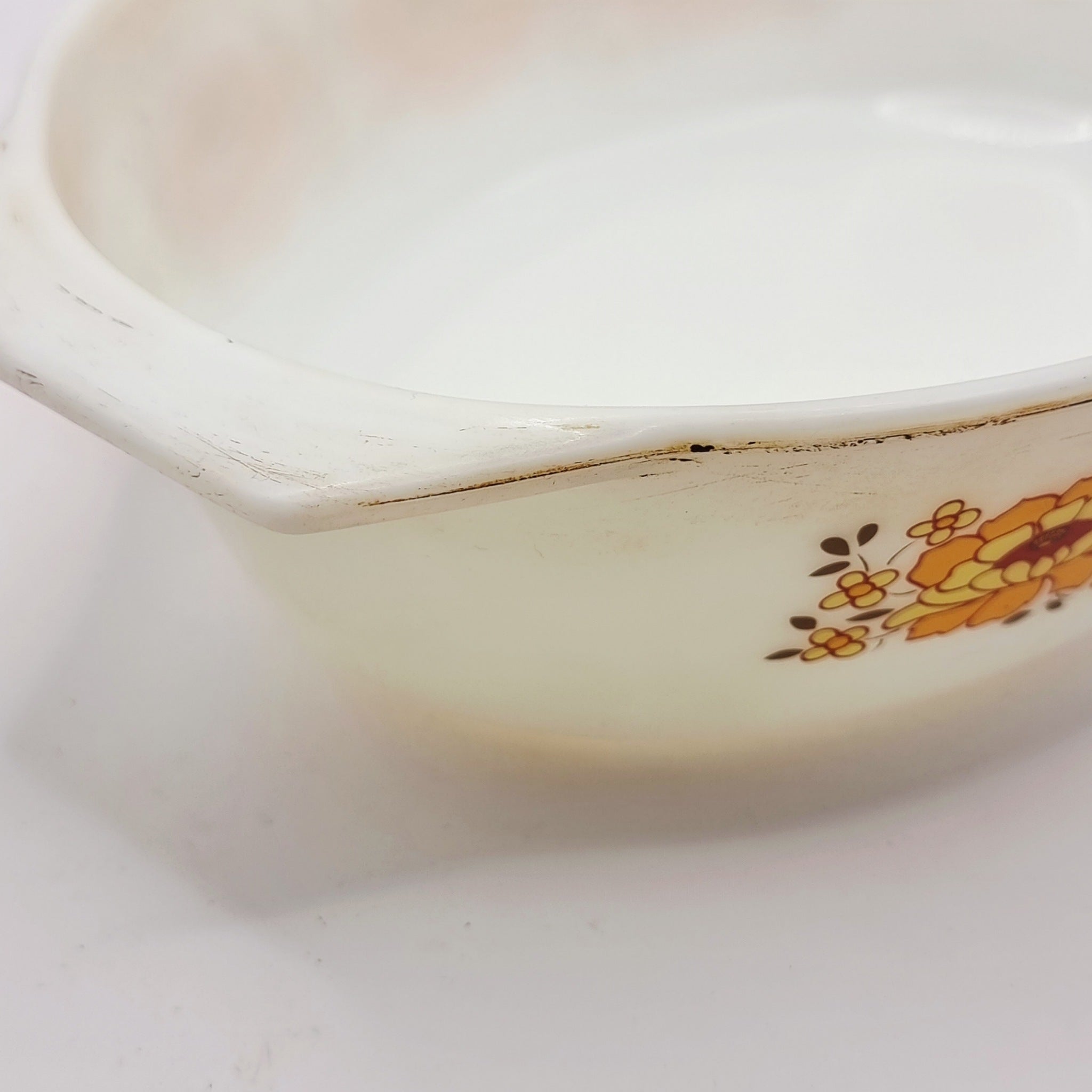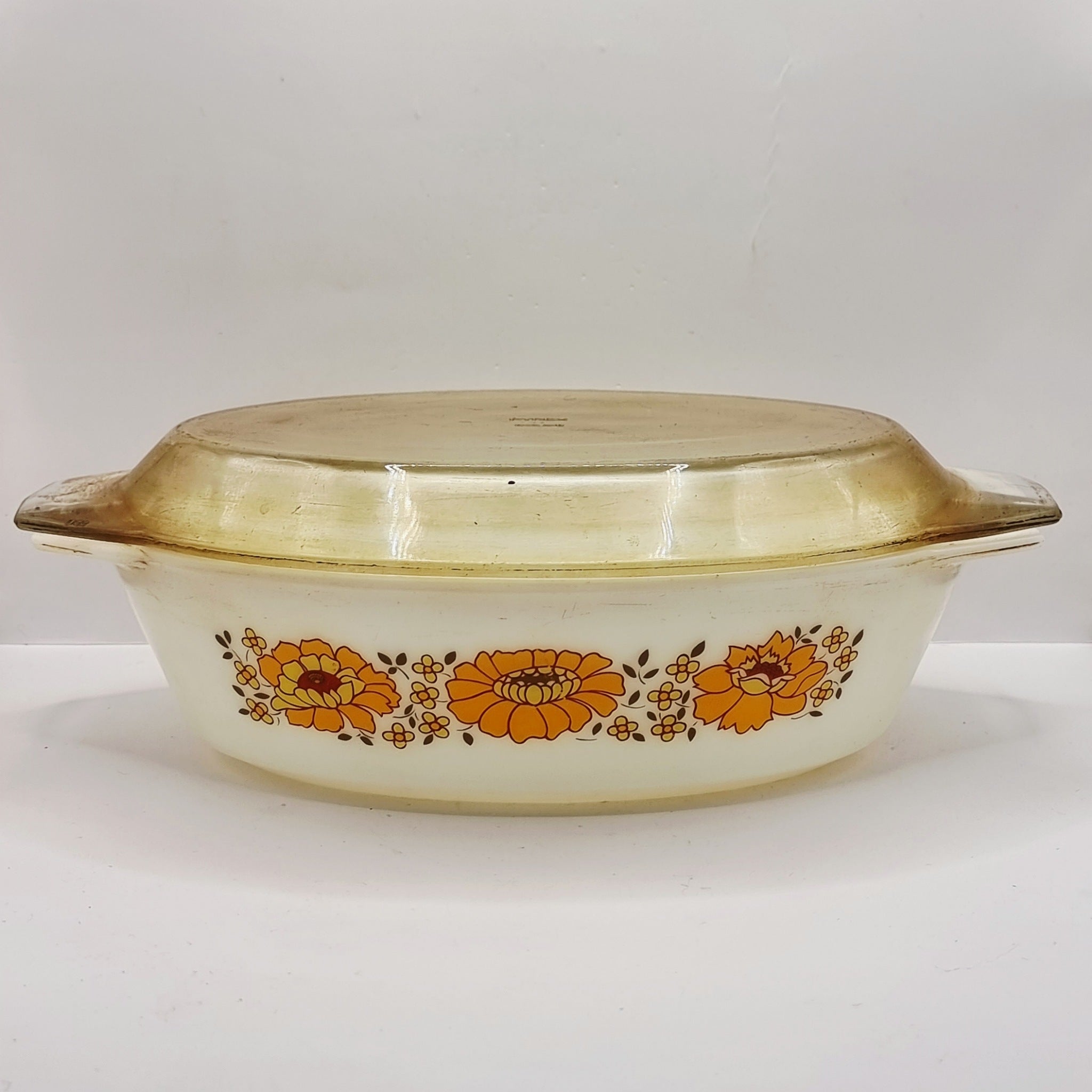 1970s Vintage Sunflower Pyrex Casserole Lidded Dish. This classic dish has a wonderful sunflower pattern to either side of it. No damage just signs of being used with the wear to it. Could do with a scrubbing to bring it back as I have only given it a light clean in the sink.