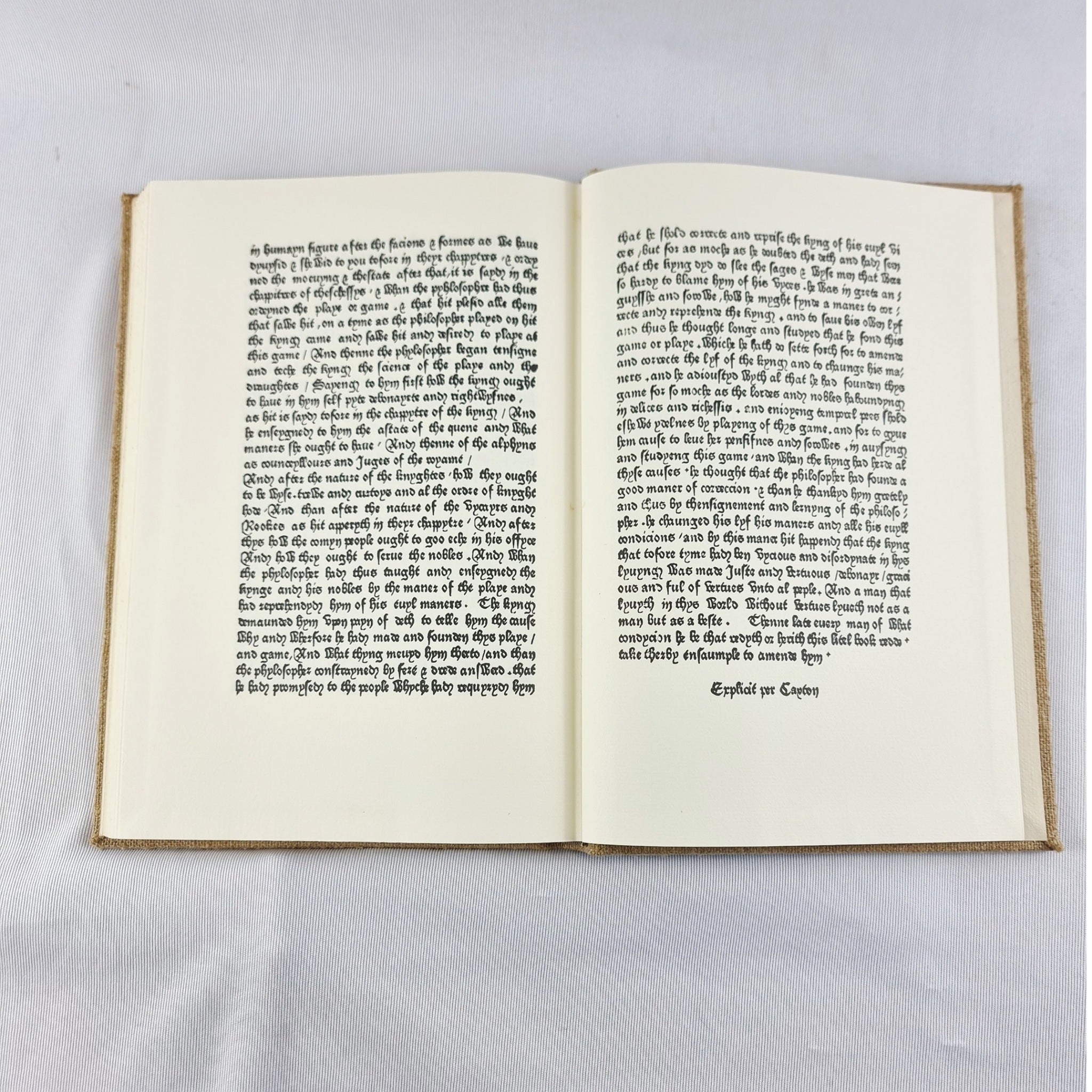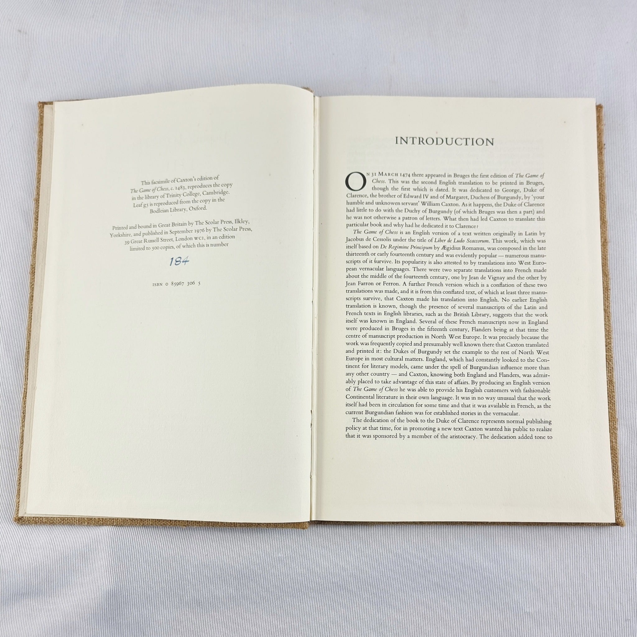 1976 Jacobus de Cessolis The Game of Chess William Caxton Book. Translated and printed by William Caxton c.1483. Reproduced in facsimile from the copy at trinity college, Cambridge, with an introduction by N.F.Blake printed by The scolar press, Ilkley, Yorkshire. Published by the scolar press, London 1976. Limited Edition 184 out of 500. In great condition. May have minor marks in places but nothing that is noticeable.