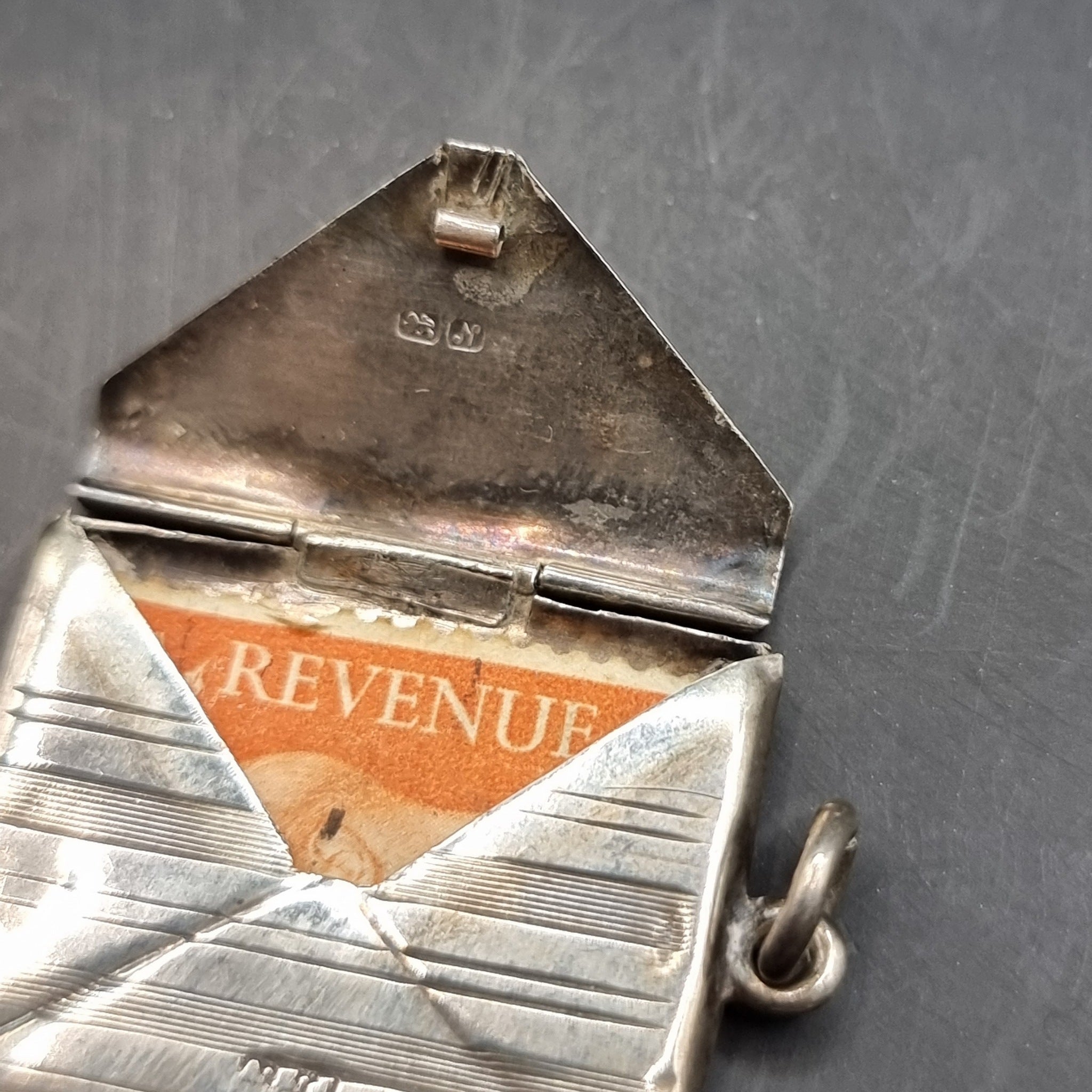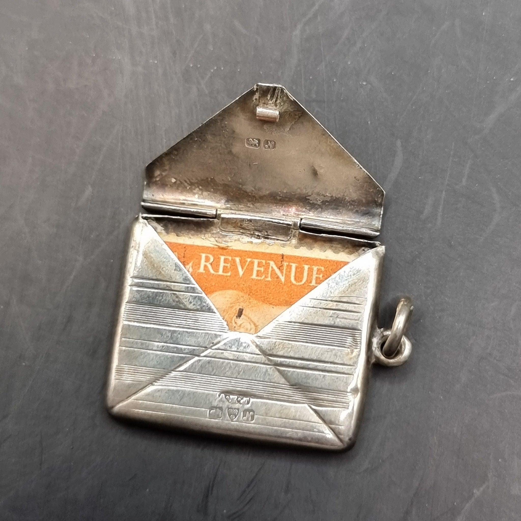 Antique 1913 Albert Ernest Jenkins Chester Silver Envelope Stamp Holder. This silver stamp holder is in the form of an envelope revealing a stamp to the interior. Made in Chester by Albert Ernest Jenkins with the date letter N for 1913. It has age related wear but overall in good condition. The top looks slightly bent as photographed. Denting to the back from handling.