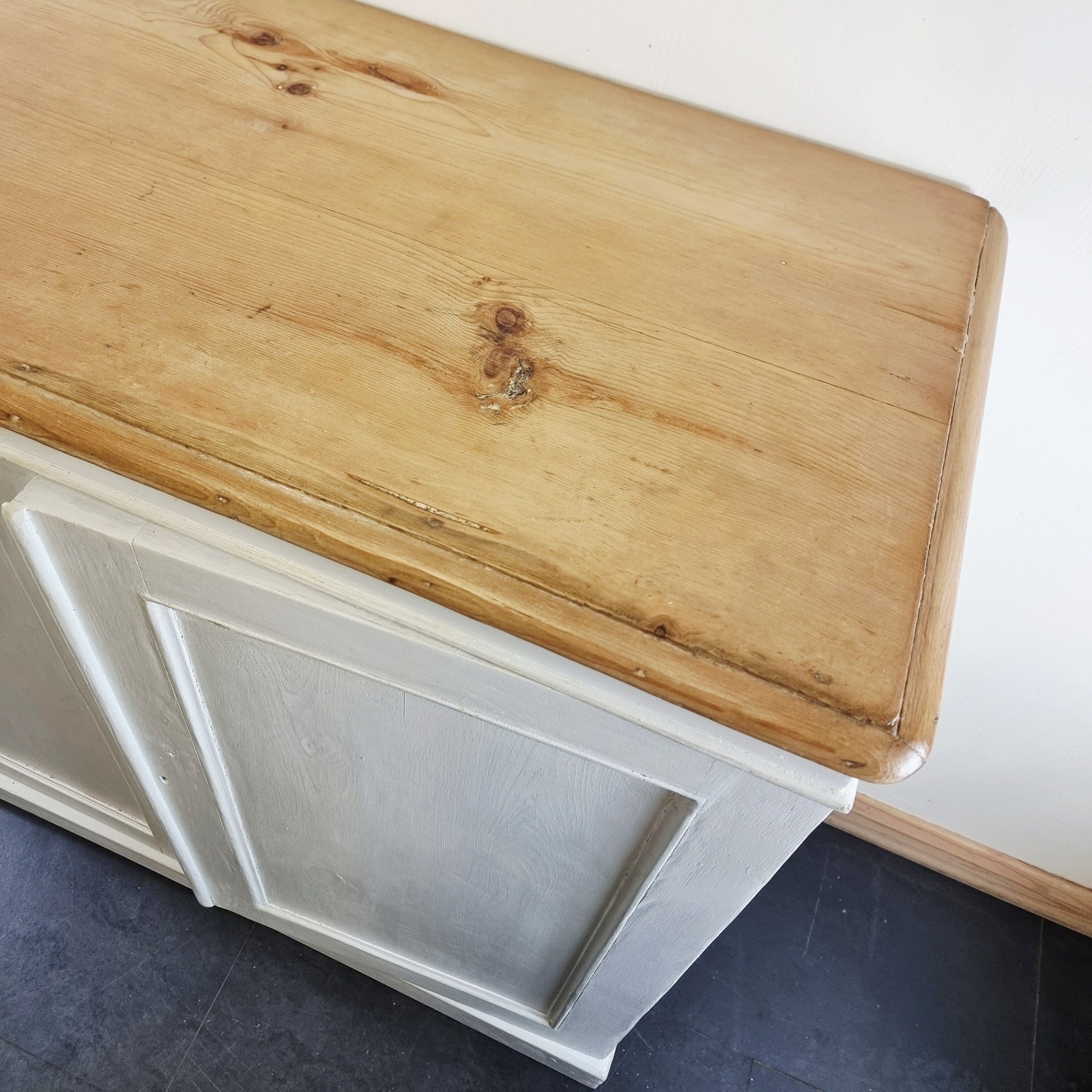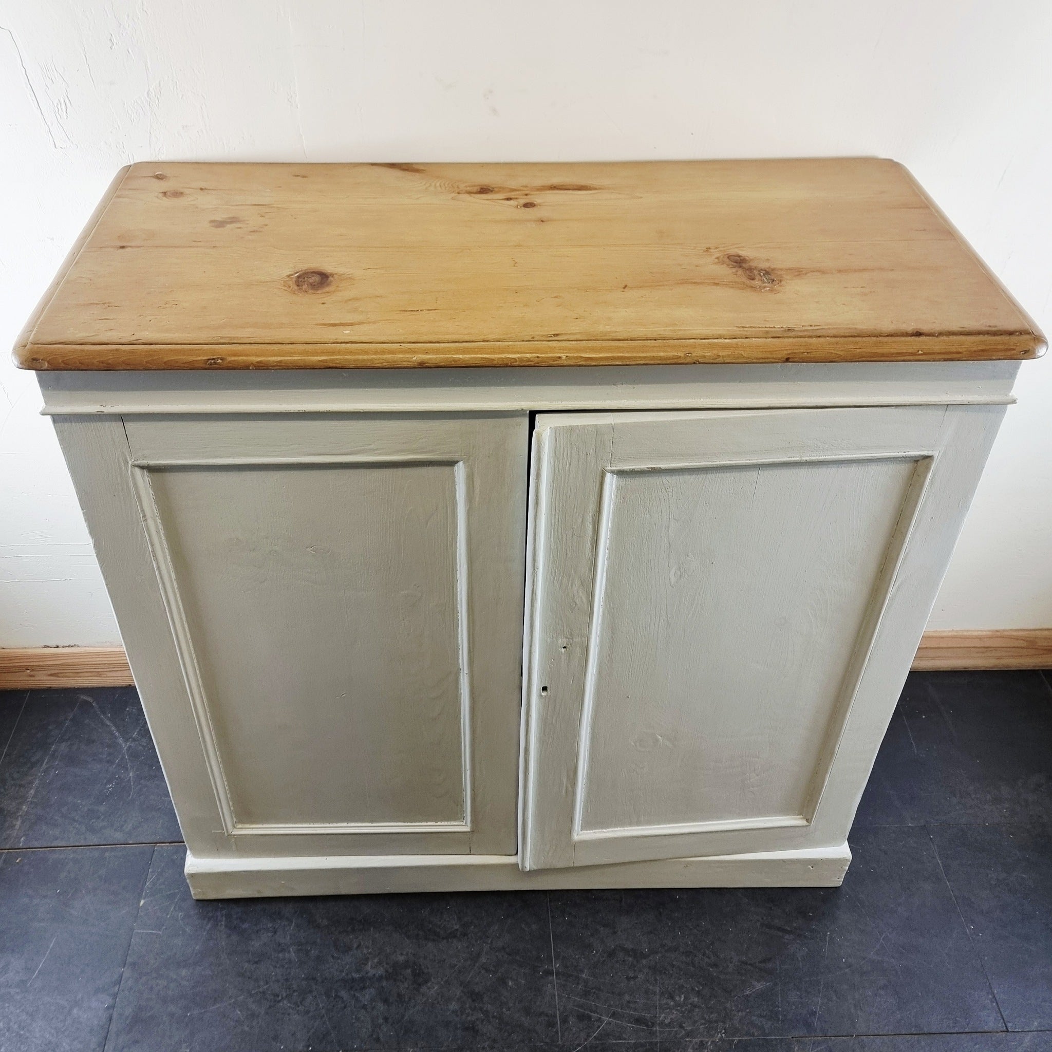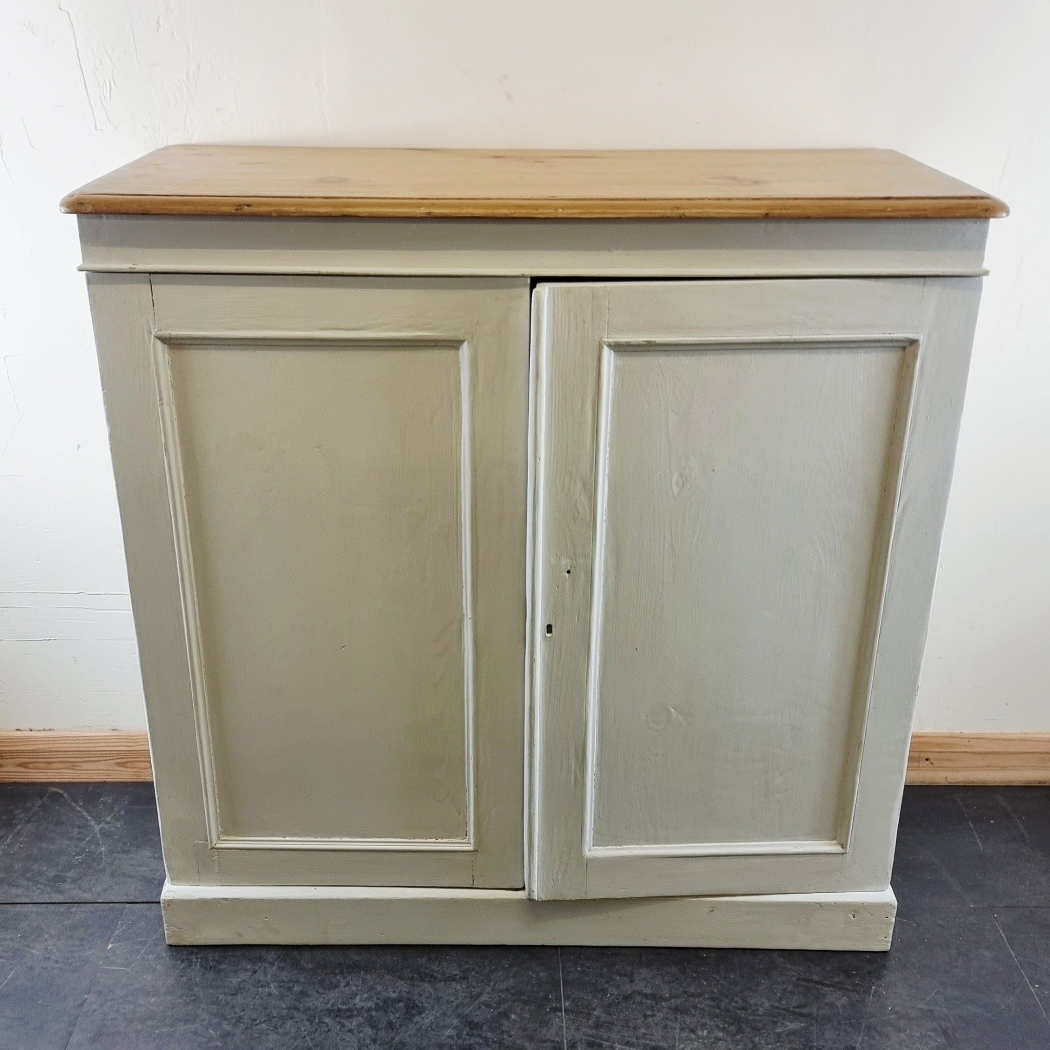 Antique 19th Century Painted Pine Cupboard. A wonderful looking pine cupboard comprising of the painted base with 2 doors and internal shelves. Has a stripped and waxed pine top on the painted pine base. Has age related wear with minor damage and areas with some later repairs. Some minor marks and scuffs. Pine knob and the key are missing.