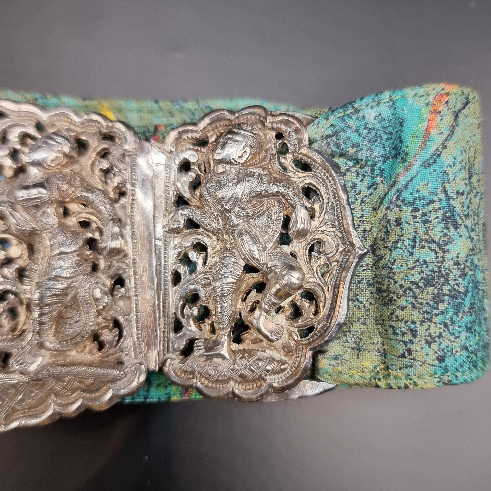 Antique 19th Century Silver Burmese Belt Buckle on original fabric Belt. The silver Buckle is unmarked and has wear from being cleaned. Rubbed down slightly. The fabric is in excellent condition overall in good condition. Weighing approximately 60 grams.