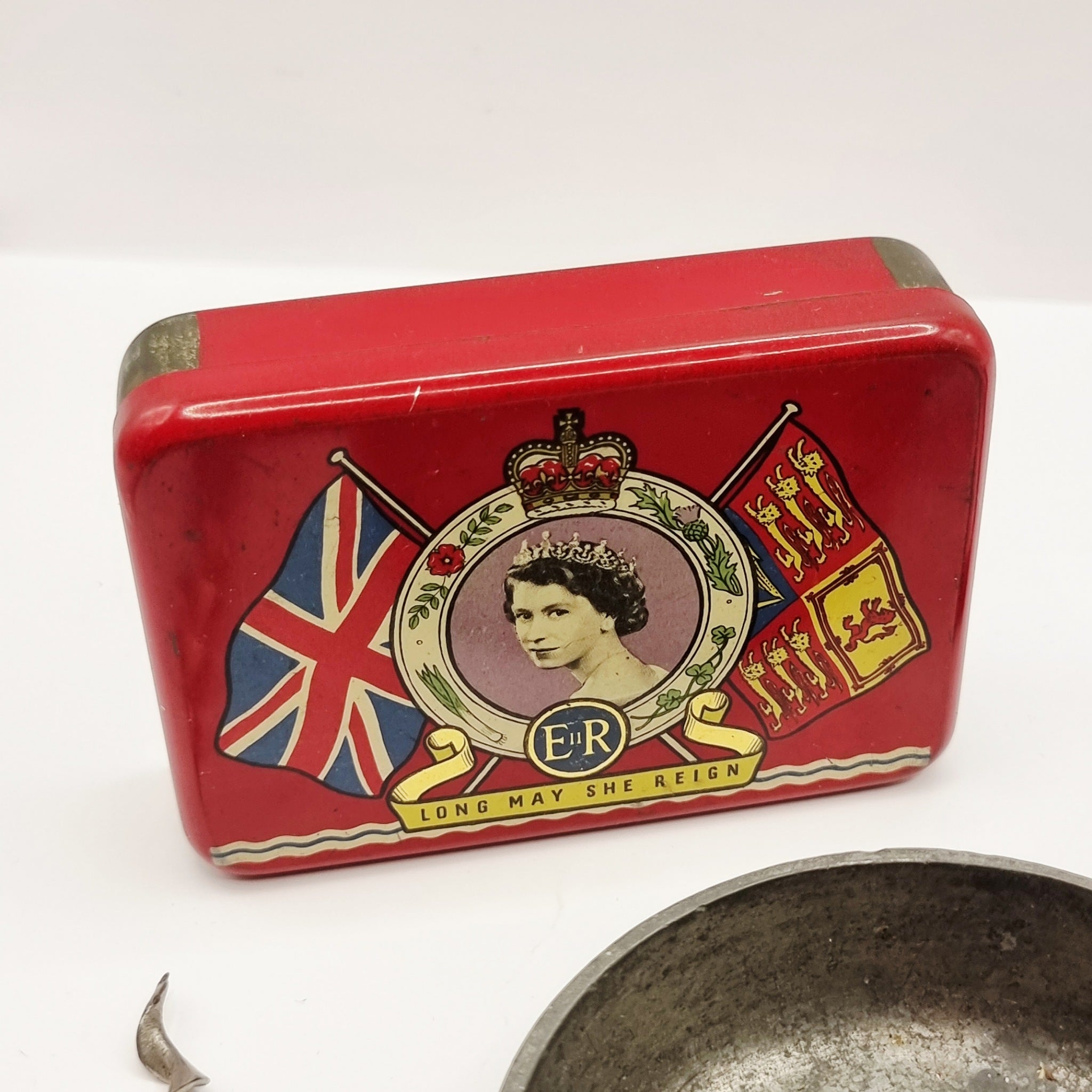Tin opener measures: Length 15cm. Carved antler Corkscrew. Length 12.6cm. Letter rack. Height 5.3cm, Width 9cm, Depth 3cm. Pewter wine sampler. Meauses: Height 2.5cm, Width 11.7cm, Depth 8.6cm. 1953 Coronation Tin. Measures: Height 2.5cm, Width 9.8cm, Depth 7cm.