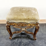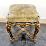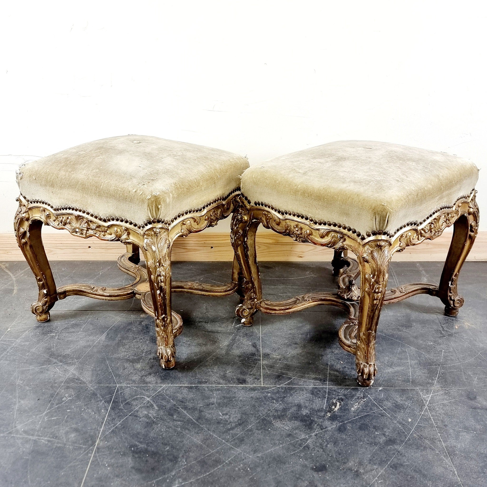 Antique Pair of French 19th Century  Carved Giltwood Stools, this fantastic untouched stools have the original but worn material still attached. Carved wood stools, with fine quality carvings. All hand carved and gilded. With the gilding being worn off over the years. All age related wear and damage. Giving this stools there lovely character and charm. One stool is missing the finial to the centre.