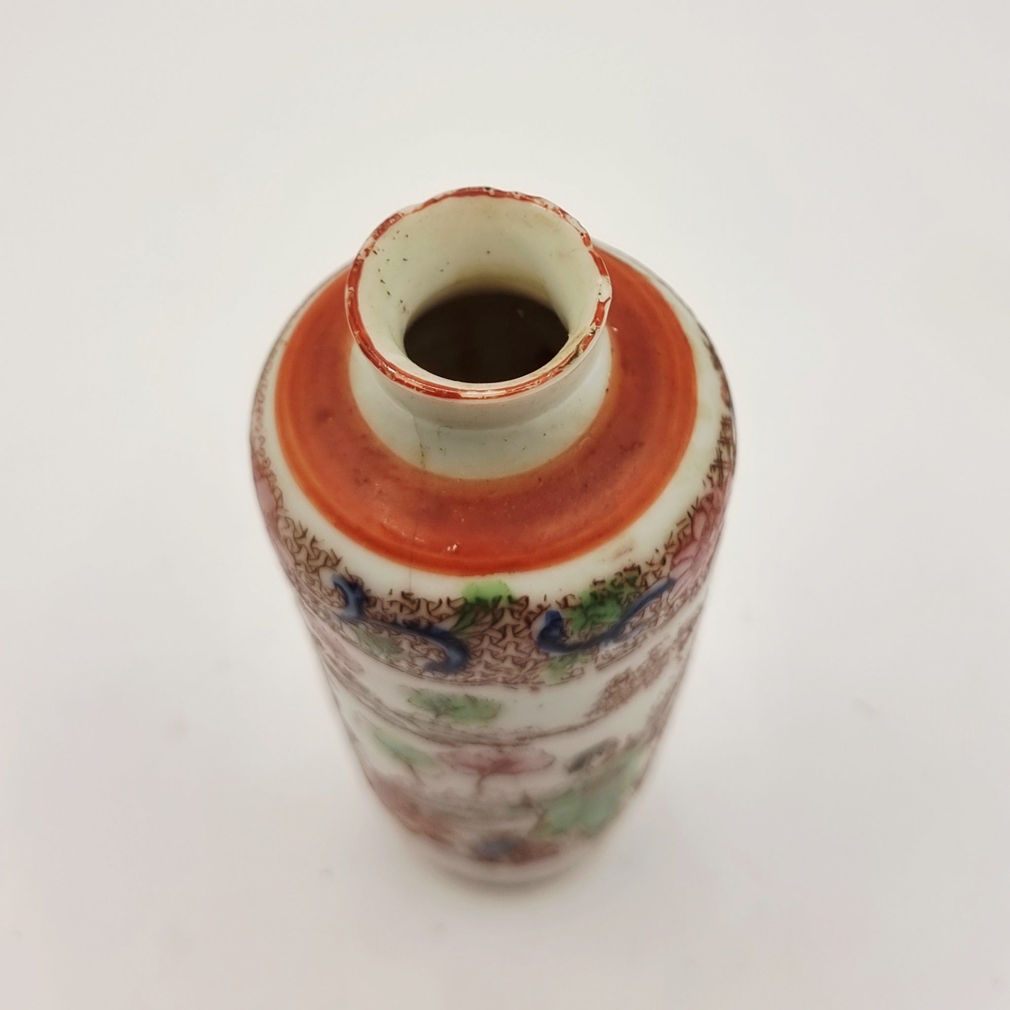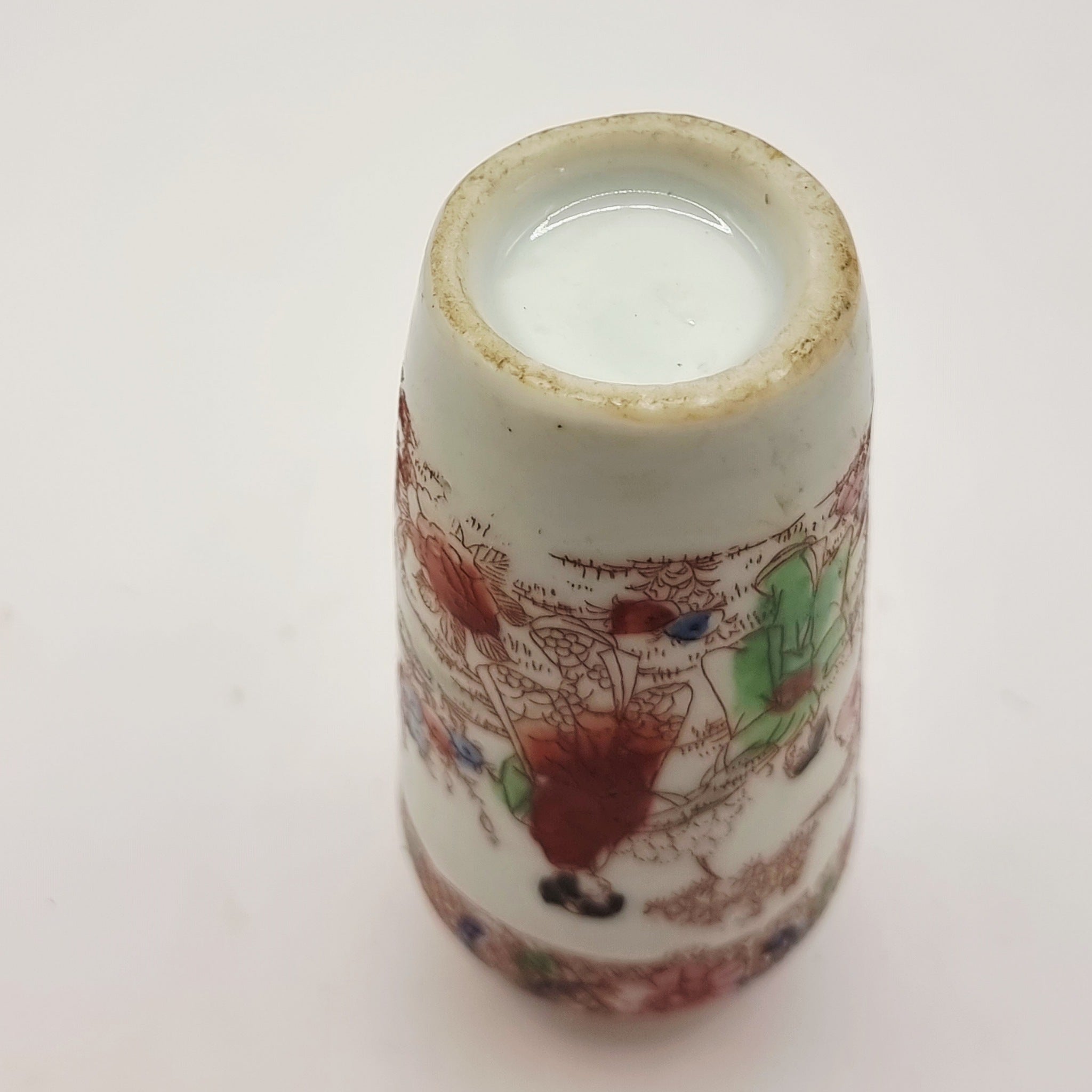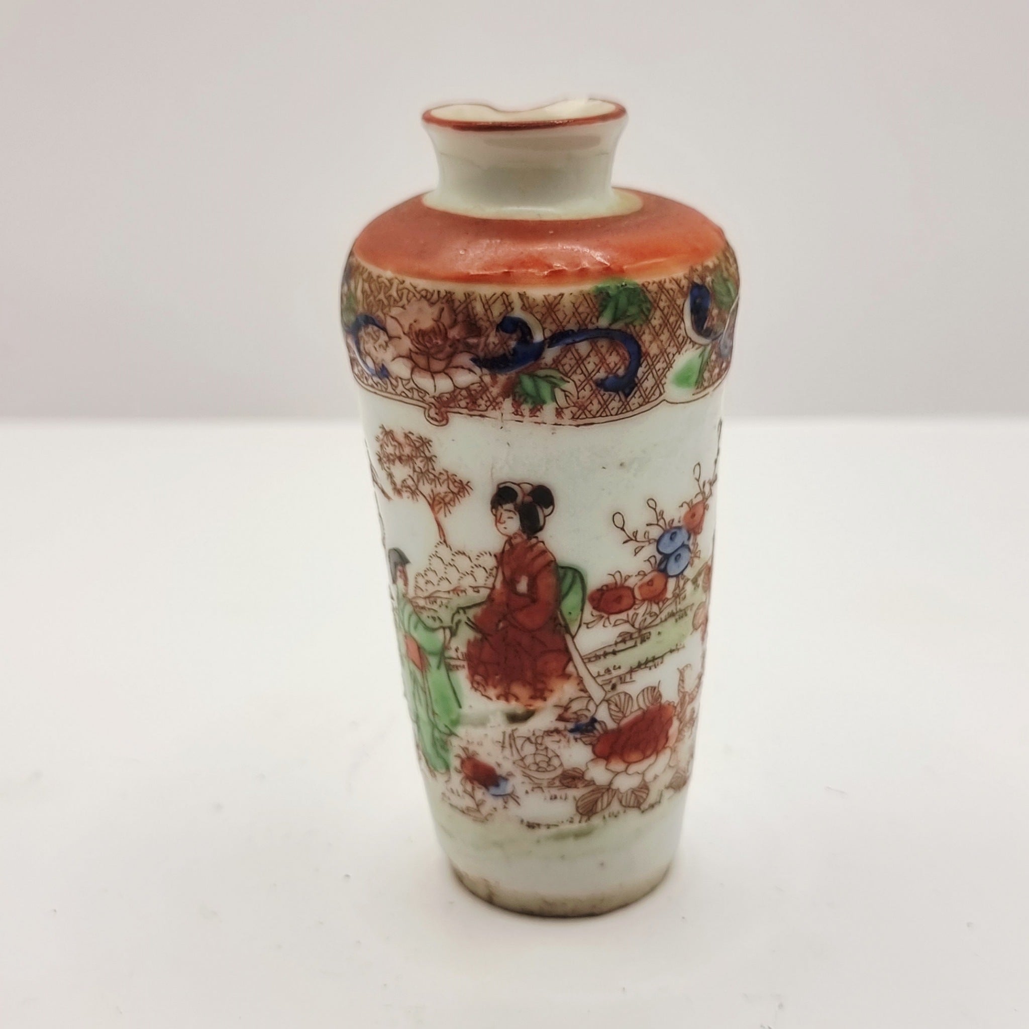 Antique near Pair of Meiji Period Kutani Ware Miniature Vases. These 20th century Vases are small in proportion. Both Vases are still vibrant in colour and showing signs of age related wear as well as makers flaws. Damage to both vases around the rim. Hairline down the middle of one vase. Scuffs and chips of places of paint.