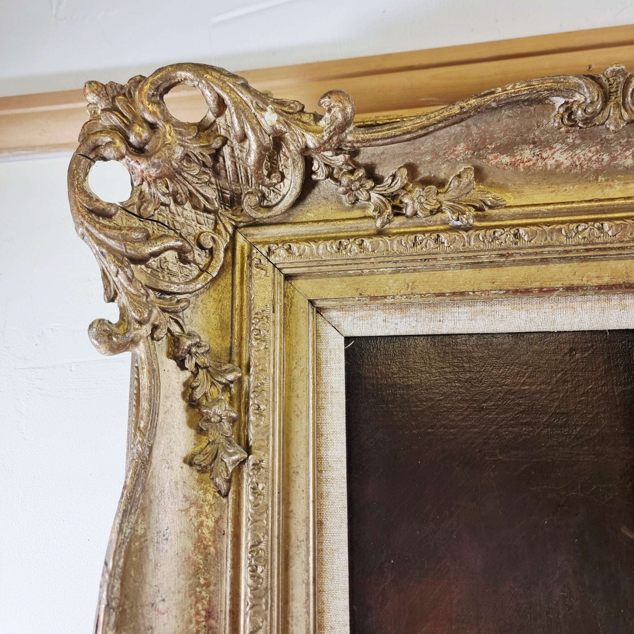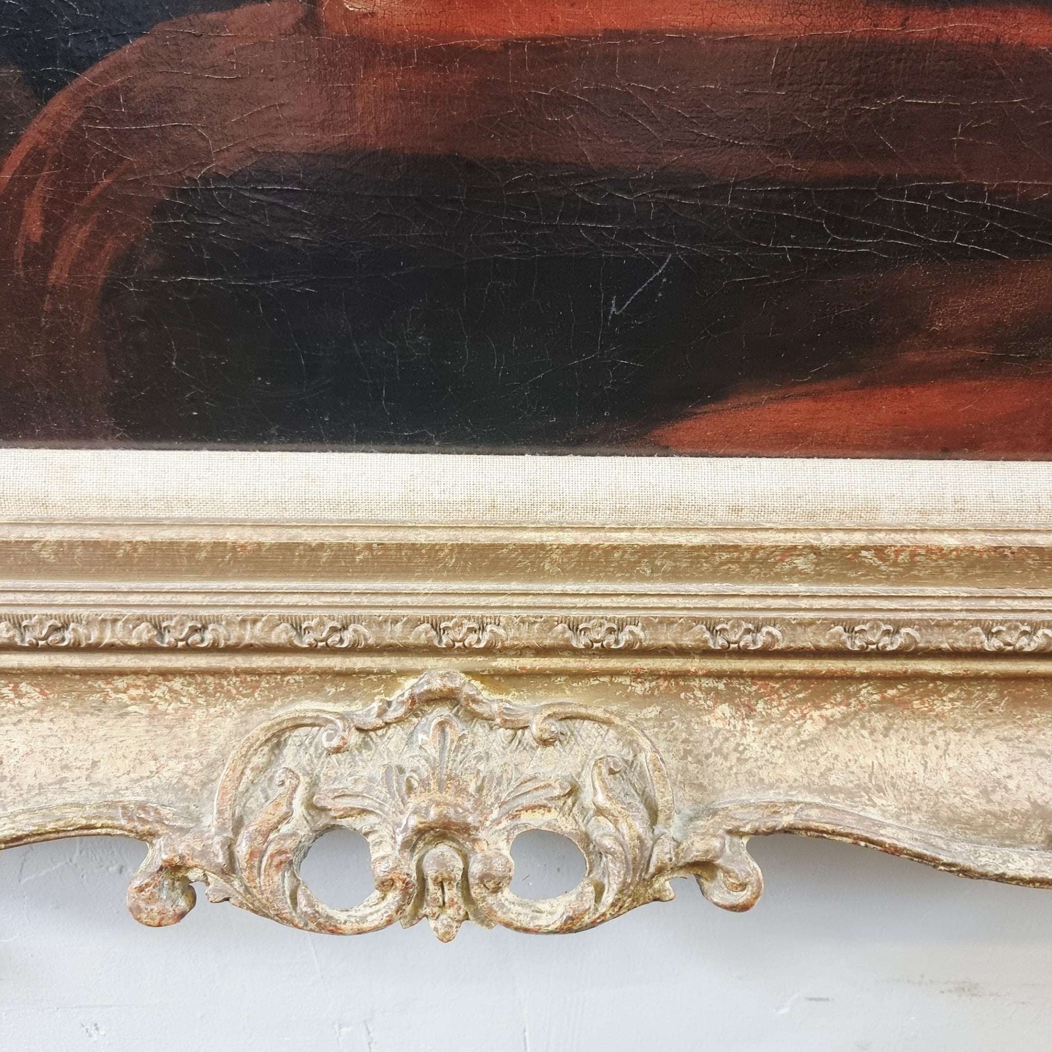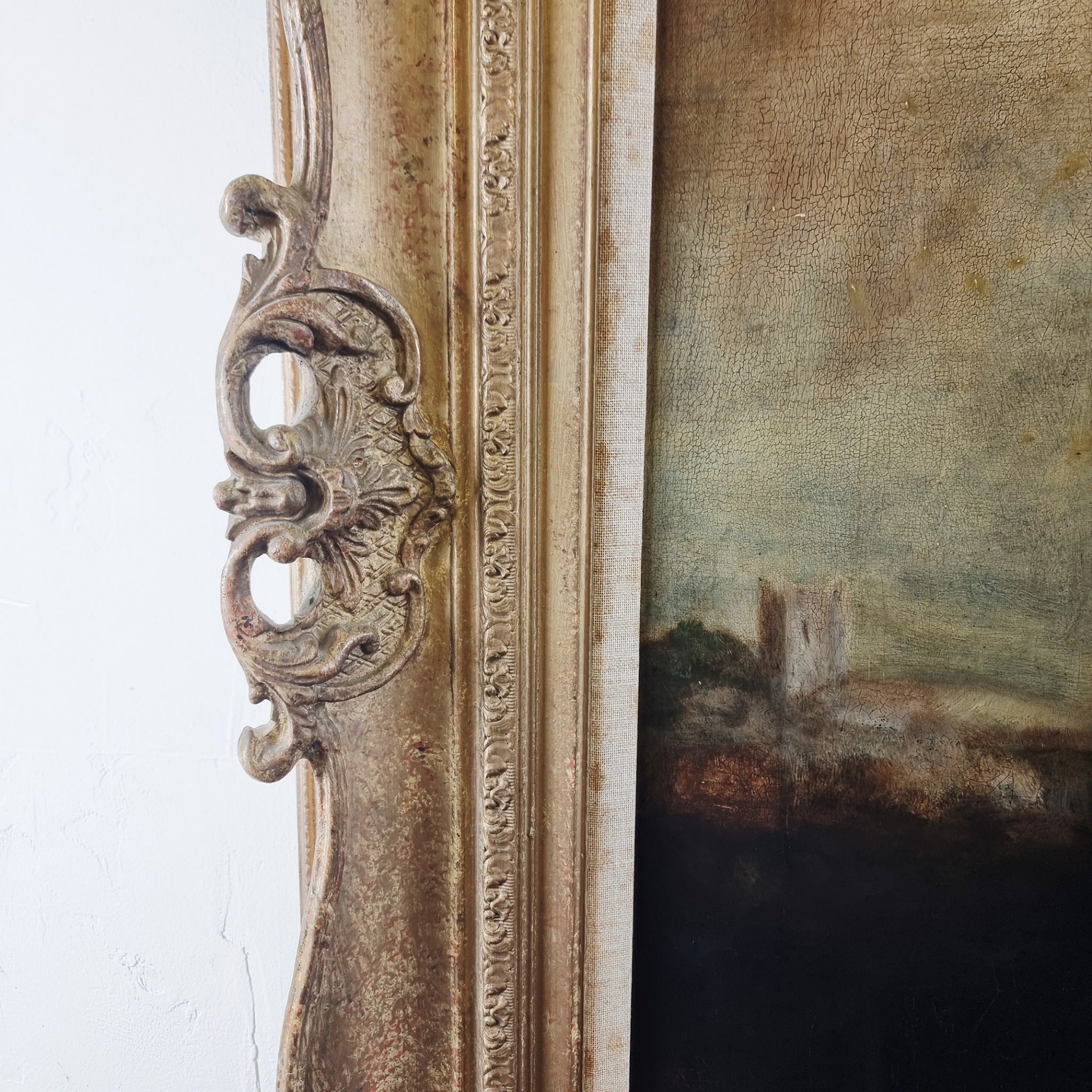 Antique Portrait of a Gentleman in 19th Century Attire Large Oil on Canvas. This is a wonderful painting of a unknown gentleman holding a drink, sitting in a chair with a castle or estate to the background. The painting has been relined and reframed. The frame is showing signs of damage and there is a mark to the painting. The portrait is unsigned. All damages are shown in the photographs as well as how nice this painting looks.