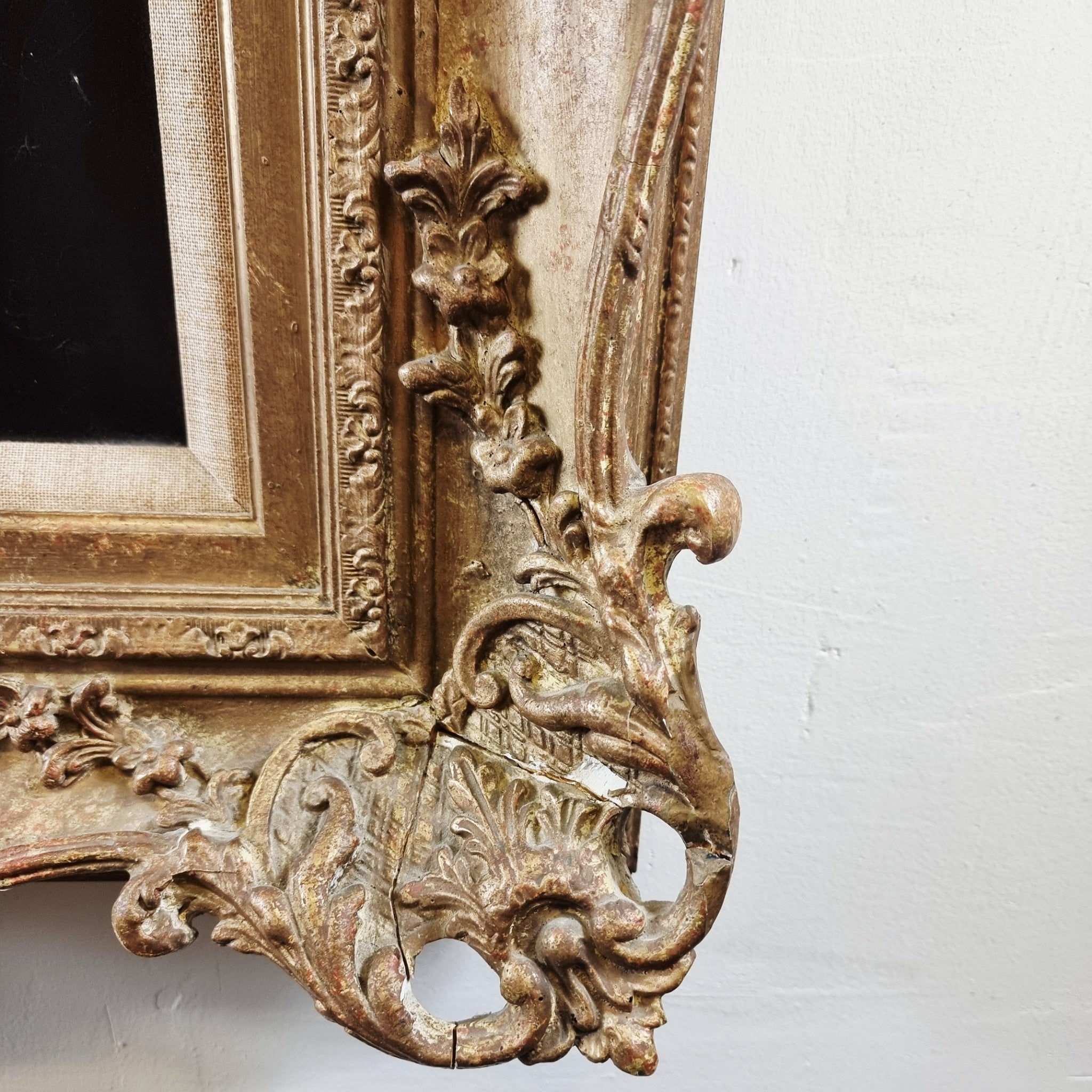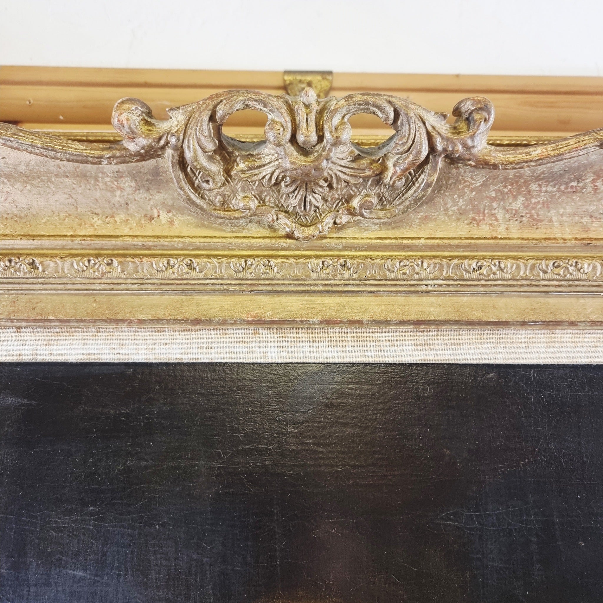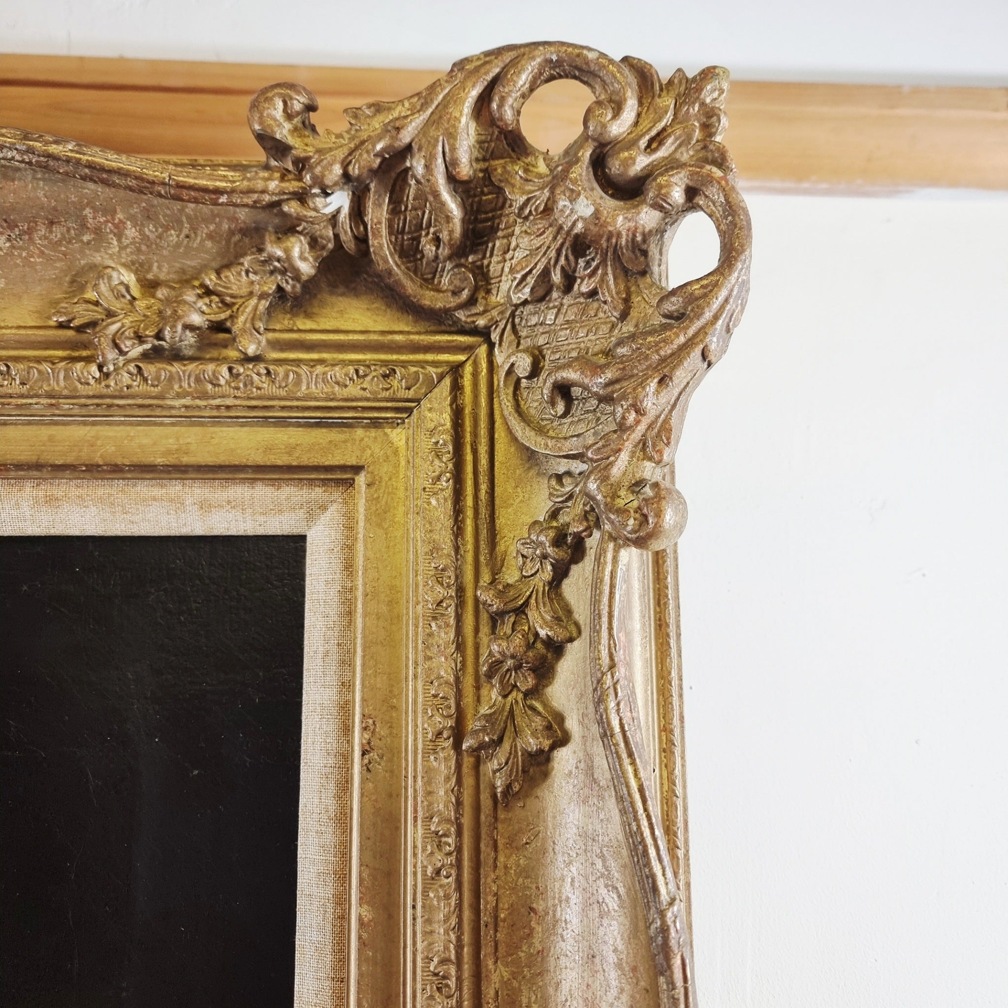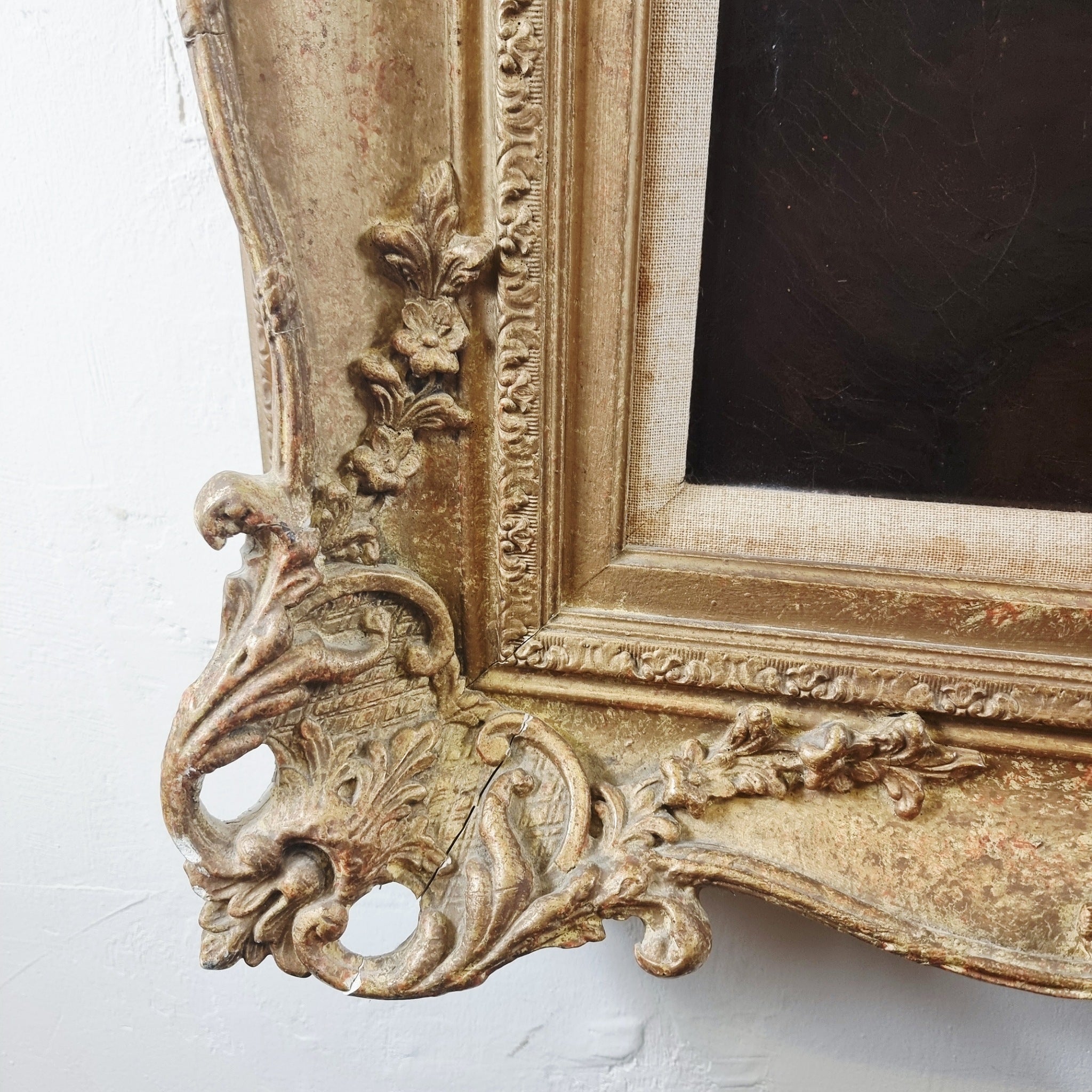 Antique Portrait of a Gentleman in 19th Century Attire Large Oil on Canvas. This is a wonderful painting of a unknown gentleman holding a drink, sitting in a chair with a castle or estate to the background. The painting has been relined and reframed. The frame is showing signs of damage and there is a mark to the painting. The portrait is unsigned. All damages are shown in the photographs as well as how nice this painting looks.