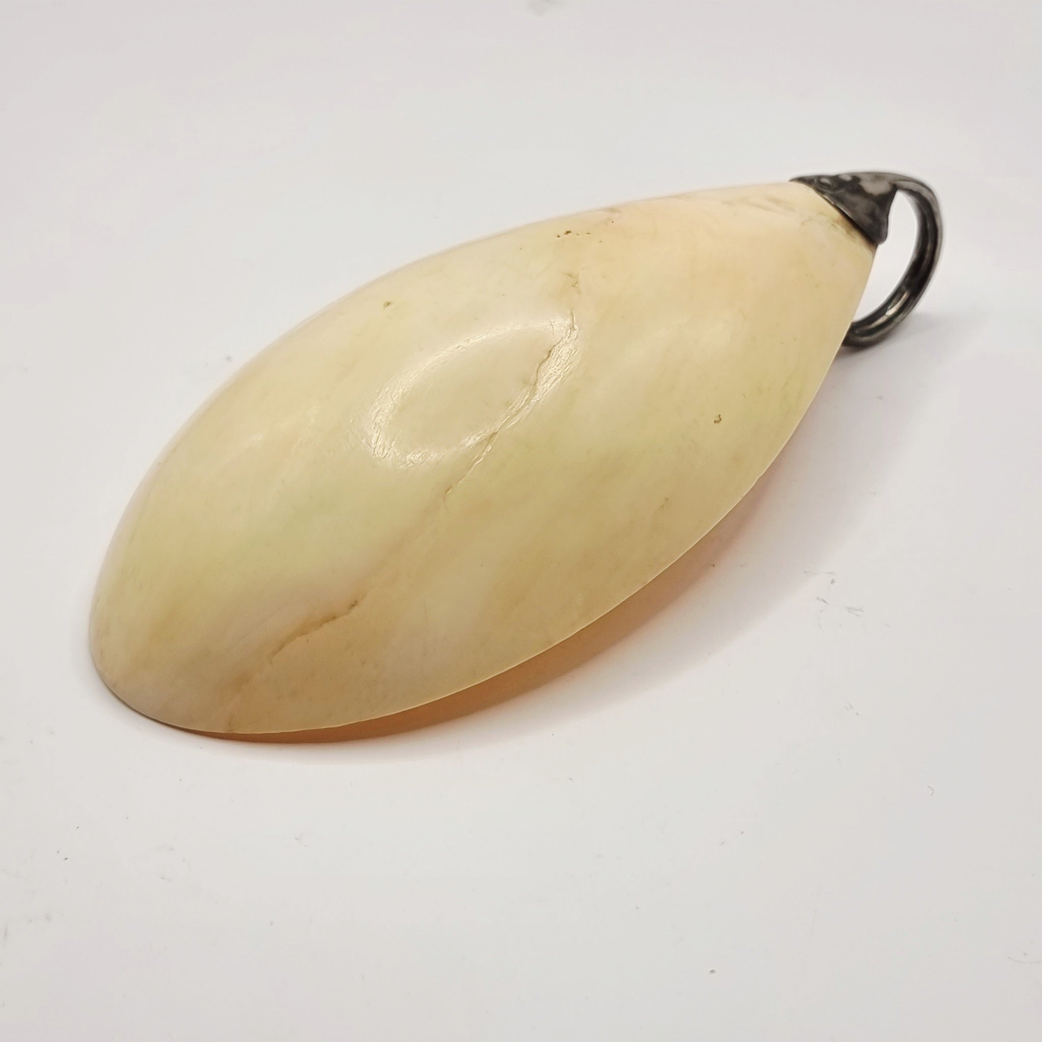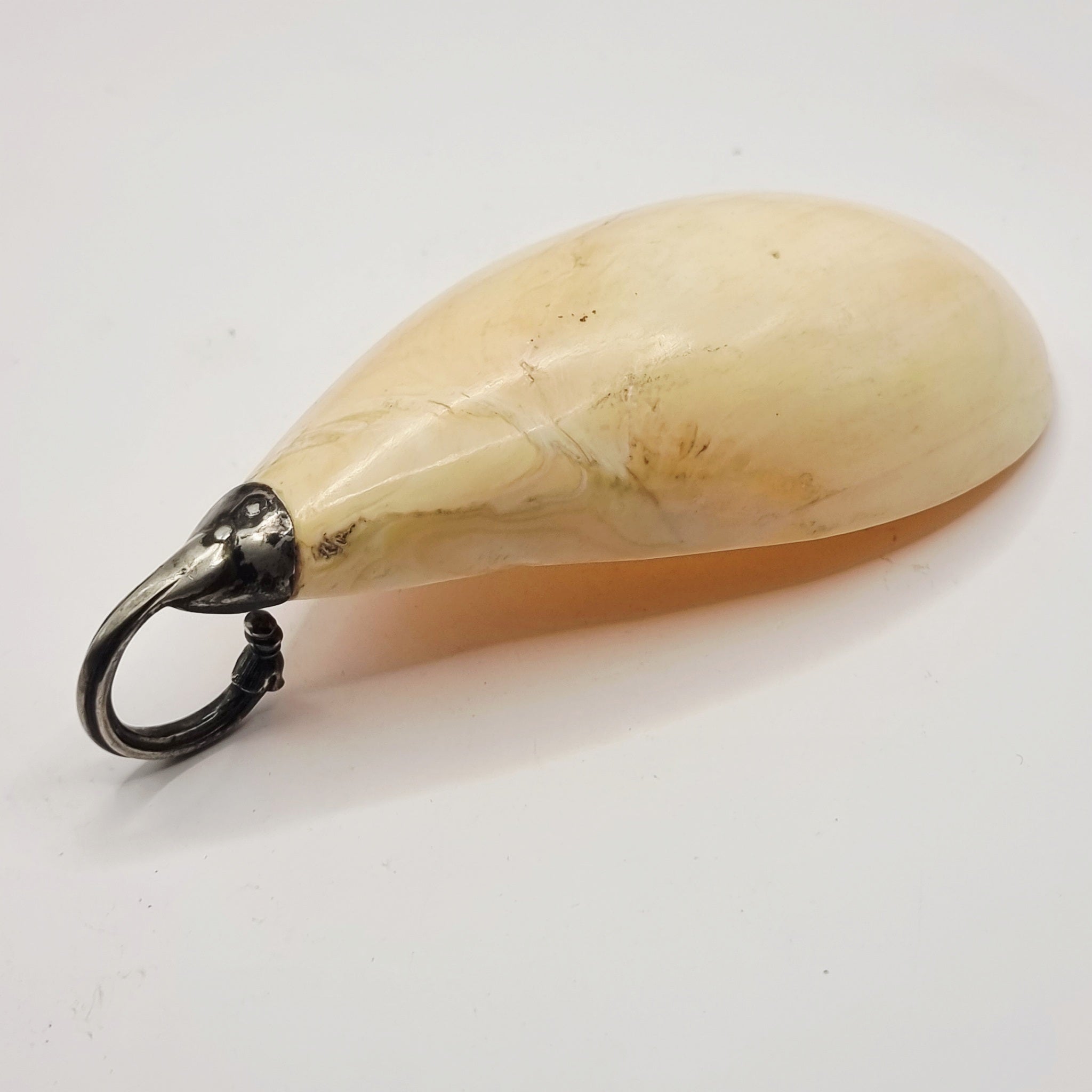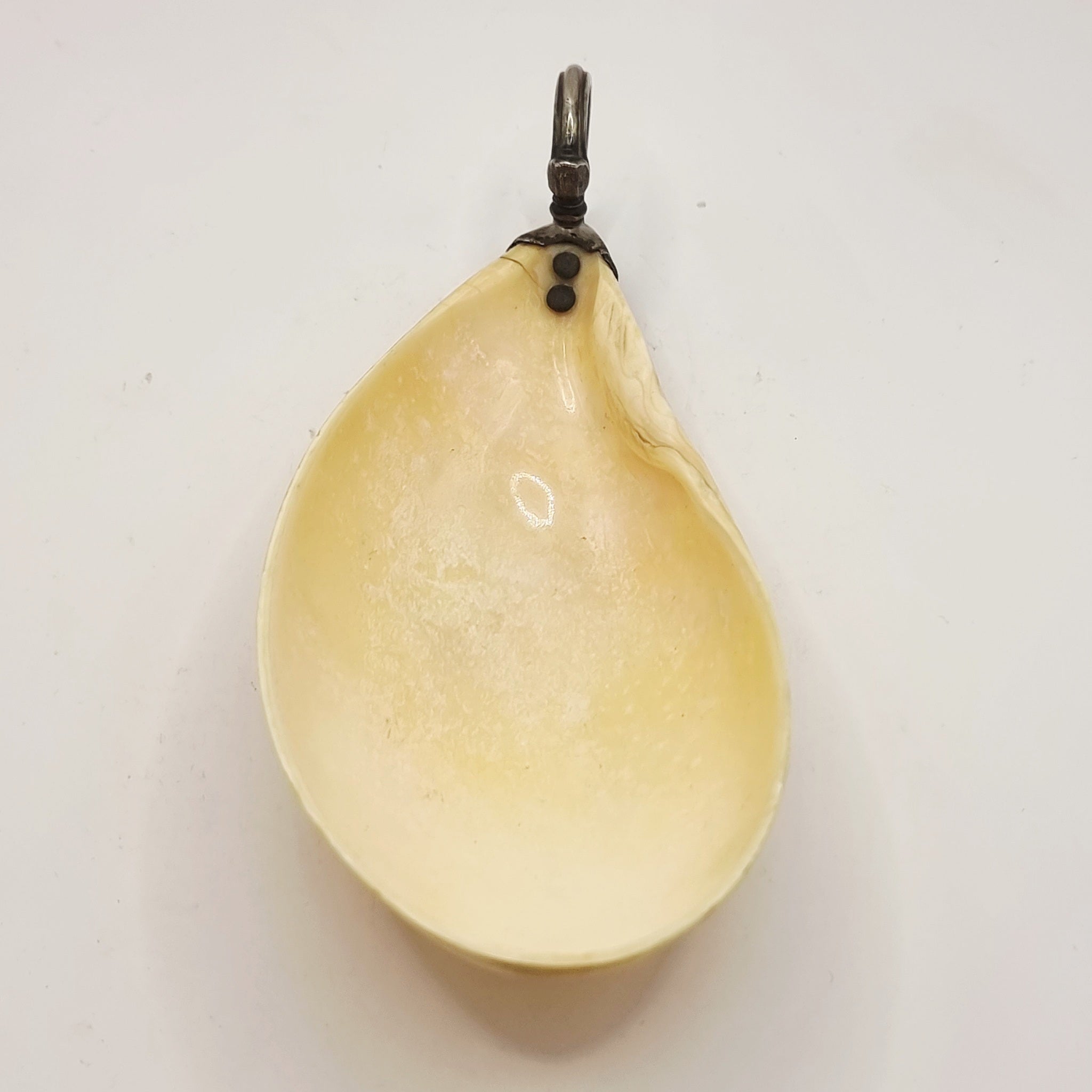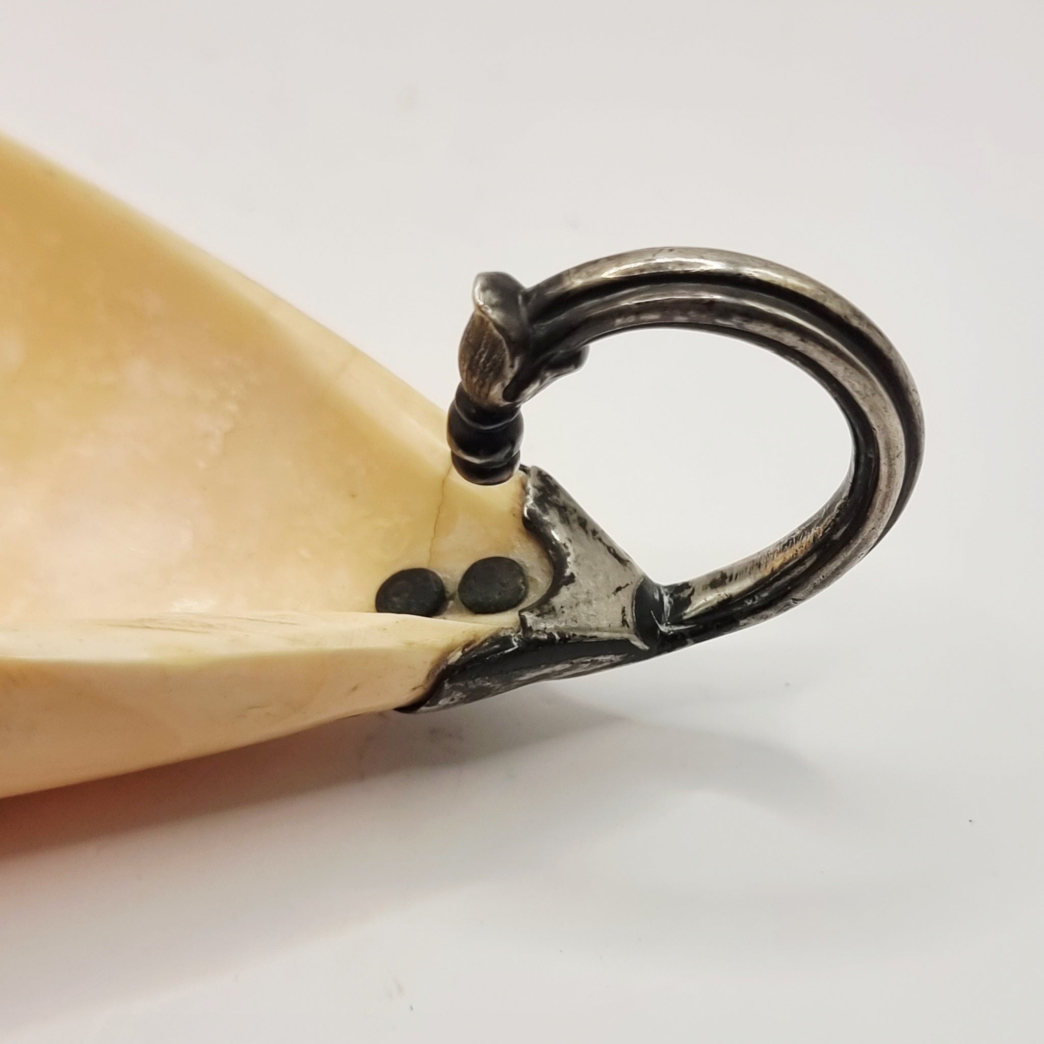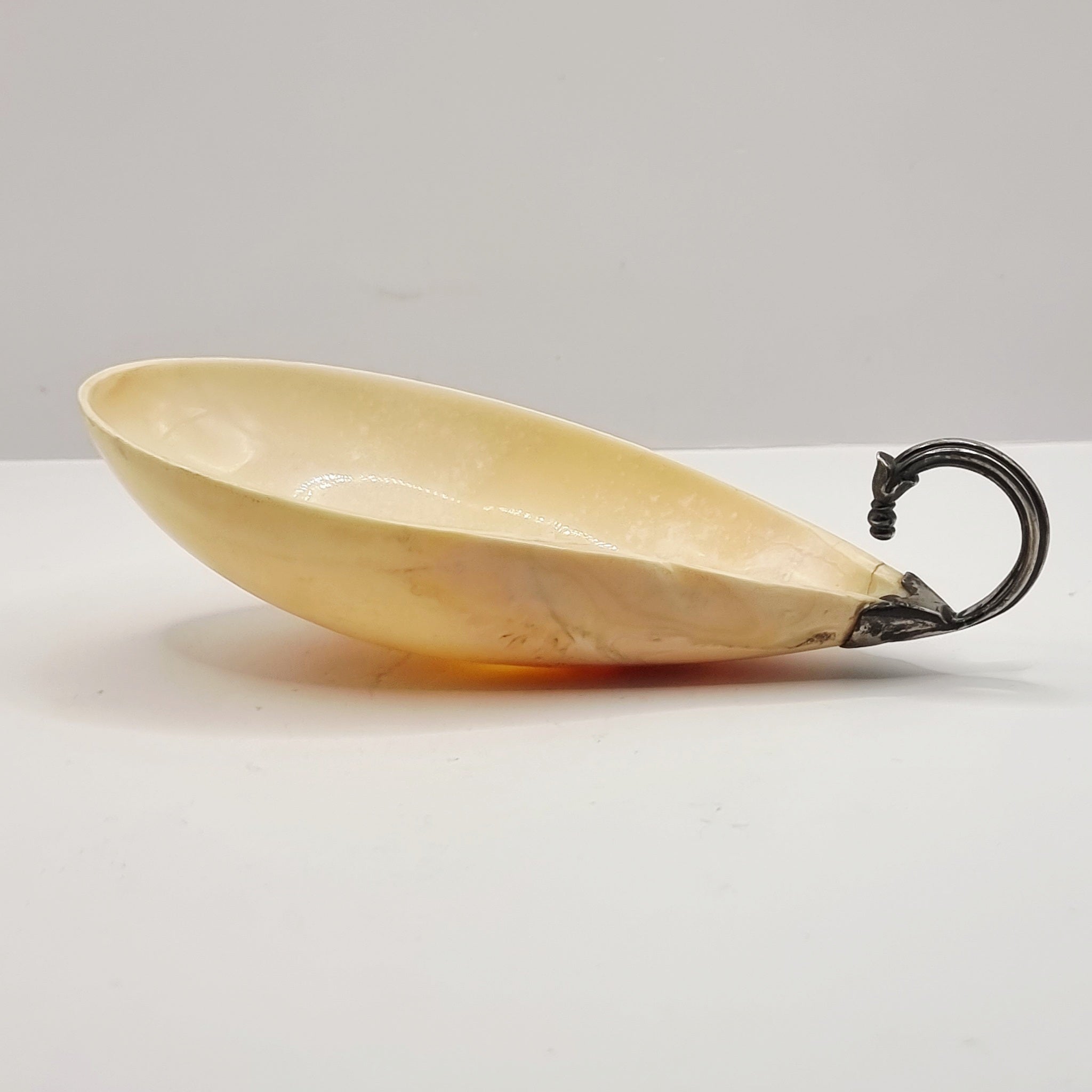 Antique rare and unusual Large Mussel shell with unmarked silver Handle. The polished shell is believed to used as a Feeder. This is a beautiful shell. Where the handle is fixed the shell has a crack. This does not effect the structure of this piece.