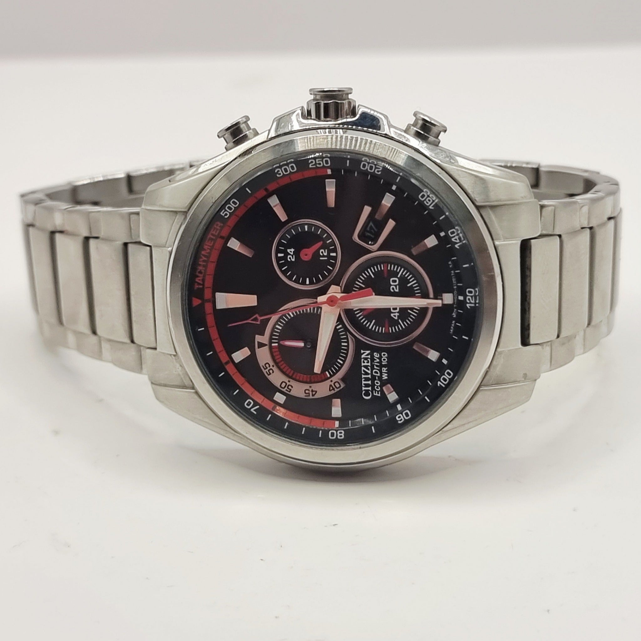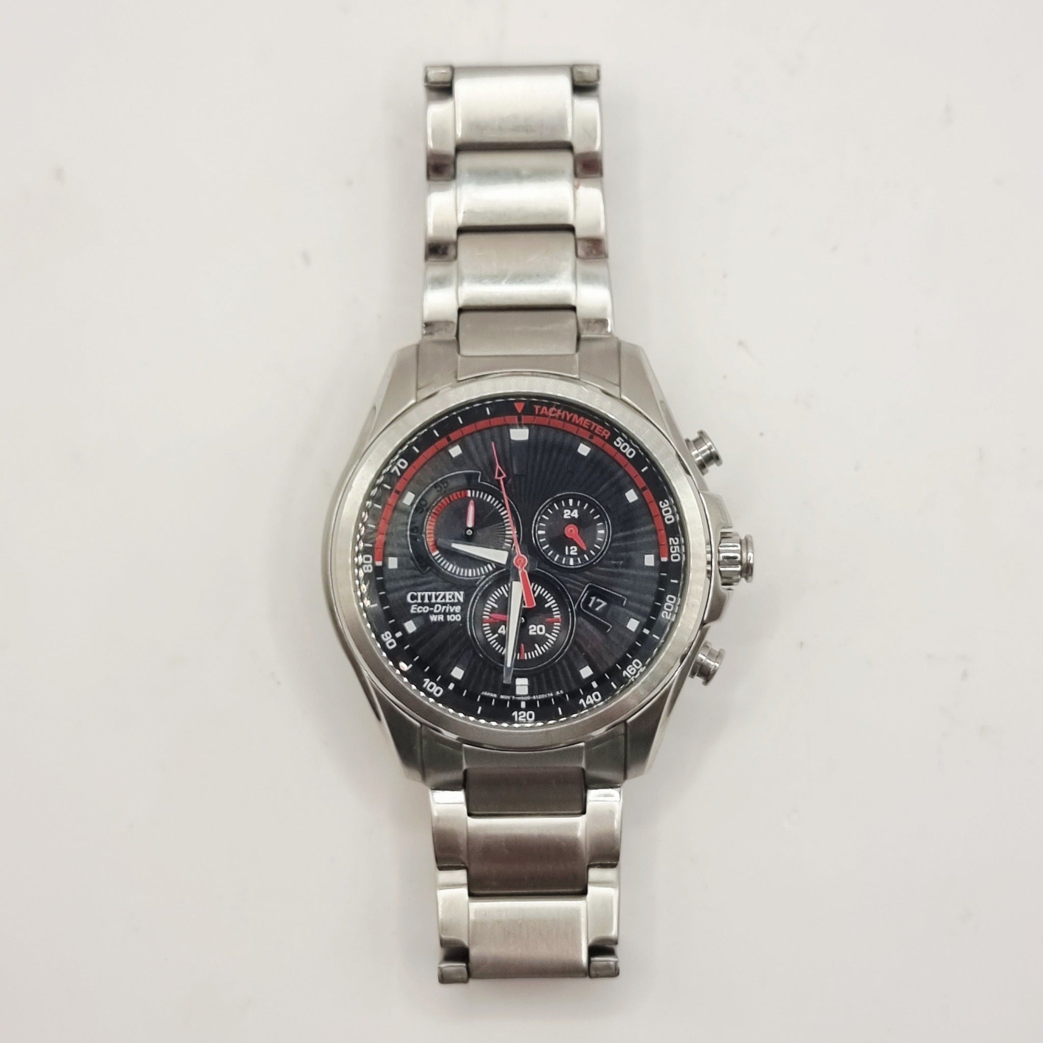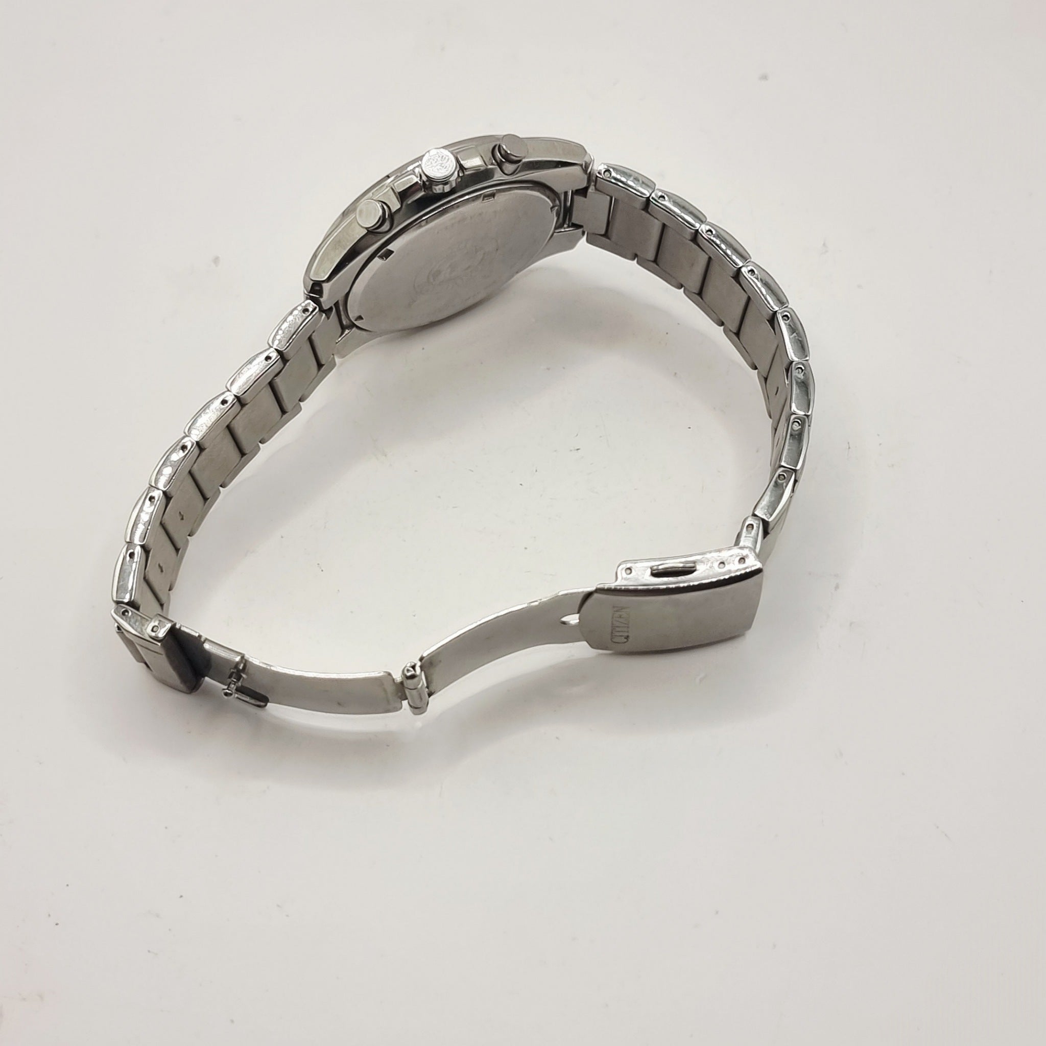 Citizen Eco-Drive WR 100 Chronograph in good working order. This is a great looking watch. Solar powered. And seems to be working fine for the last week. Looks to be in good condition may have minor marks but none that i have seen.