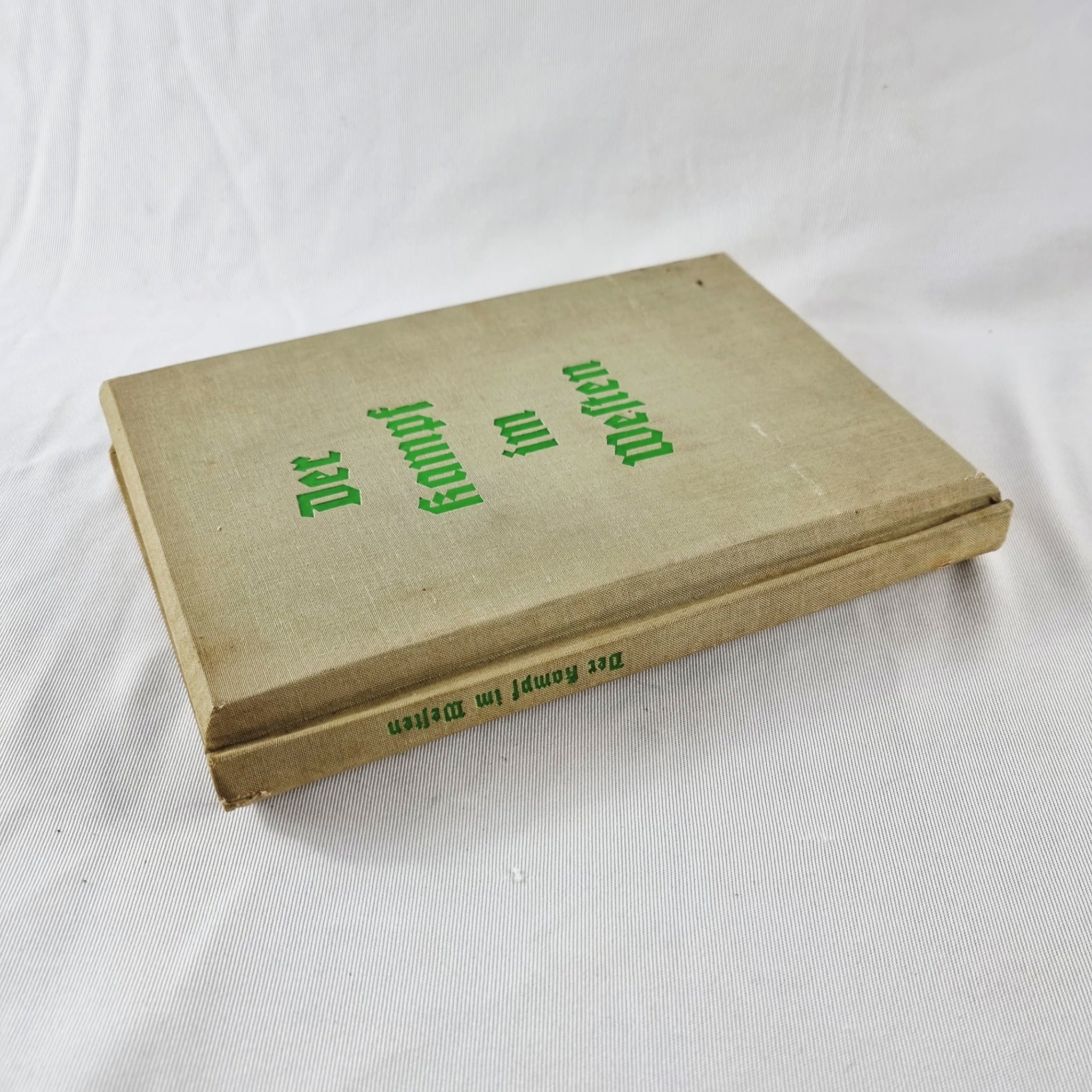 Der Kampf Im Weften with 100 Photos of the War, World War II. (The Struggle in the West). It is a historical propaganda piece from the Nazi era, published in 1940, documenting the German military campaigns in France and the Low Countries during World War II. With stereo glass Photos and glasses fitted to the interior. In great condition.