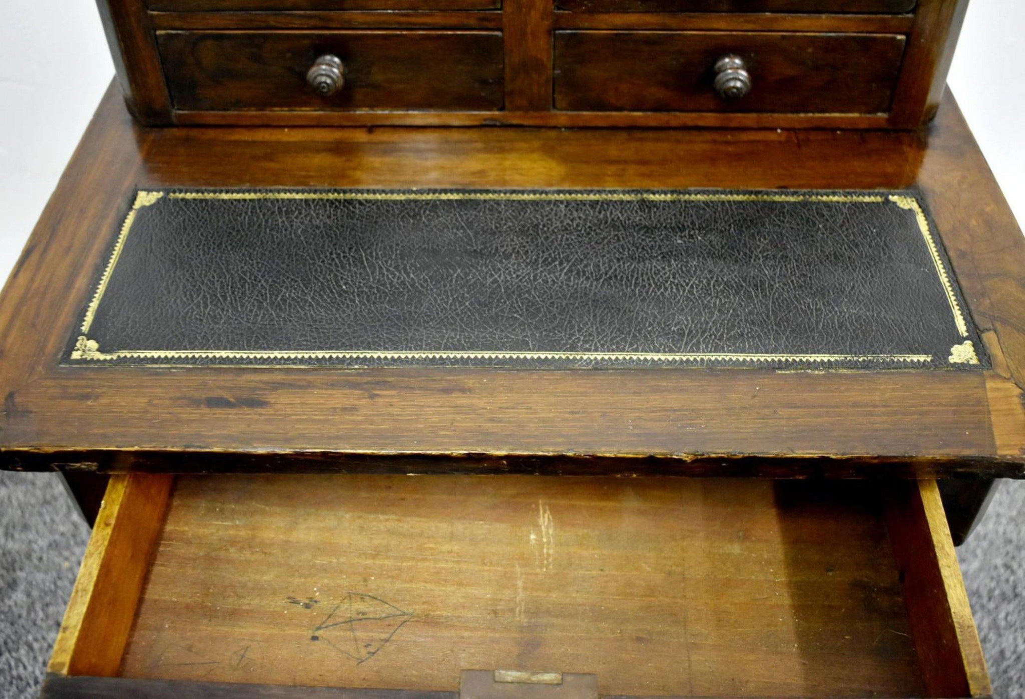 - This desk features five draws, with the top section covered in a mahogany veneer over pine and solid mahogany legs to the underneath.