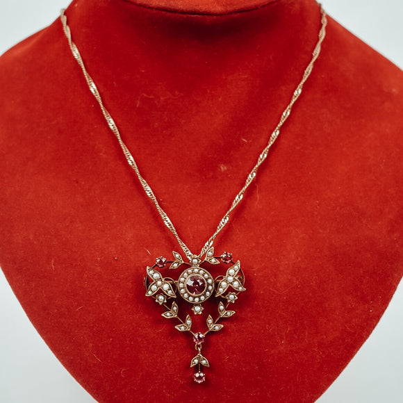 This lovely pendent could also double up as a brooch, in the shape of a heart with a centre stone approx. 1ct in size in a lovely shade of pink amethyst, surrounded by seed pearl in a circular form, it then branches of to the top and bottom and sits two single seed pearl's in flower gold design. Either side of the design includes a leaf pattern fitted with seed pearls and more pink amethysts to the shoulder part of the pendant, the design then travels down to a larger leaf with seven seed pearl's in each stem connecting to the flower design which they continue down too two more pairs of leaves fitted with pearls and meeting in the middle with another pink amethyst which is then looped to a drop with another pair of gold leaves just above the last pink amethyst. Stamped 9ct to the reverse of the pendant.