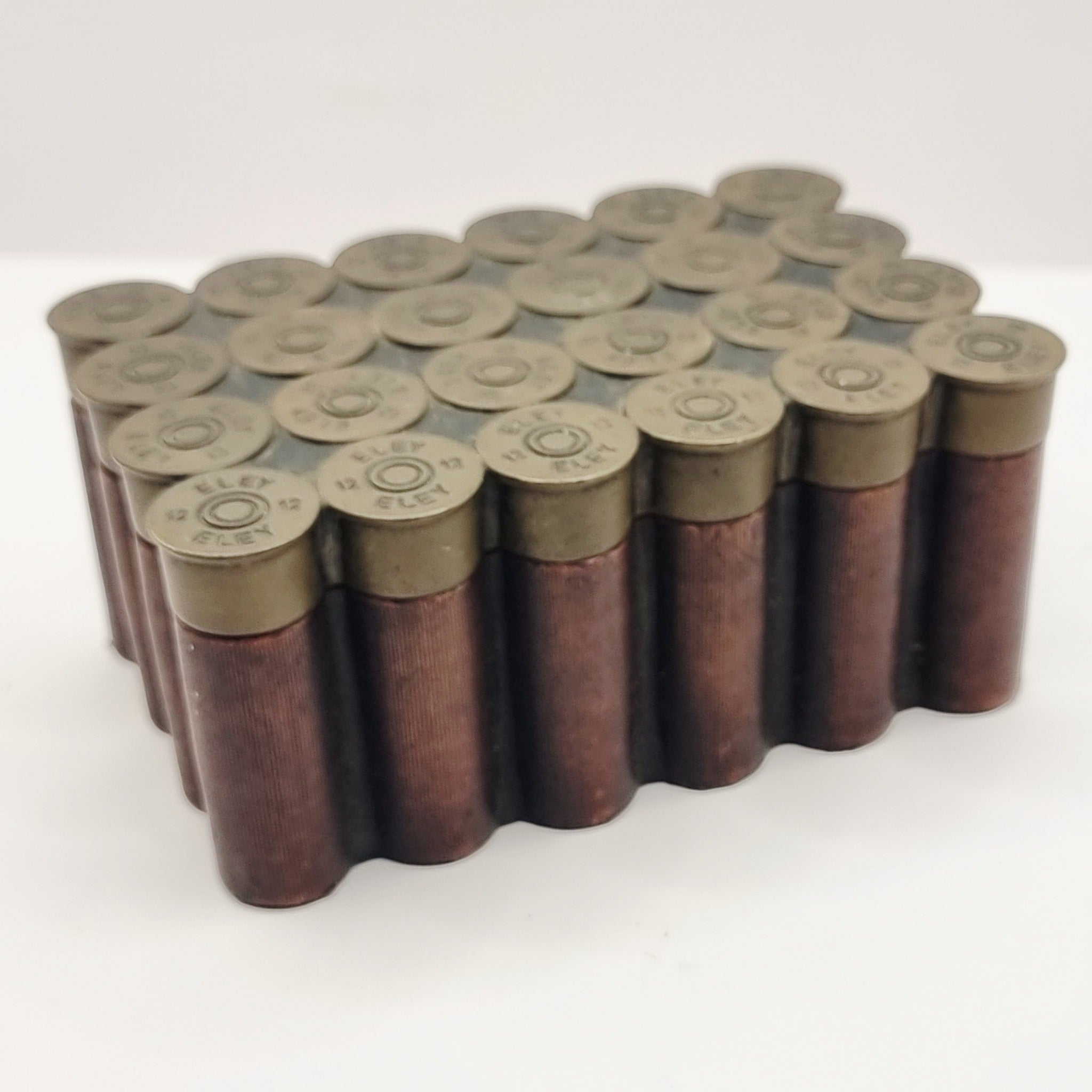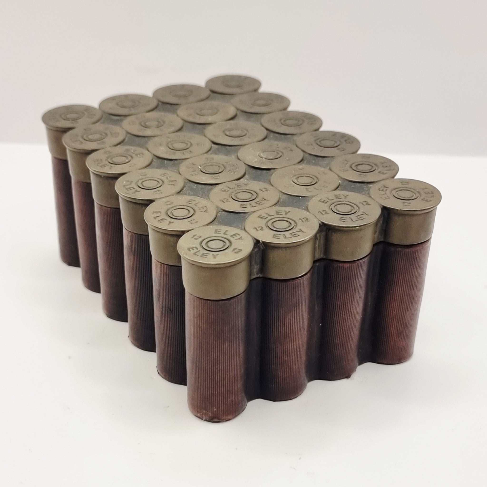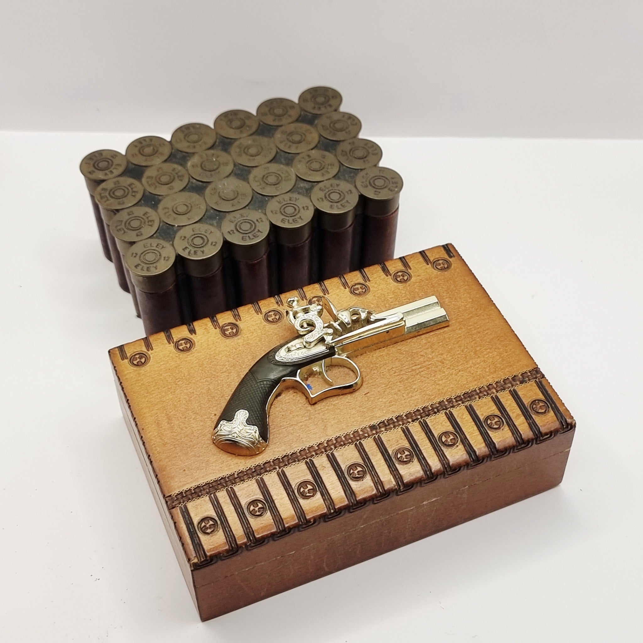 Enesco Faux Shotgun Shell Trinket Box. Made out of resin. With felt to the underneath and underneath the lid. Original paperwork inside. This is a lovely box and goes well with the pistol box. In good condition.