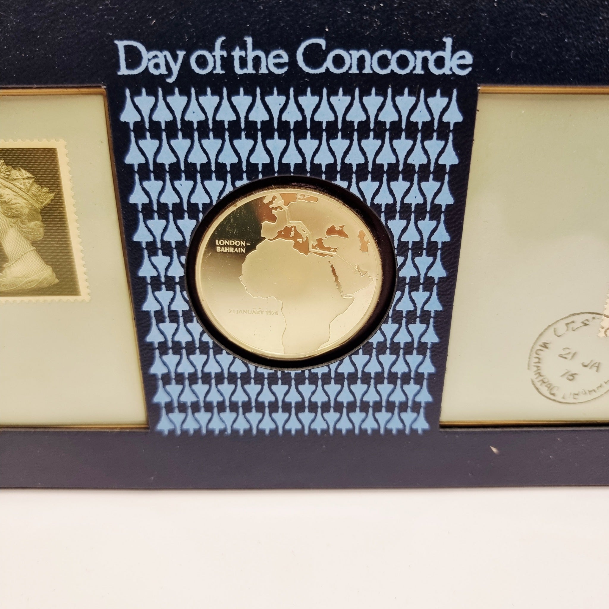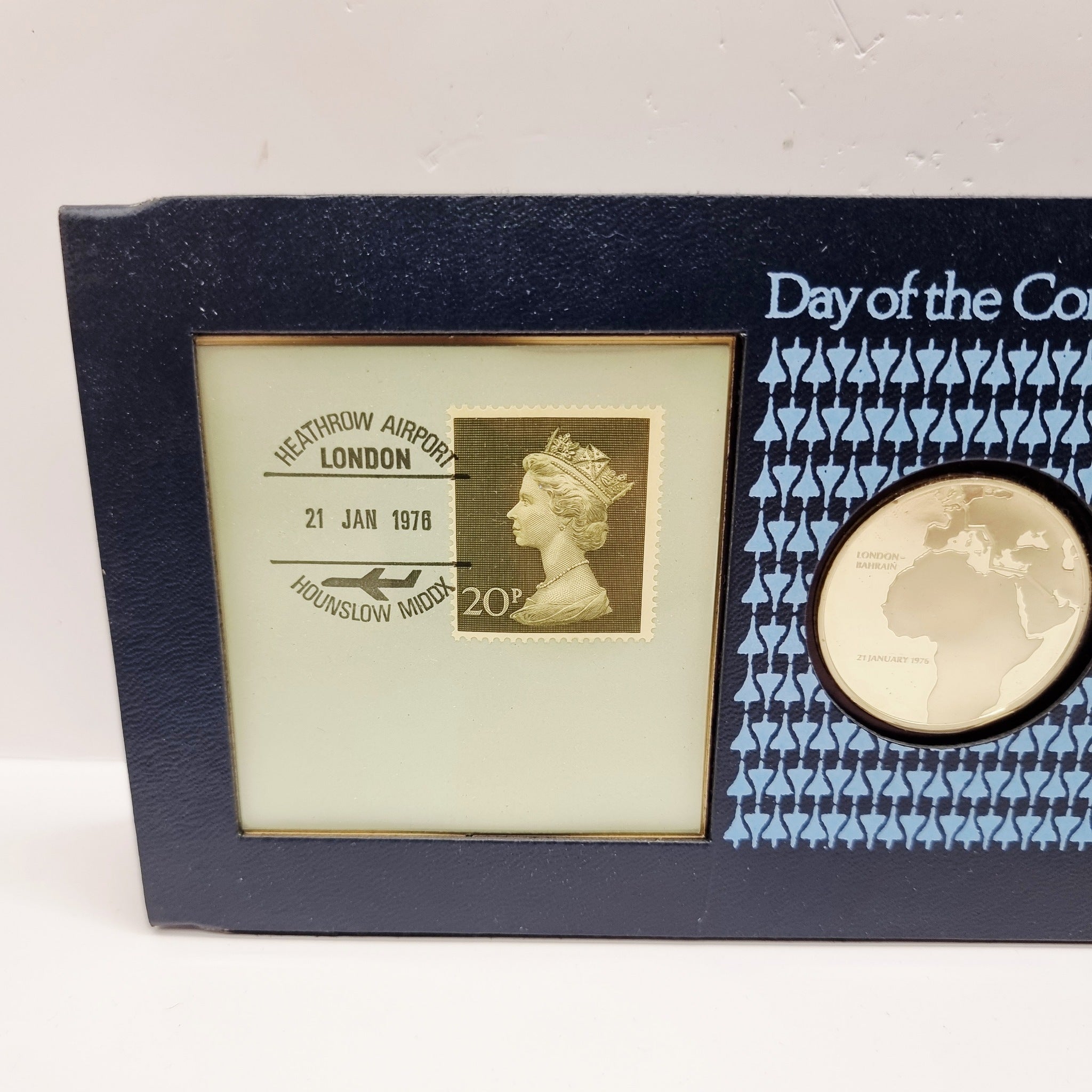 First Day Cover Silver Coin Day of the Concorde to commerate the first supersonic commercial flight London to Bahrain distance of 3780 miles. Time 3hrs and 38 mins. On 21st January 1976. Looks to be in great condition. Housed inside a cardboard sleeve, which has slight age related wear.
