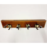 Set of Four Antique Cast iron coat hooks/ hangers with brass number plates, Numbered 274, 275, 276 and 277. The hooks are screwed down with brass flathead screws to an antique pitch pine mount. The hooks have a lovely old patina to them and look fantastic on the pitch pine backing.