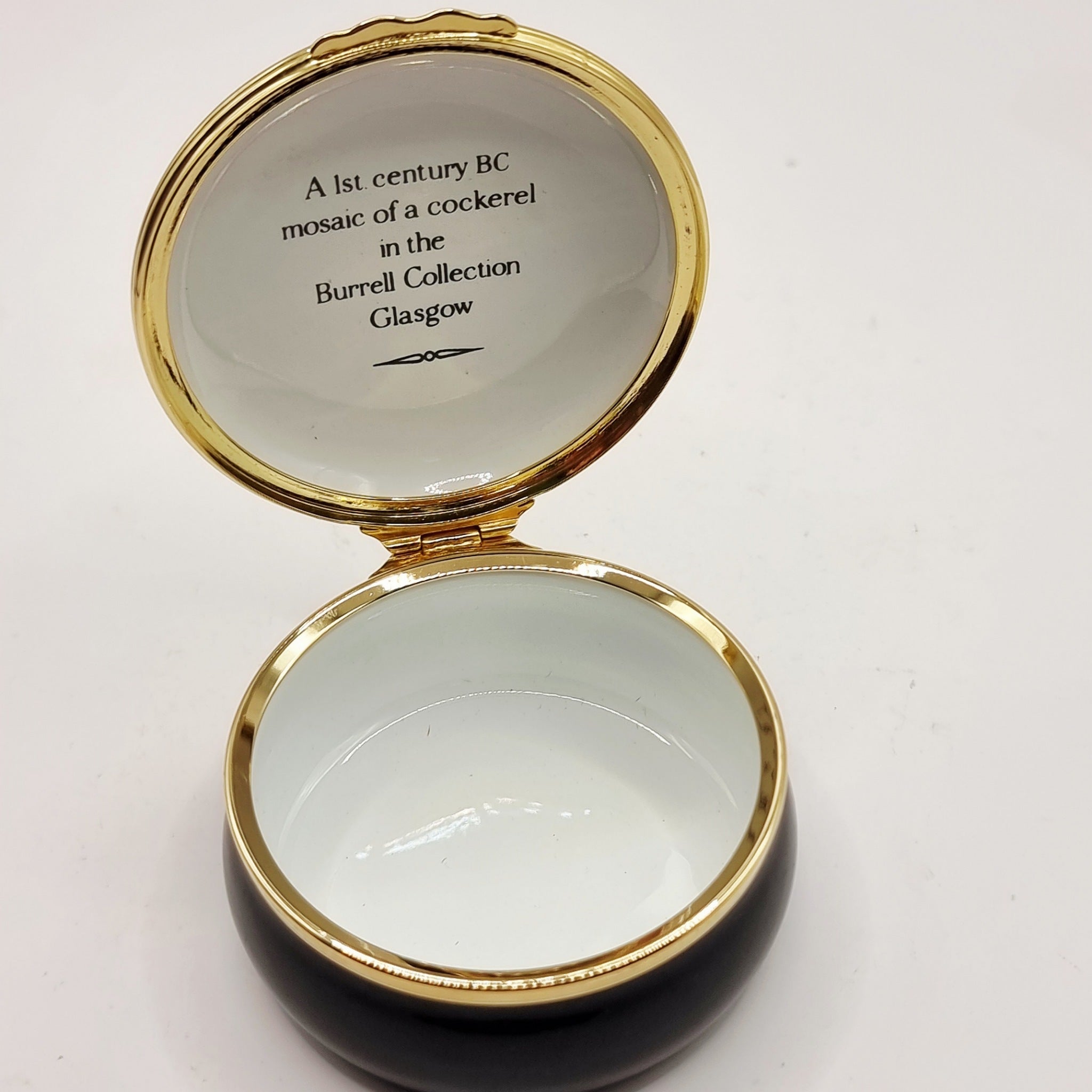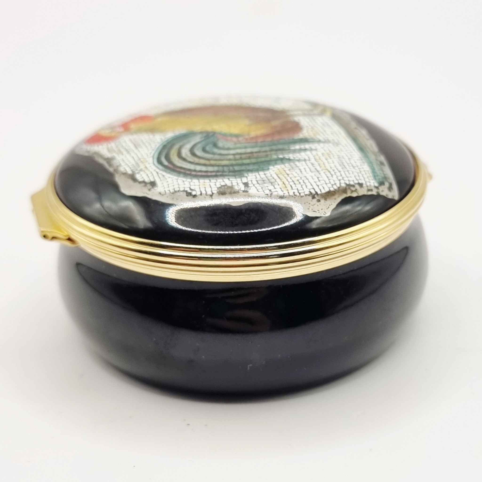 Halcyon Days Enamels Mosaic of a Cockerel Enamel Trinket or Pill Box. A 1st century bc mosaic of a Cockerel in the burrell collection Glasgow, commissioned by Recollections Ltd. This is a wonderful larger trinket box than some of my others in the collection. In great condition.