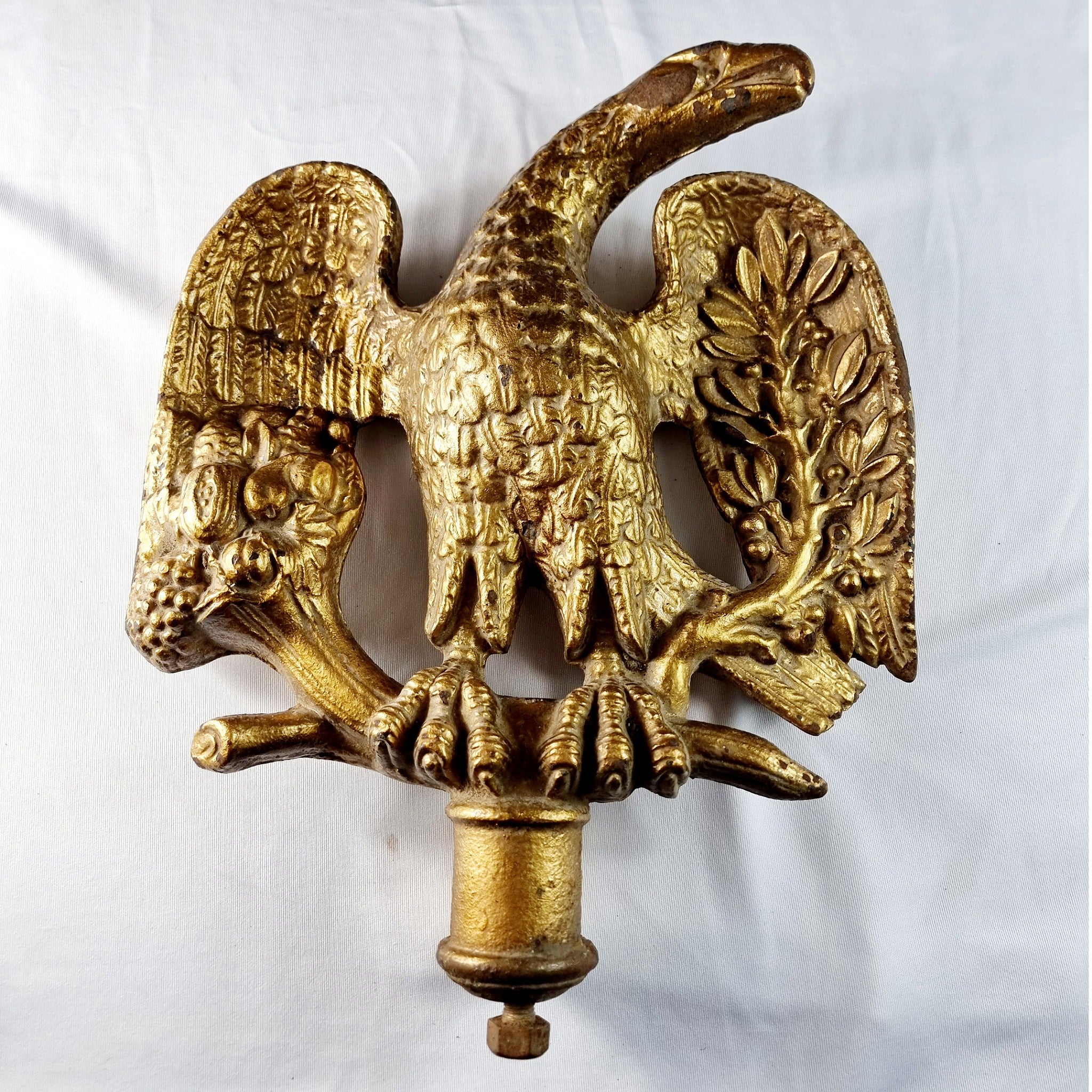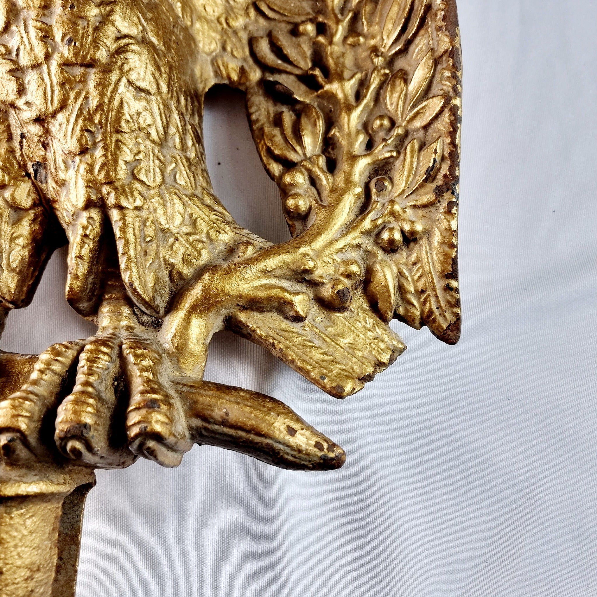 Circa 1813 A cast iron spreadwing eagle clutching a cornucopia and an olive branch in its talons in an early gilded and painted surface. The eagle was a counterweight on the Columbian Printing Press, invented by George Clymer in Philadelphia in 1813. The Columbian was a revolutionary lever-operated replacement to the old, wooden screw presses in use in the early 19th century. The eagle is highly unusual  in holding the symbols of peace and plenty instead of the more traditional quiver of arrows. The Eagle has age related wear to the gilding. With surface rust marks popping through the gilding, this does not effect the structureof the large castiron eagle. The eagle is bolted to a victorian castiron base which has been stripped down and lacquered. This counter weight is extremely heavy. For international shipping please contact for quotes. The last picture is a similar eagle Counterweight to the top of the Clymer printing press.