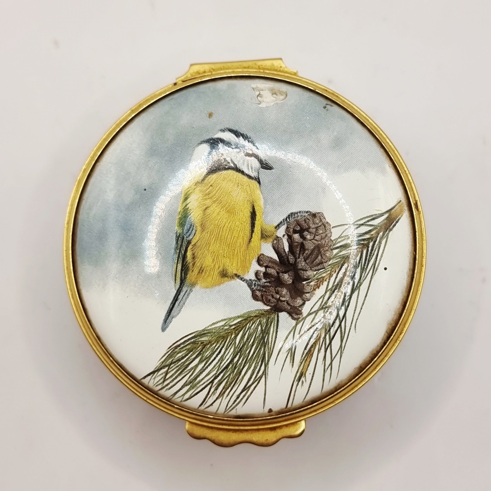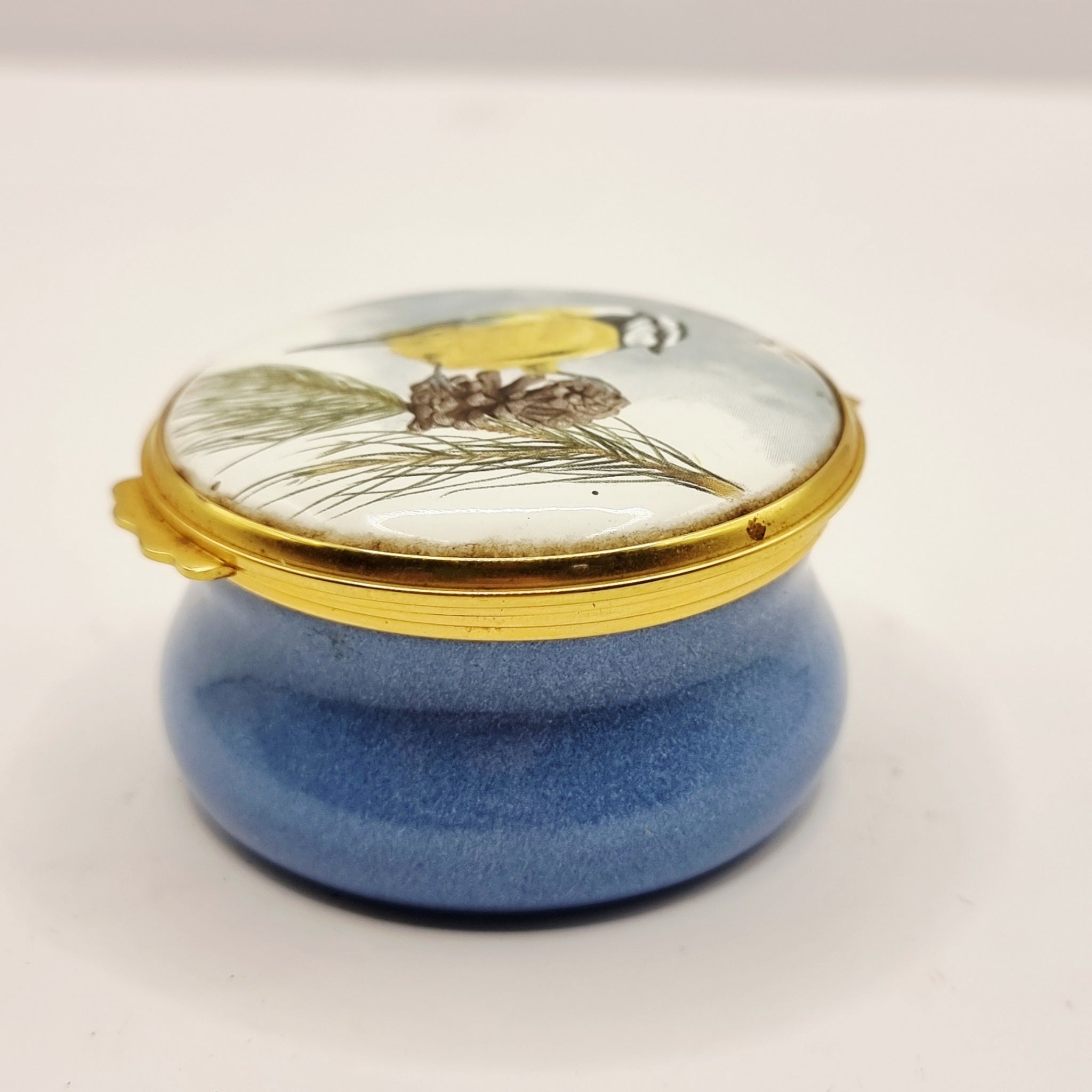 The Enamel Collection Blue Tit Trinket or Pill Box. This is a lovely looking enamel trinket box. Featuring a blue tit to the lid. The lid is loose moving opening and closing. With a chipped piece of enamel missing above the birds head. Age related markings of dirt or staining. But still a great item in its self.
