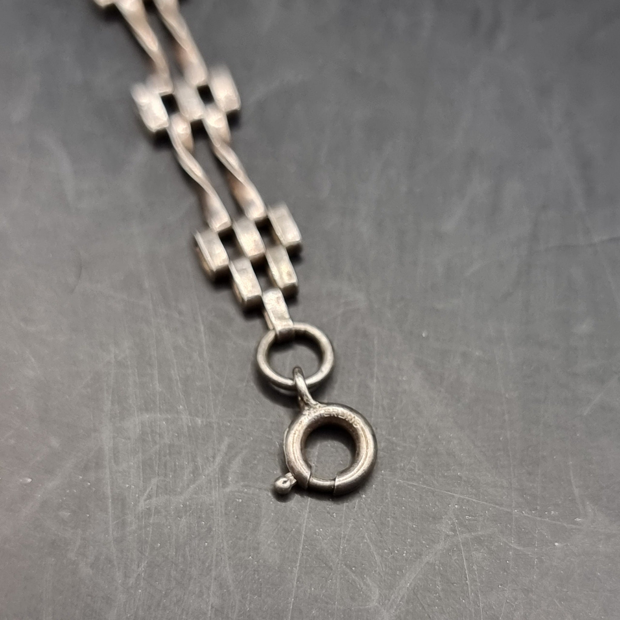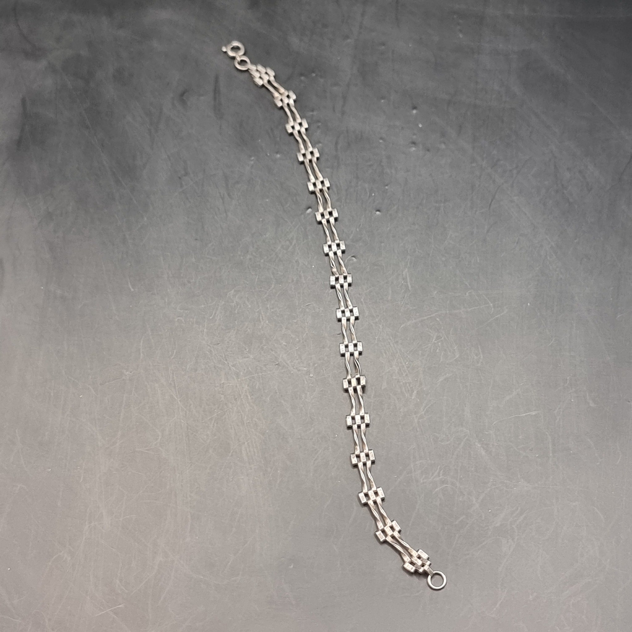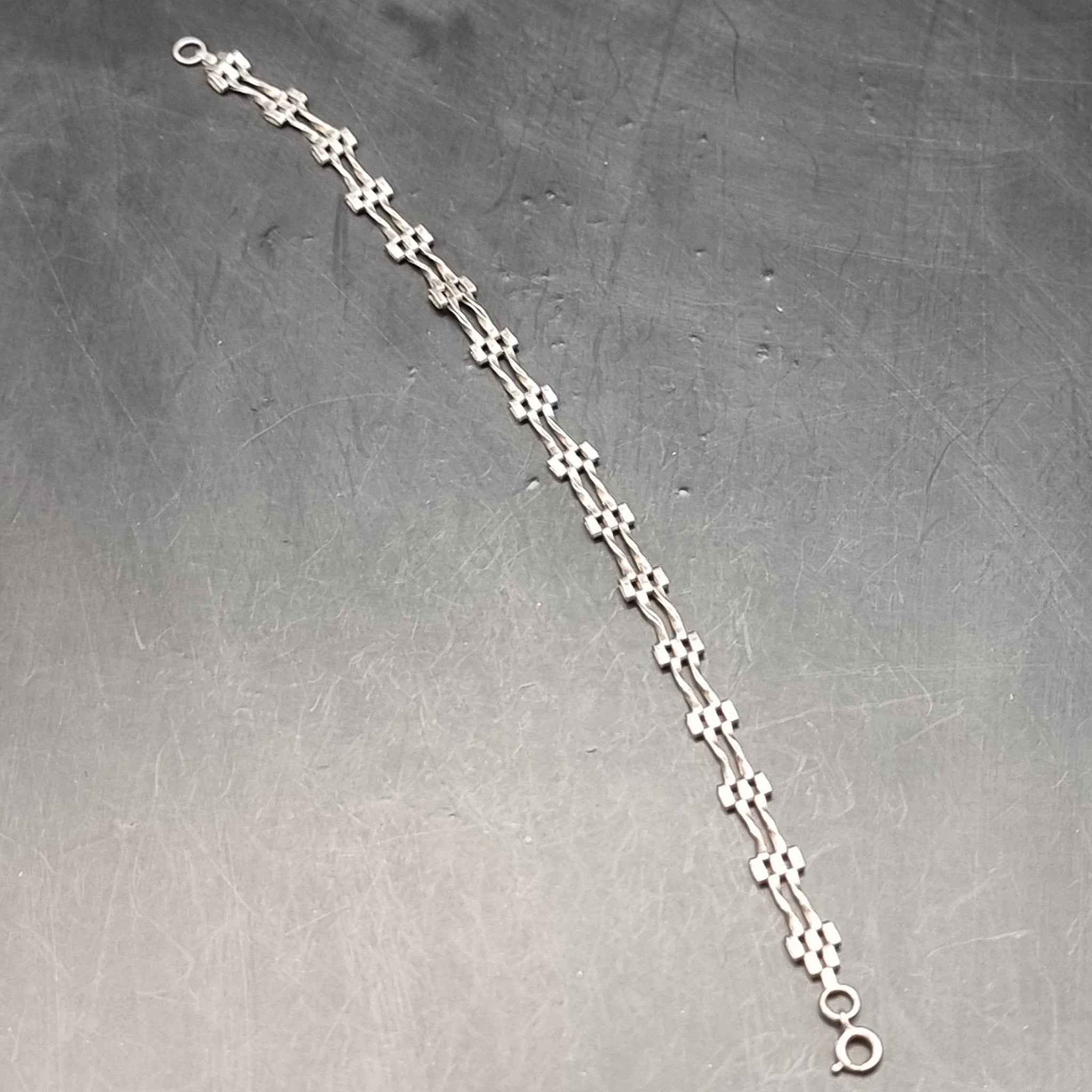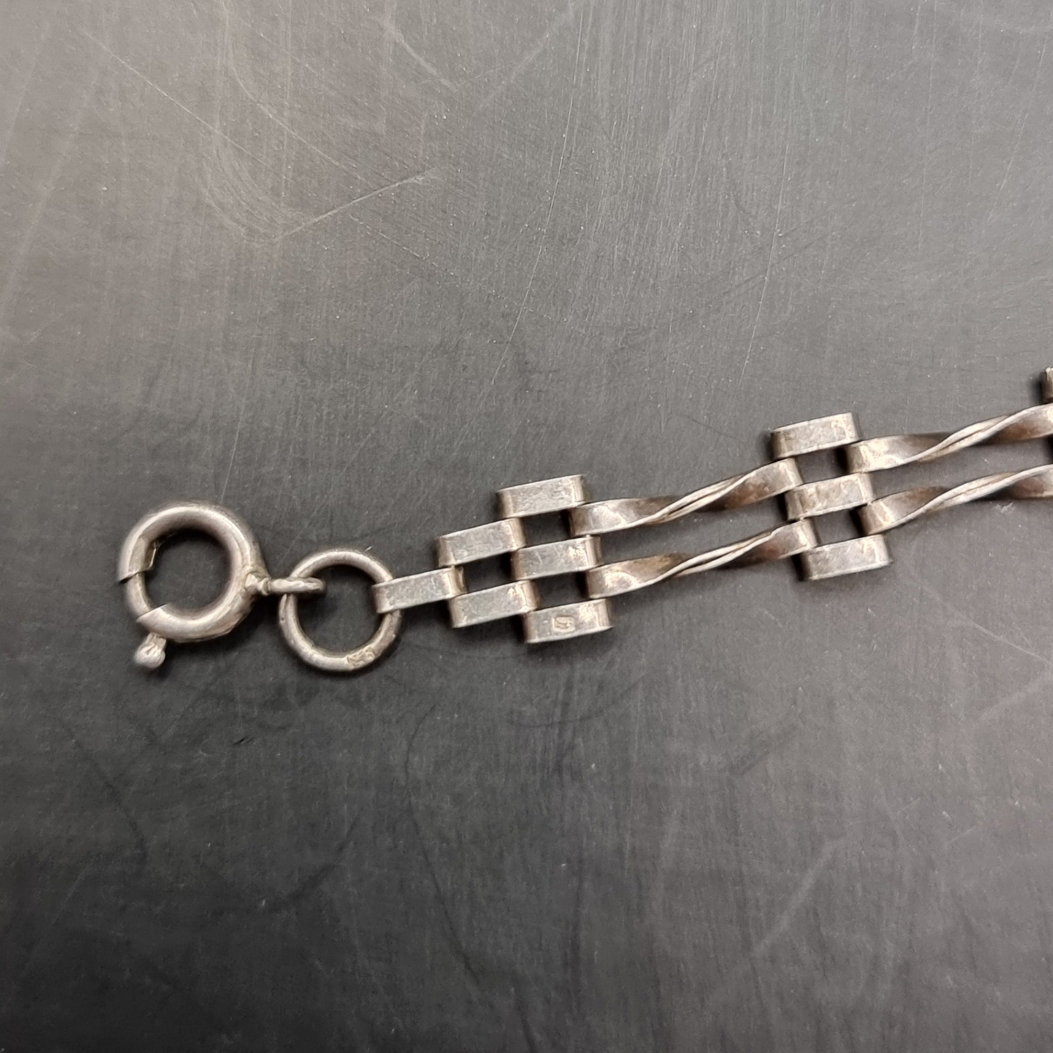 Three Silver Vintage Bracelets. One with Red Stones inserted inside the silver, the other has Love Heart Locket Padlock attached also a similar bracelet without the locket about half the thickness. They are all in used worn but good condition. Weight 28g.