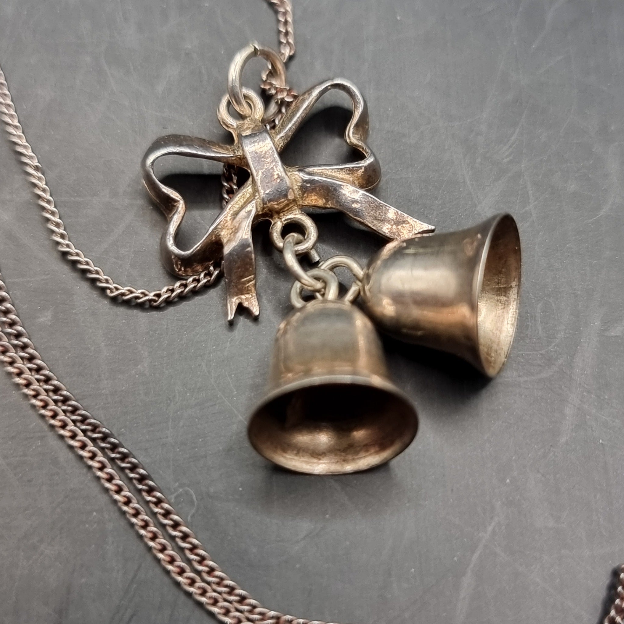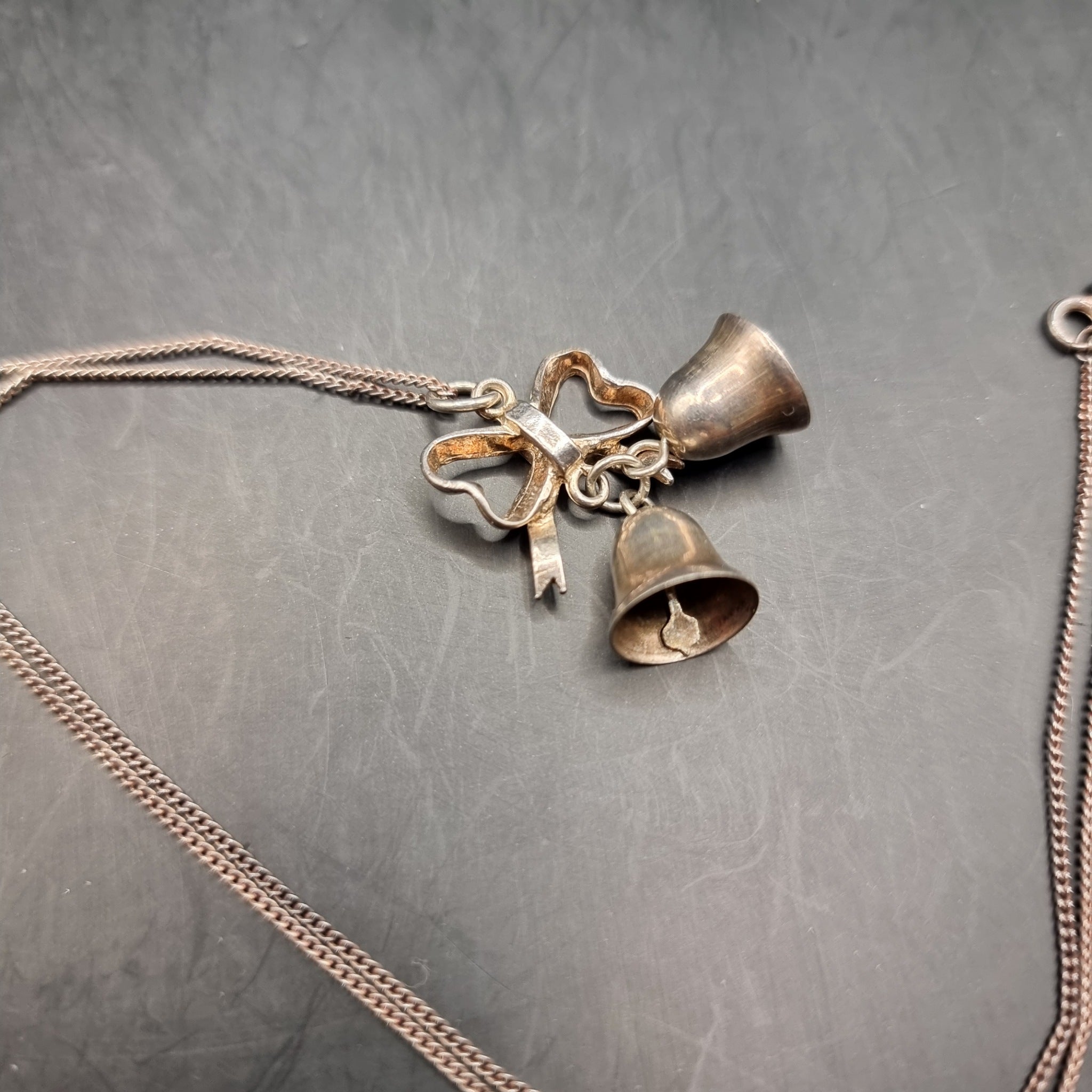 Silver necklace and white metal believed to be silver bells on bow pendant. In good condition.