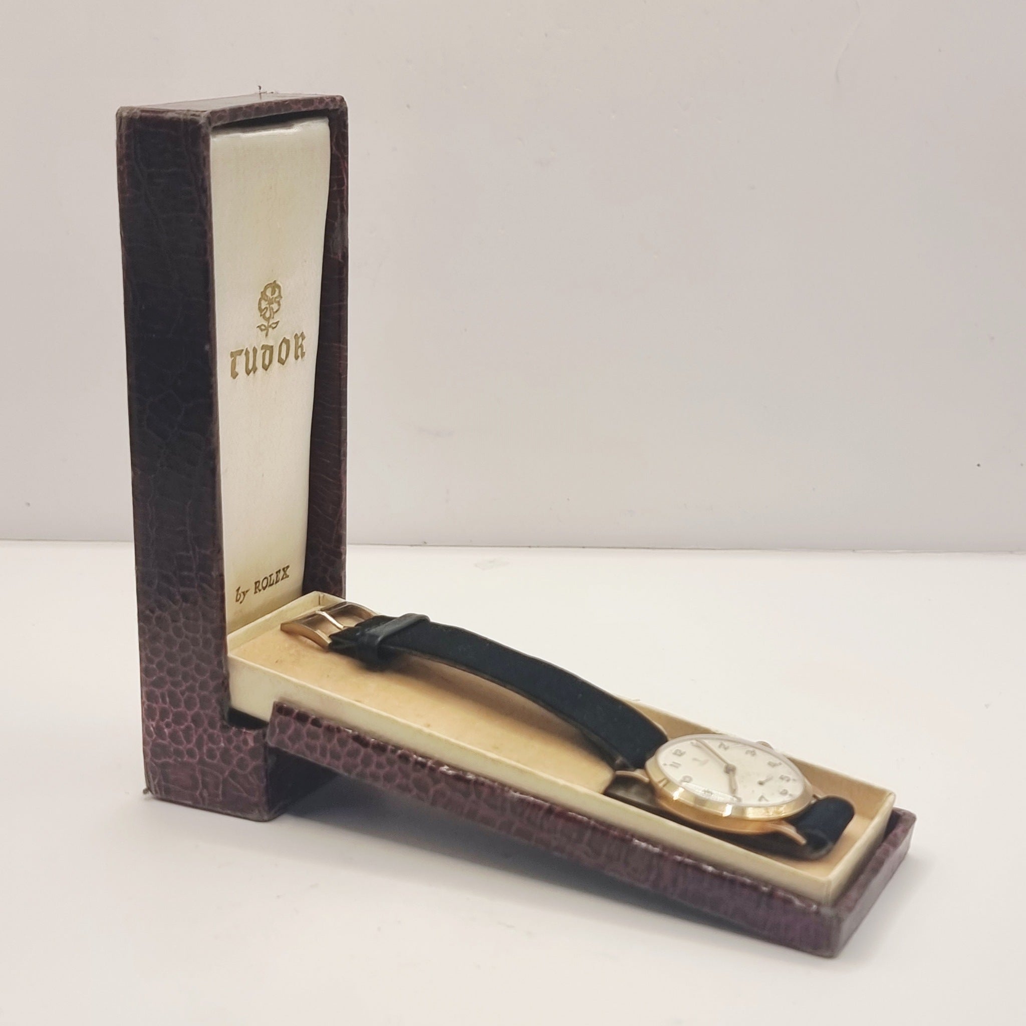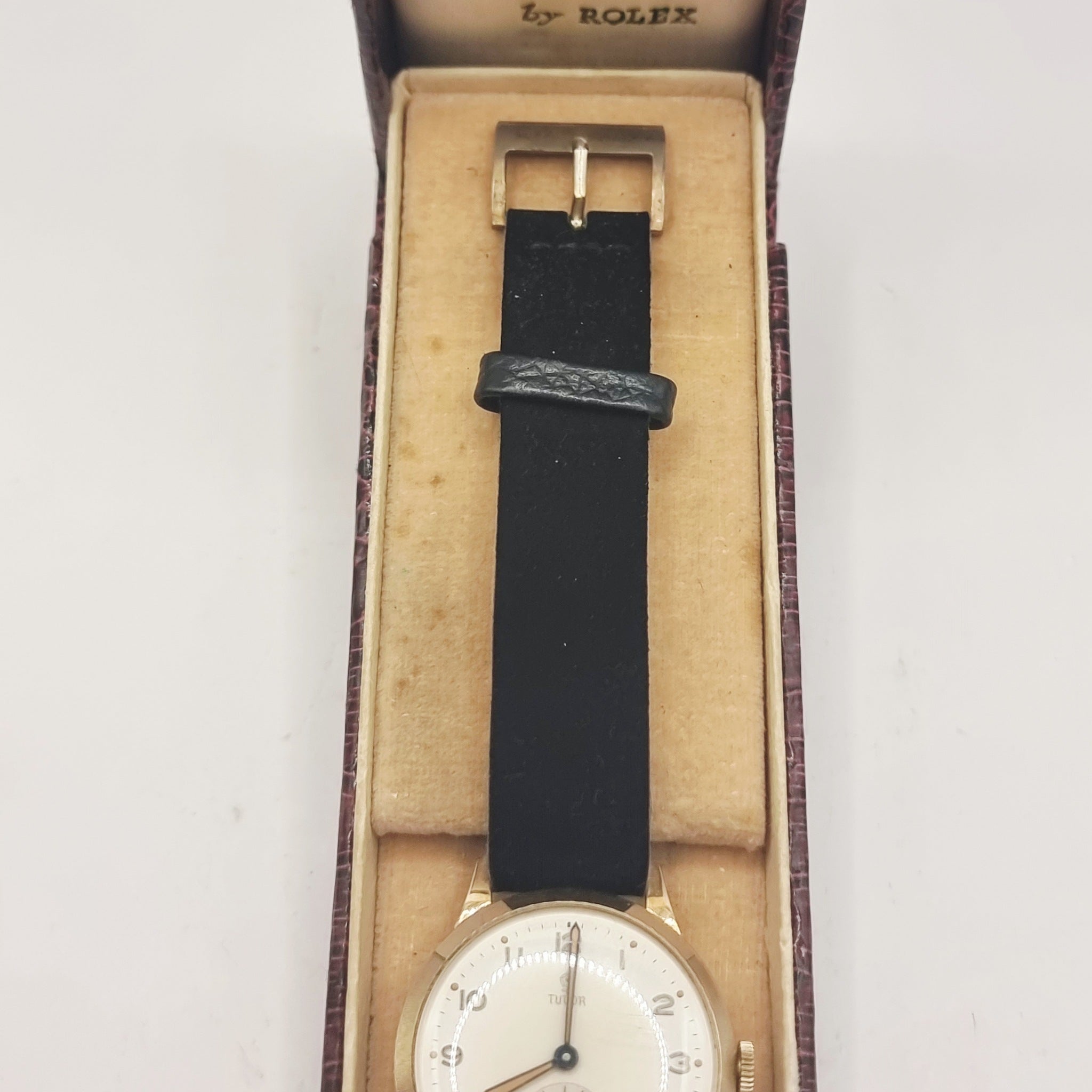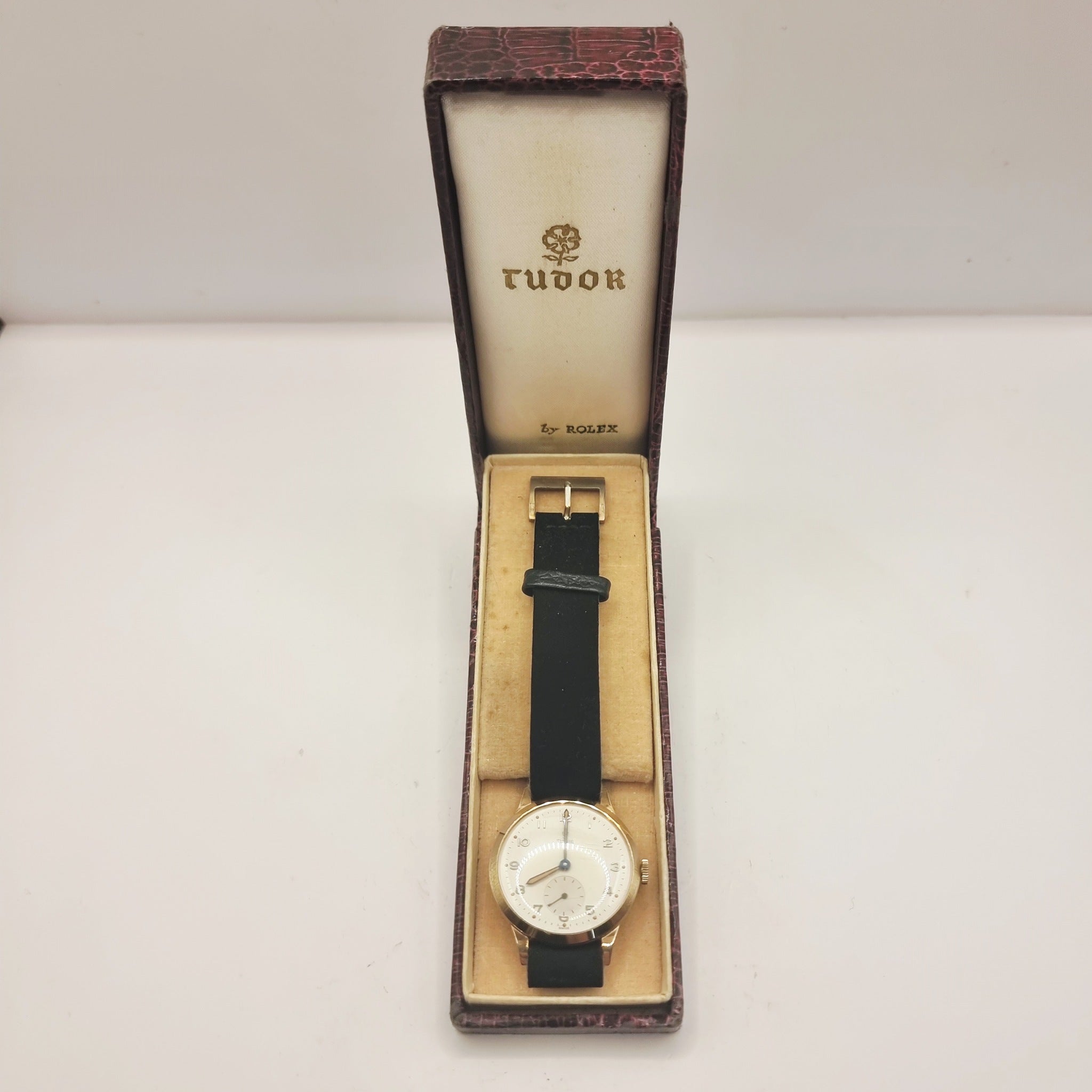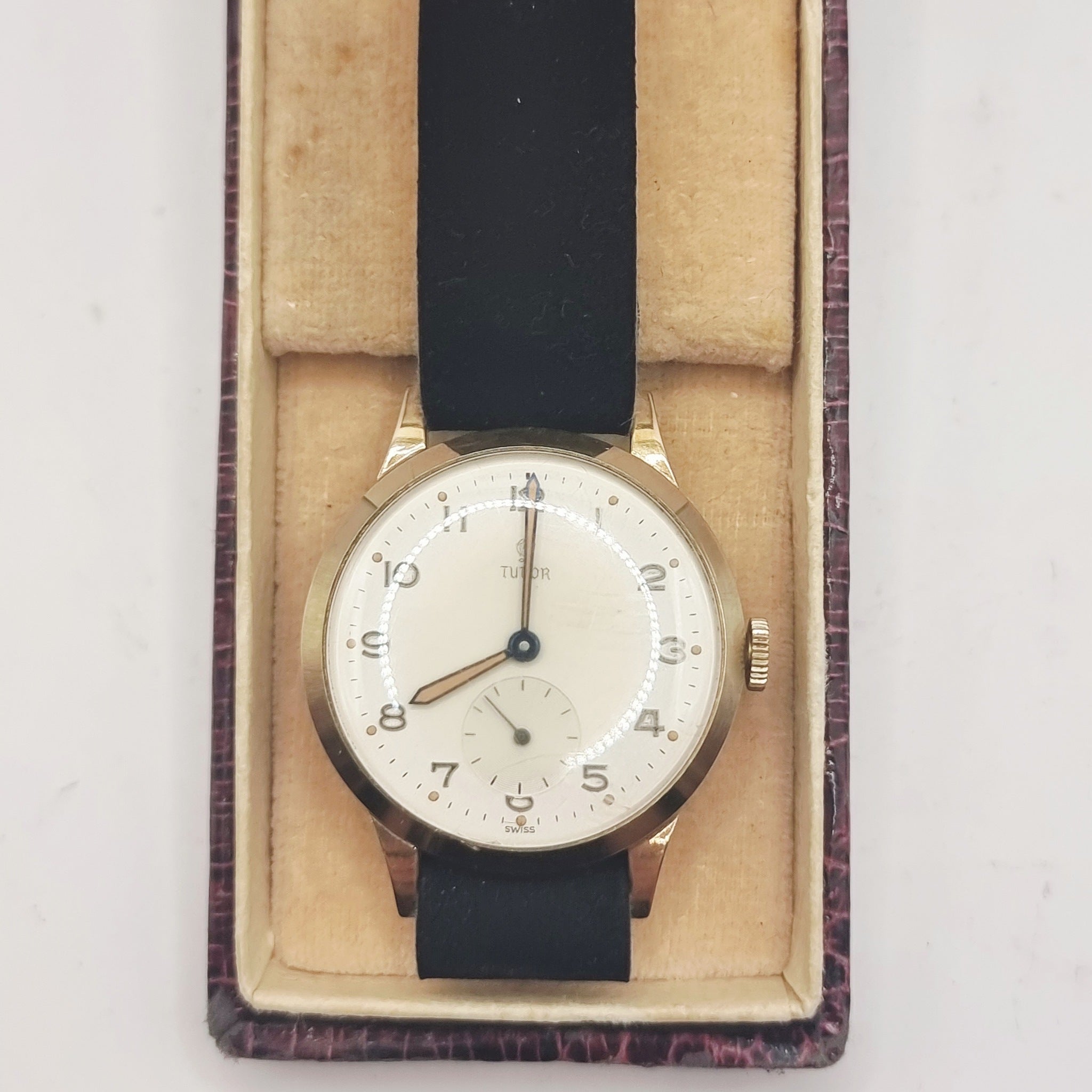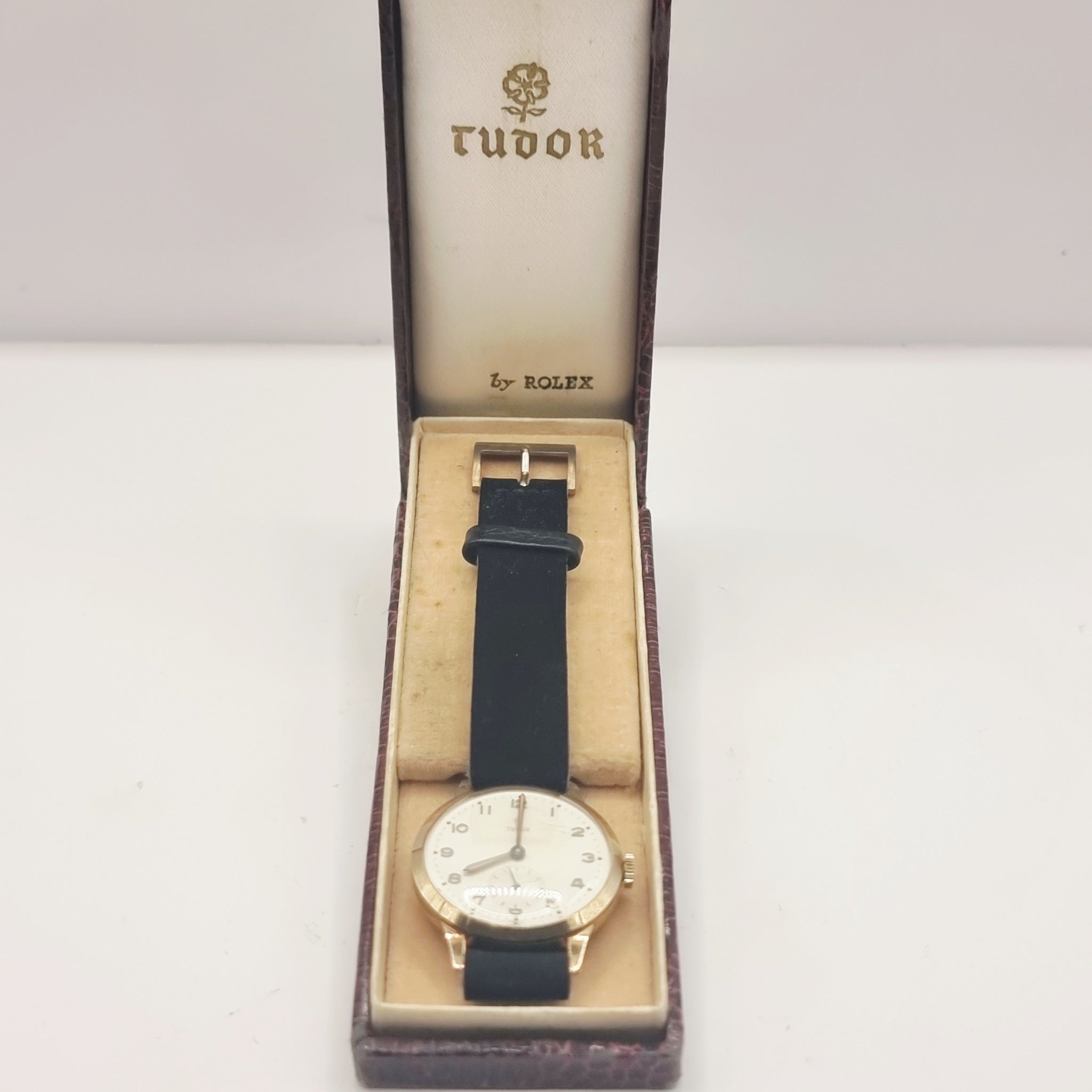 Vintage 1940/50s 9ct Gold Tudor Gents Wristwatch Self wind by Rolex. In good working order this late 1940s early 1950s yellow 9ct gold Wristwatch is housed in its original tudor hard case. The watch keeps good time. I have worn this a few times and has ket good time for me. The case has been inscribed to the back, as photographed. Scratches to the glass, very minor age related marks to the case. The watch has been fitted with a later suede strap. Fantastic watch.