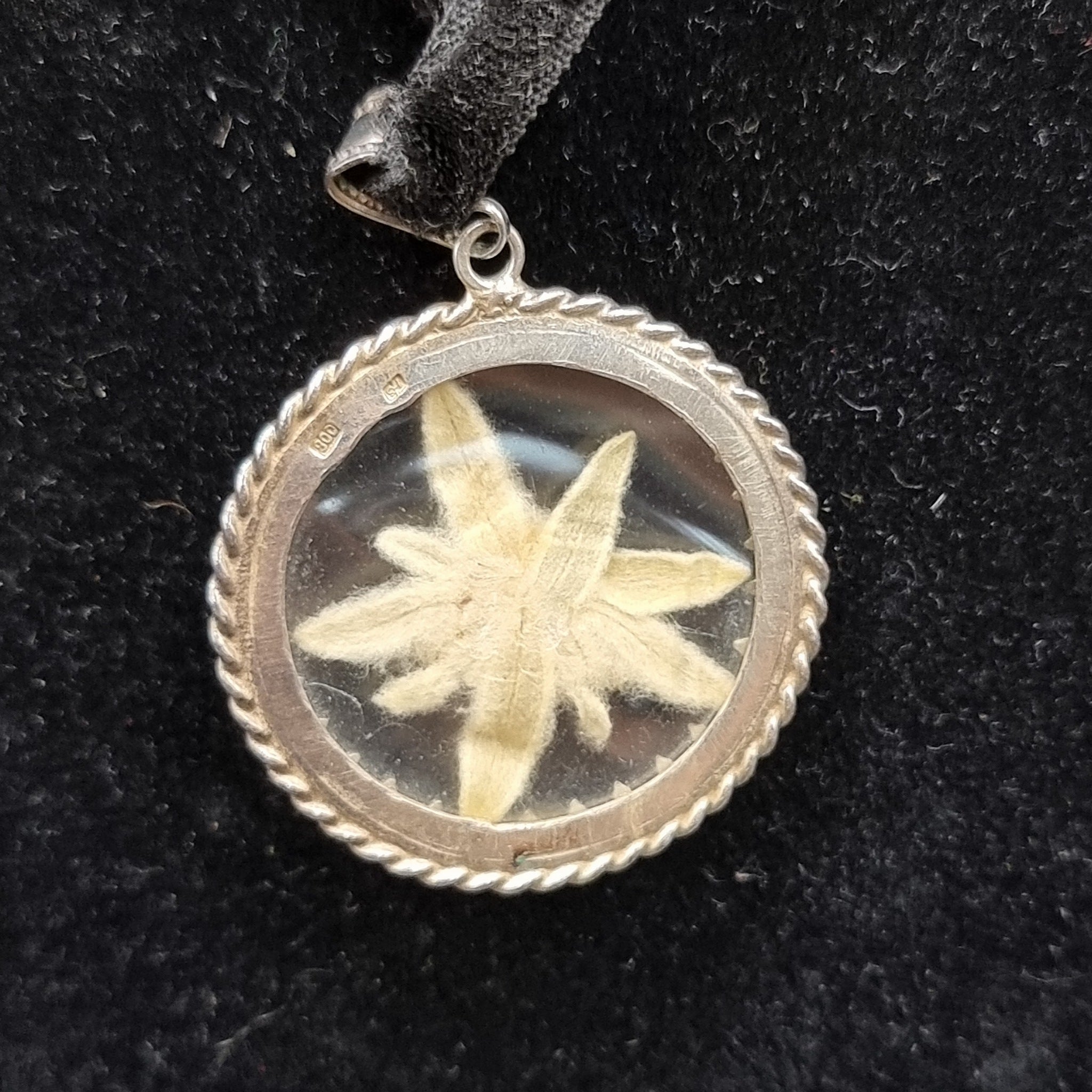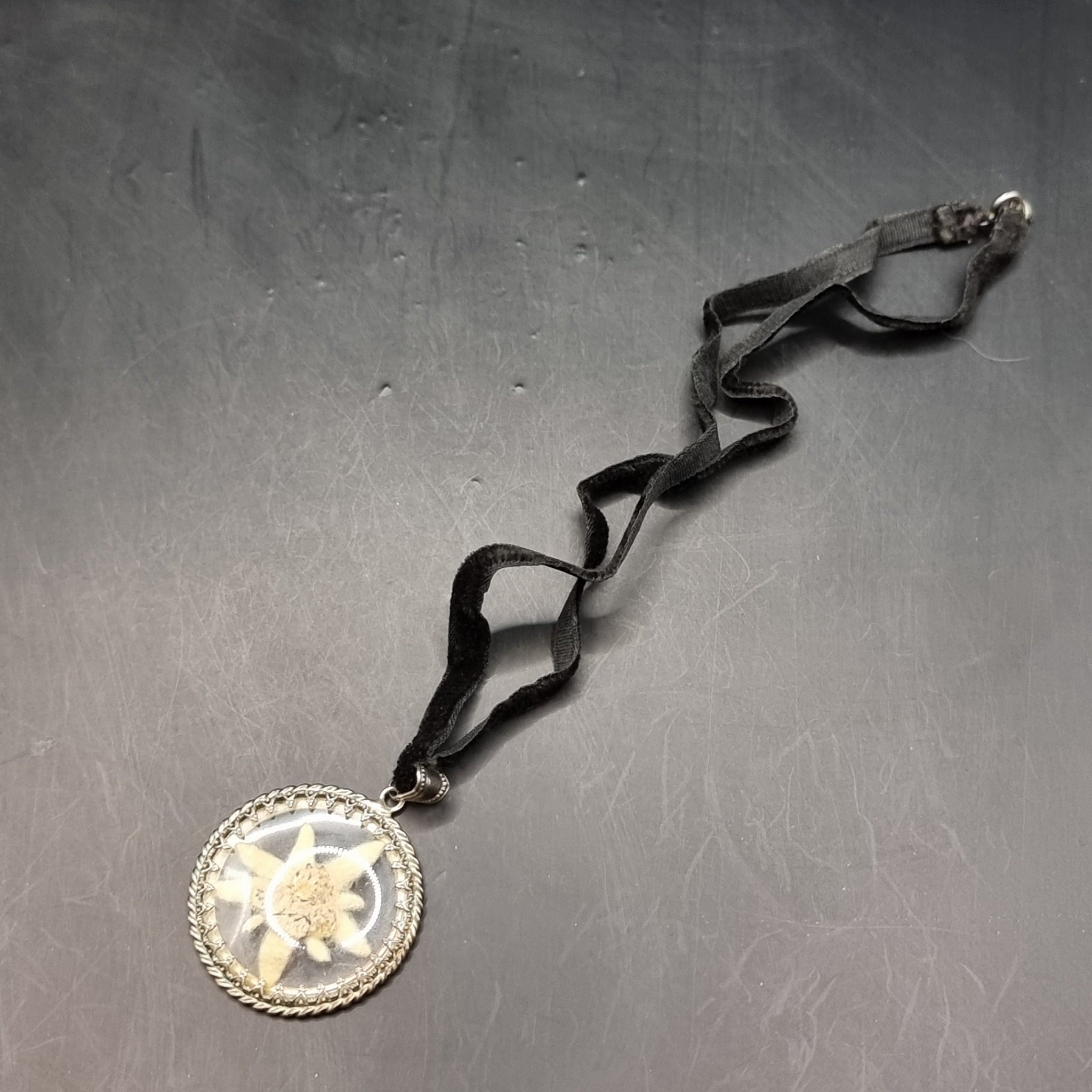 Vintage Fabric Flower in silver Frame Pendant on Velvet choker Necklace. Made out of 800/1000 grade silver. This is a lovely and unusual Pendant locket with the Fabric Flower sealed indide clear plastic, housed in a decorative Ornate silver frame.