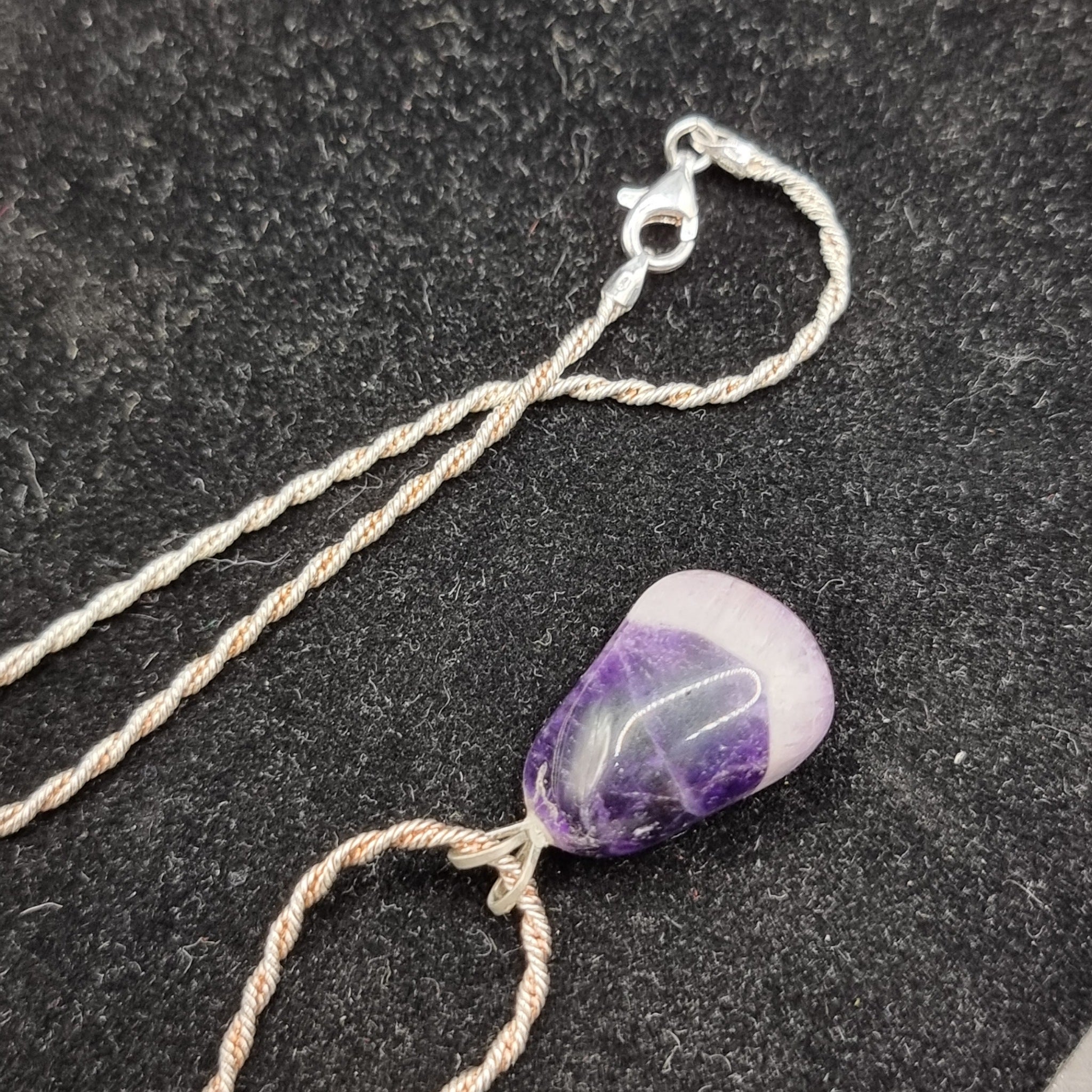 Vintage Healing Stone Polished Amethyst Pendant on Silver Rope Chain. The rope chain is very good quality and durable. The amethyst is fitted with white metal possibly silver loops to hang off a chain. All in lovely condition. Chain Weighs 7.6g.