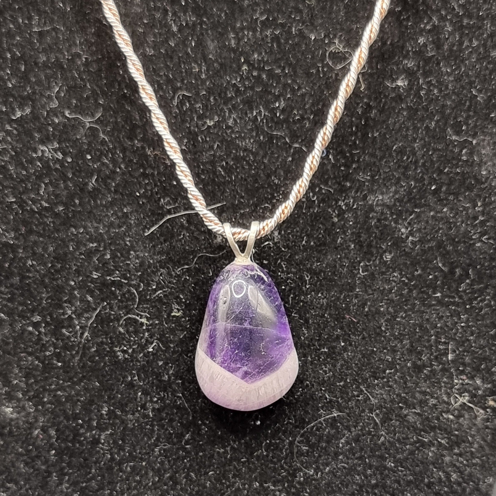 Vintage Healing Stone Polished Amethyst Pendant on Silver Rope Chain